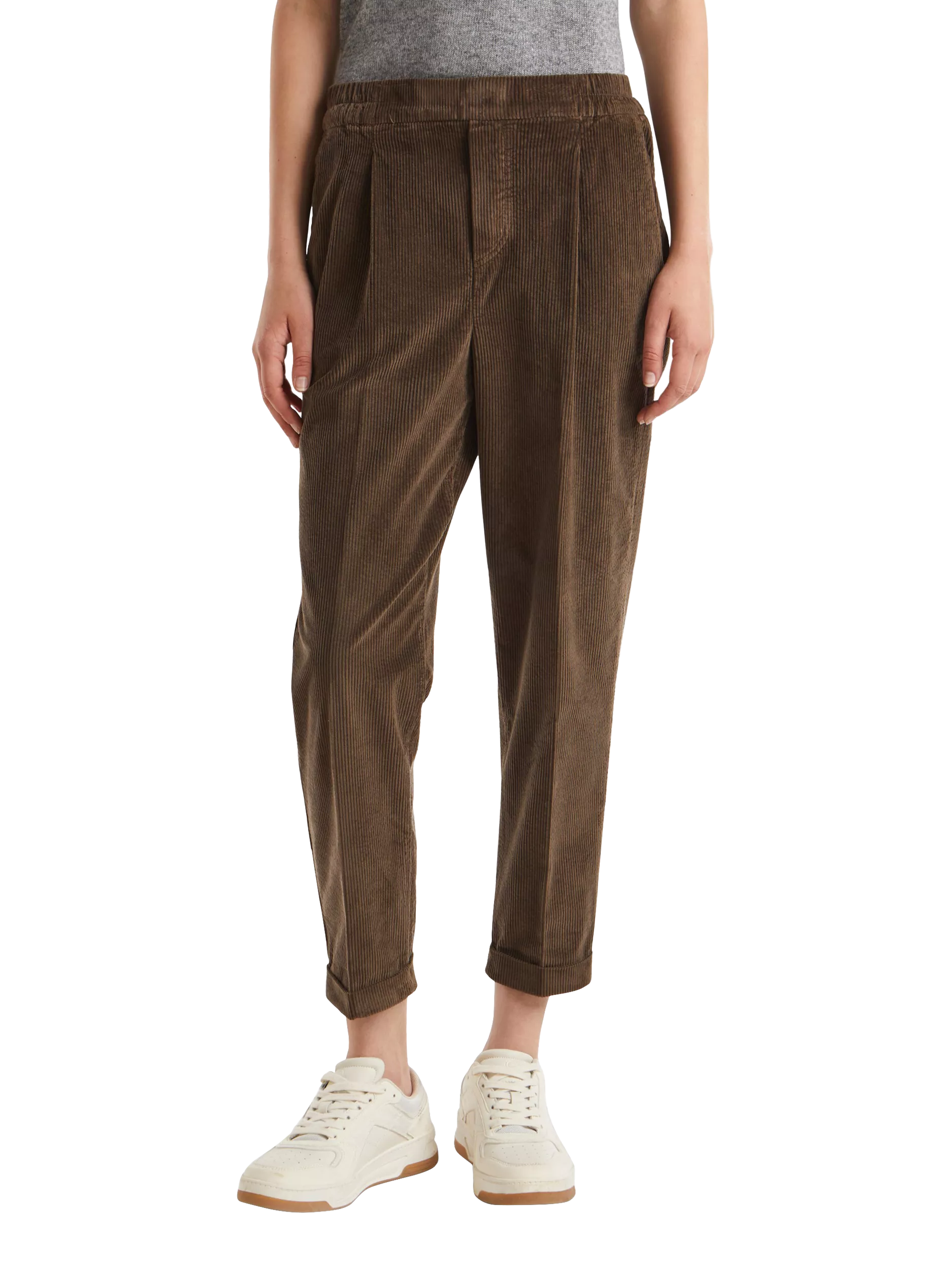 A pair of tapered corduroy trousers by Benetton with a cotton blended base. They are designed to sit mid rise with an elasticated waist and a neatly cropped length.