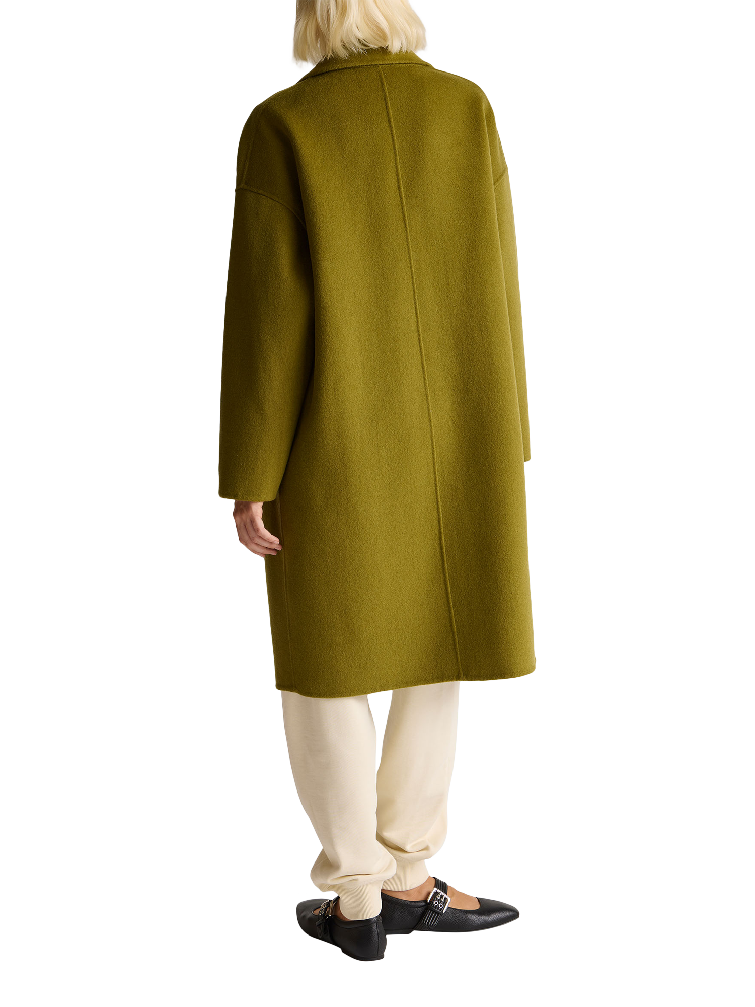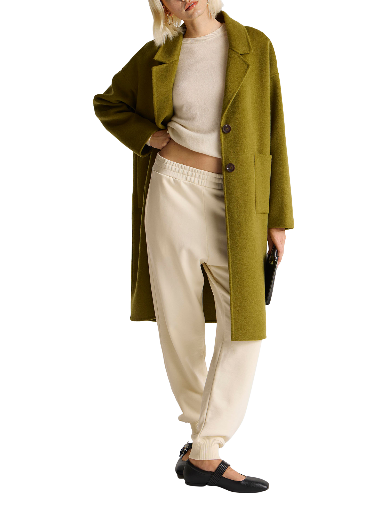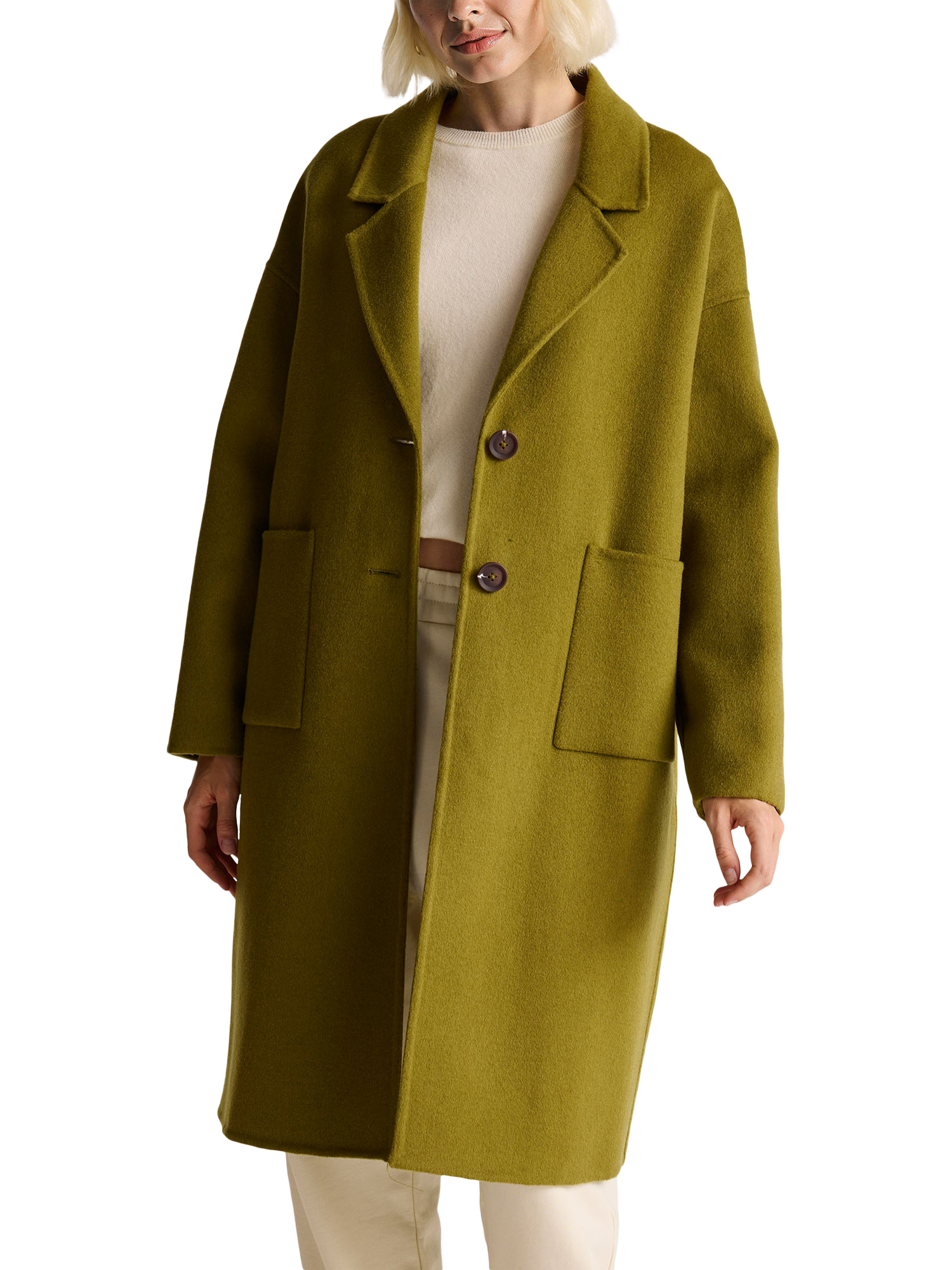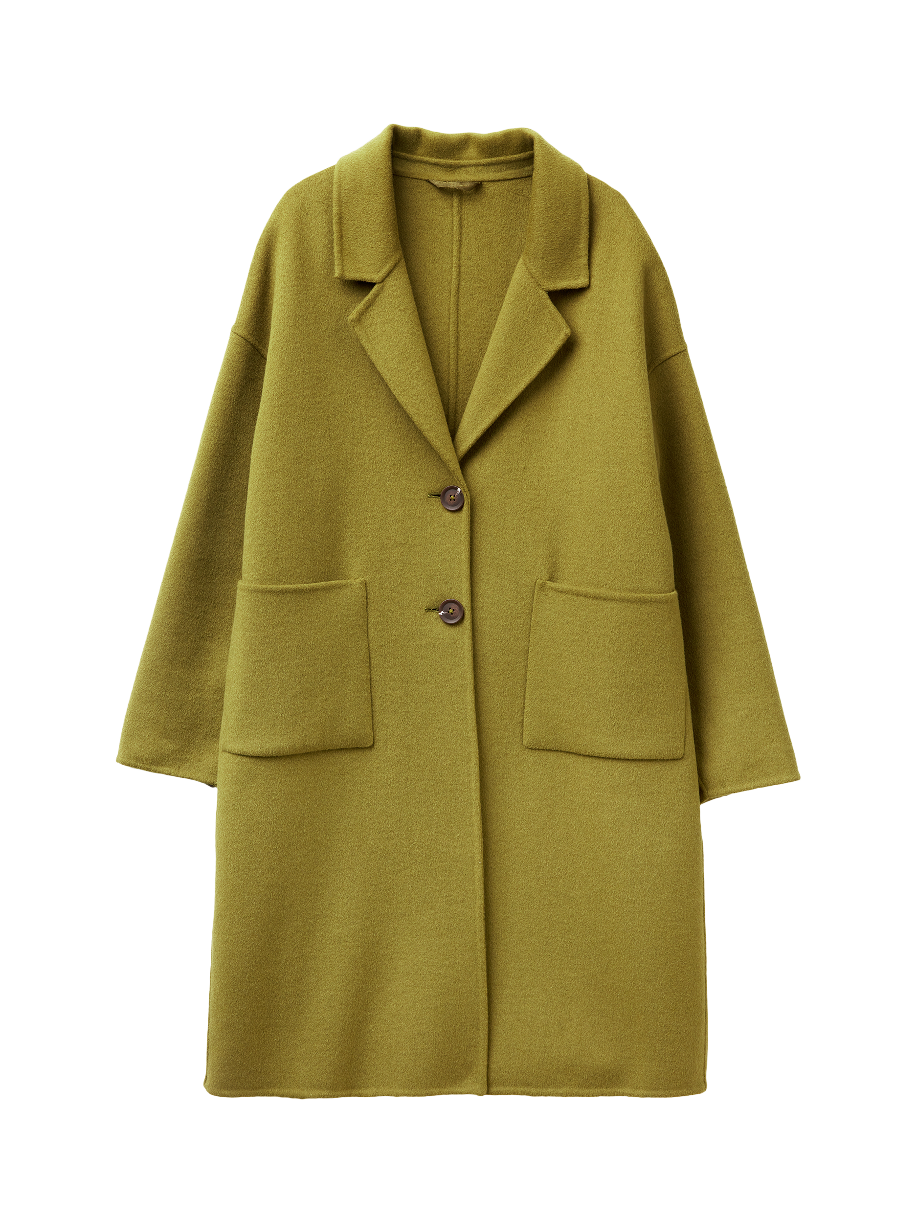 A Benetton longline overcoat, designed for daywear comfort and warmth in a soft blend imbued with wool. With a relaxed fit, V-neck, stylish dropped shoulders, a revere collar, and convenient patch pockets. Perfect for autumn and winter styling.