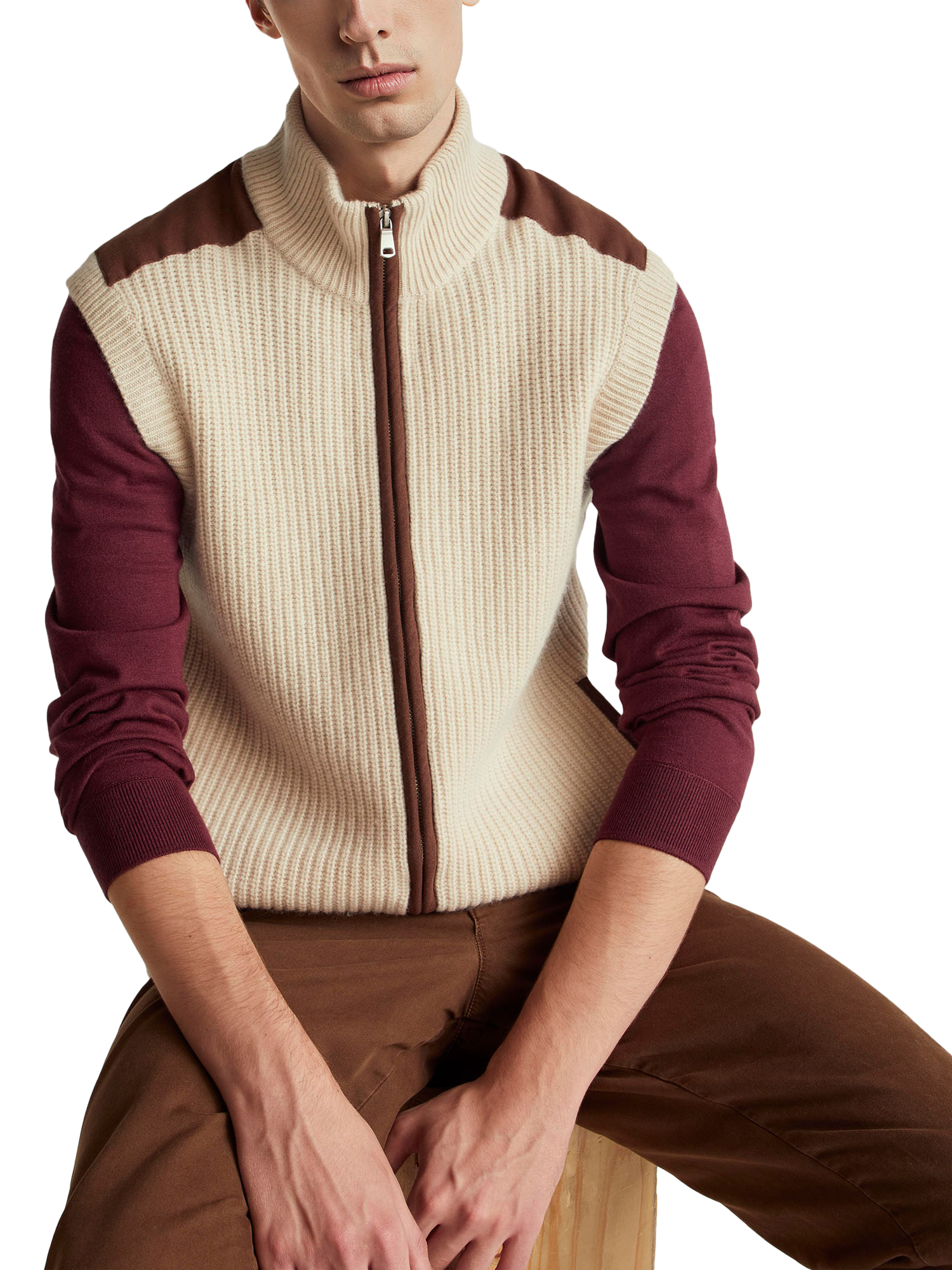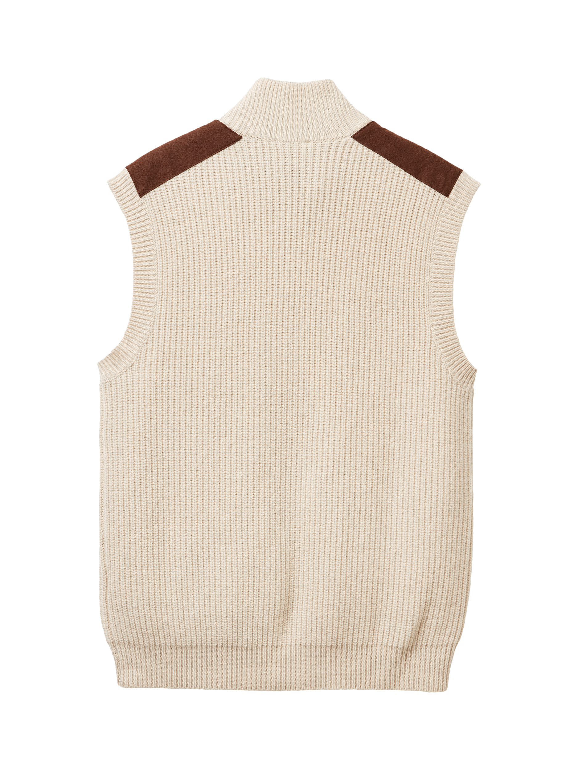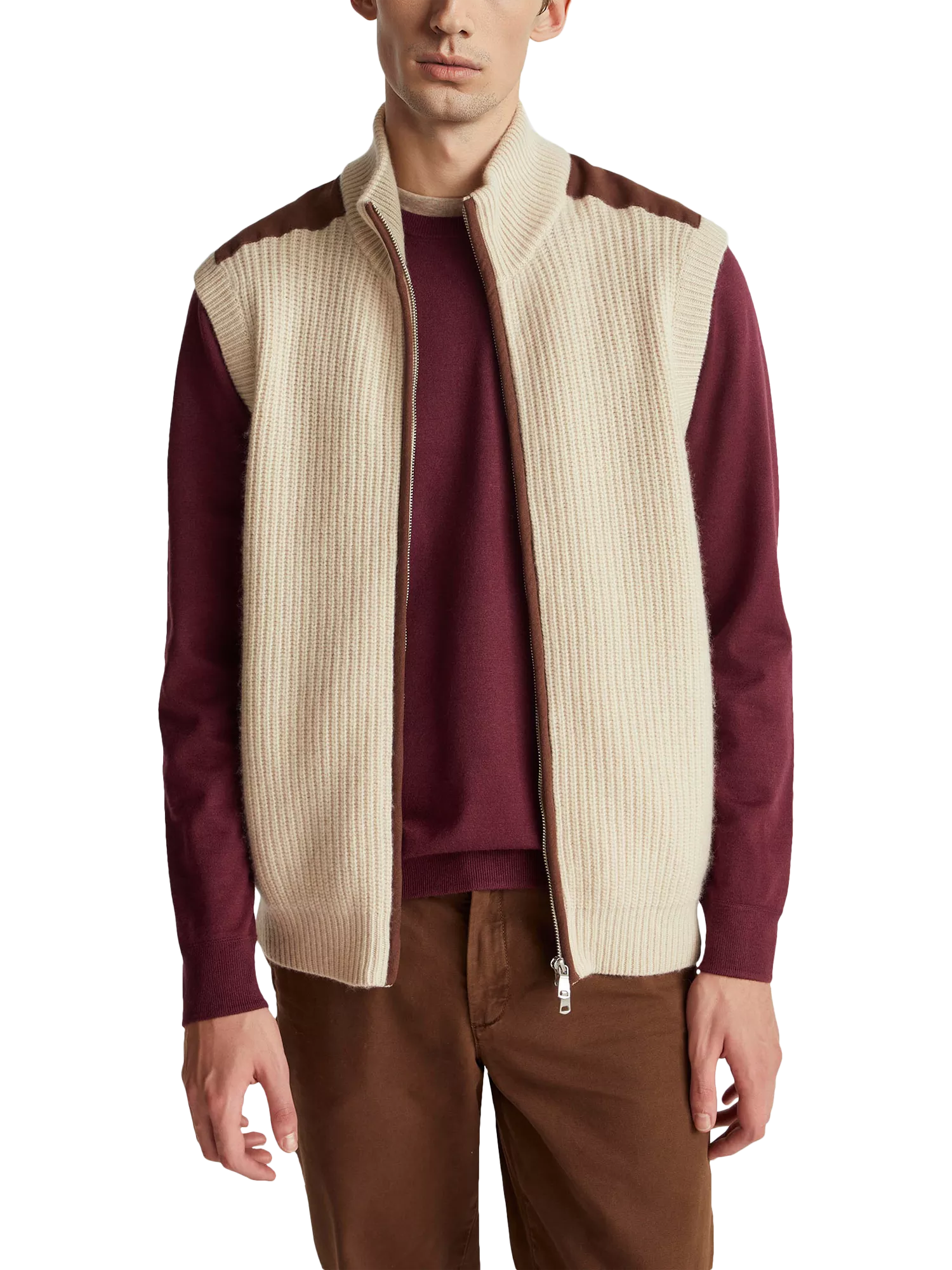 This stylish zipped vest offers a regular fit with half-cardigan stitch and ribbed edges, complemented by suede-effect detailing and a contrast color inner collar.