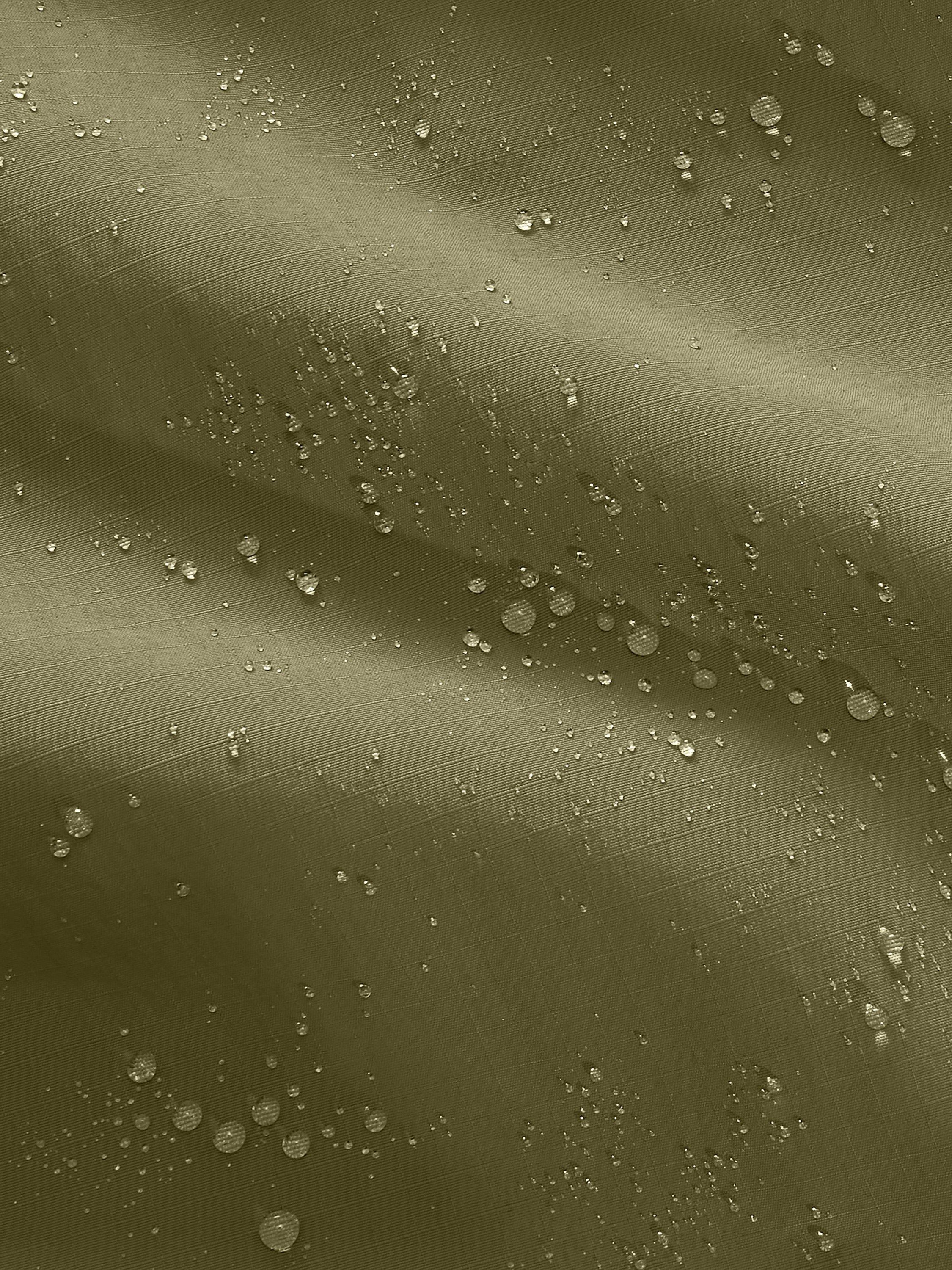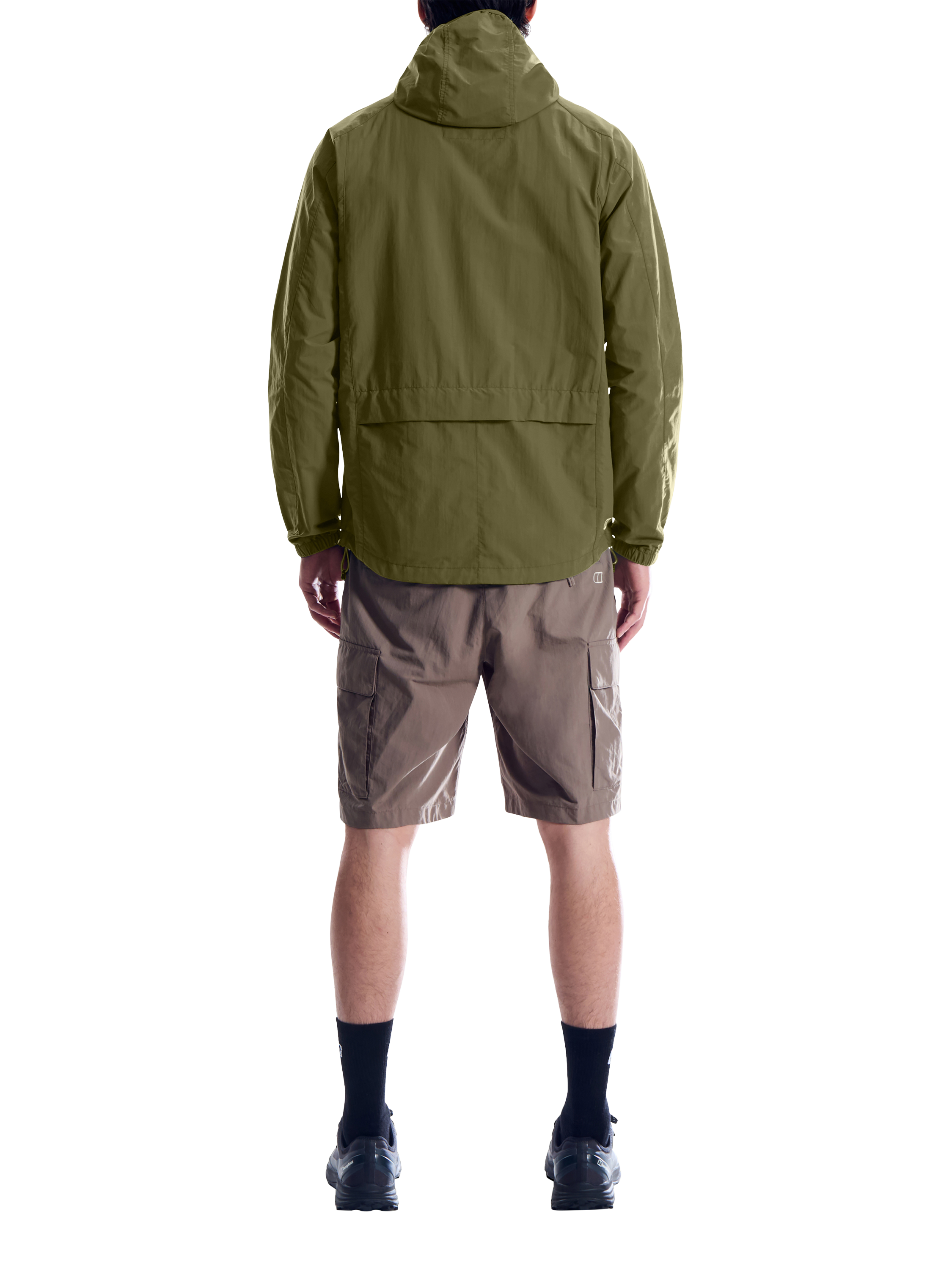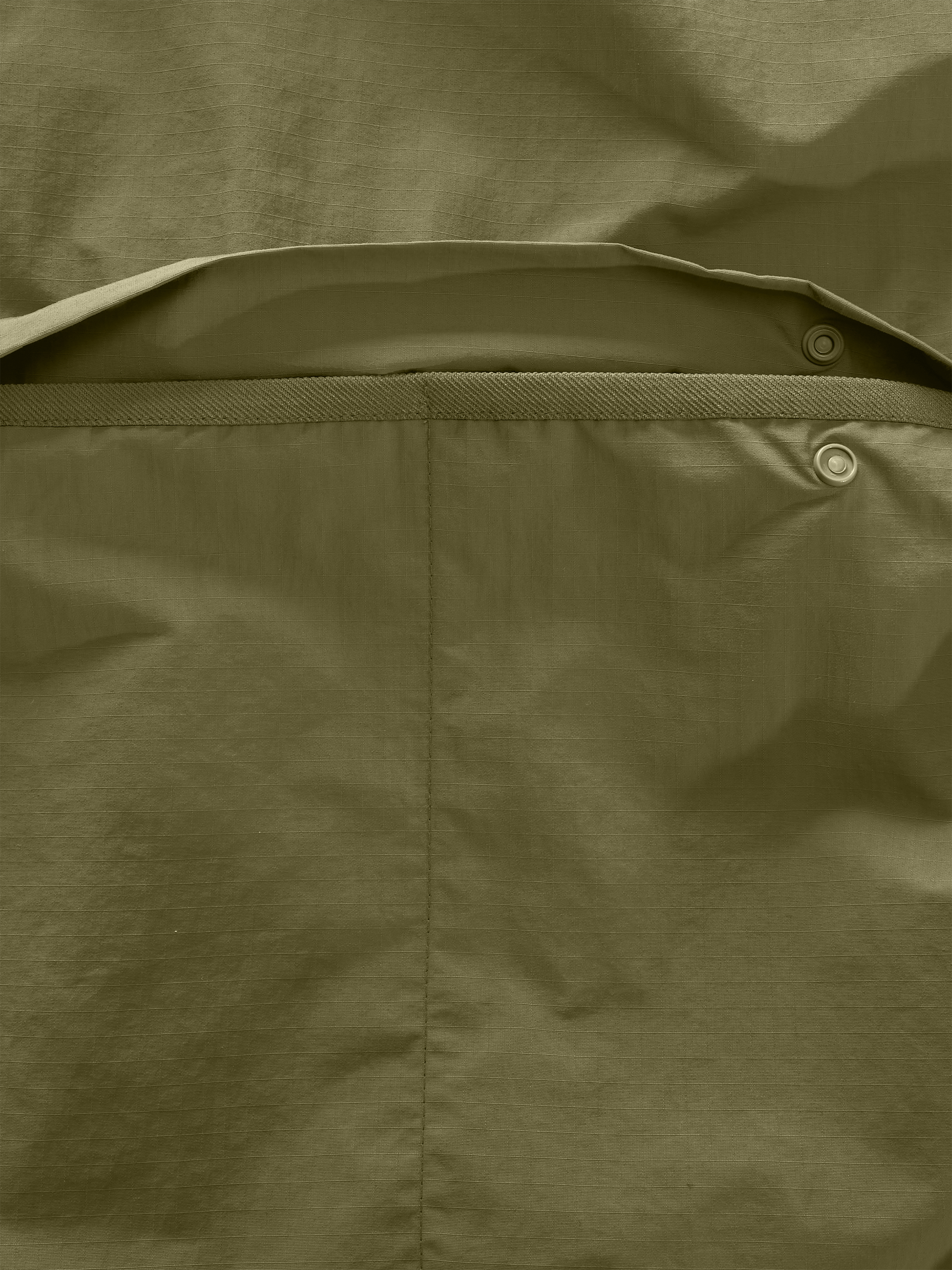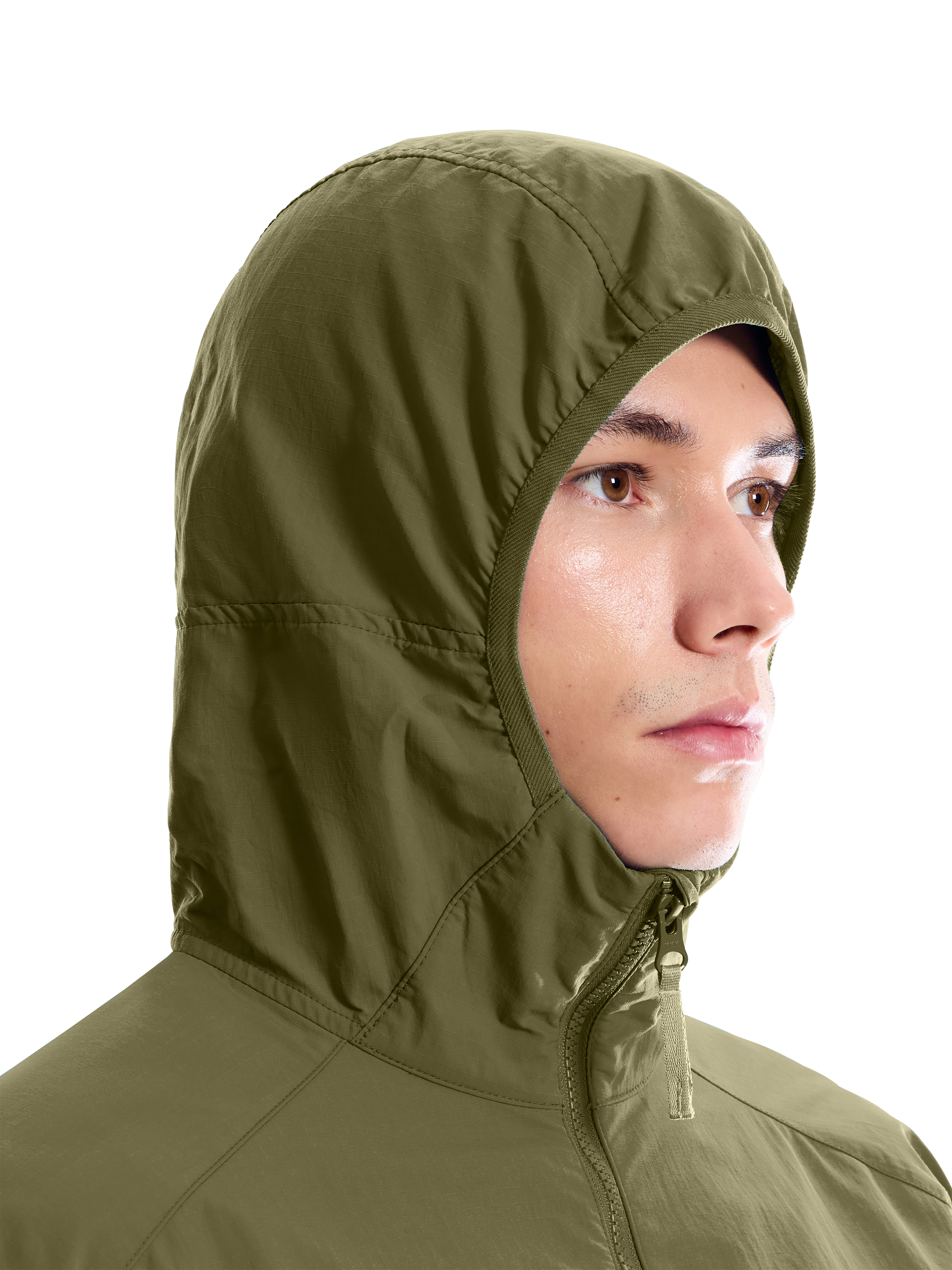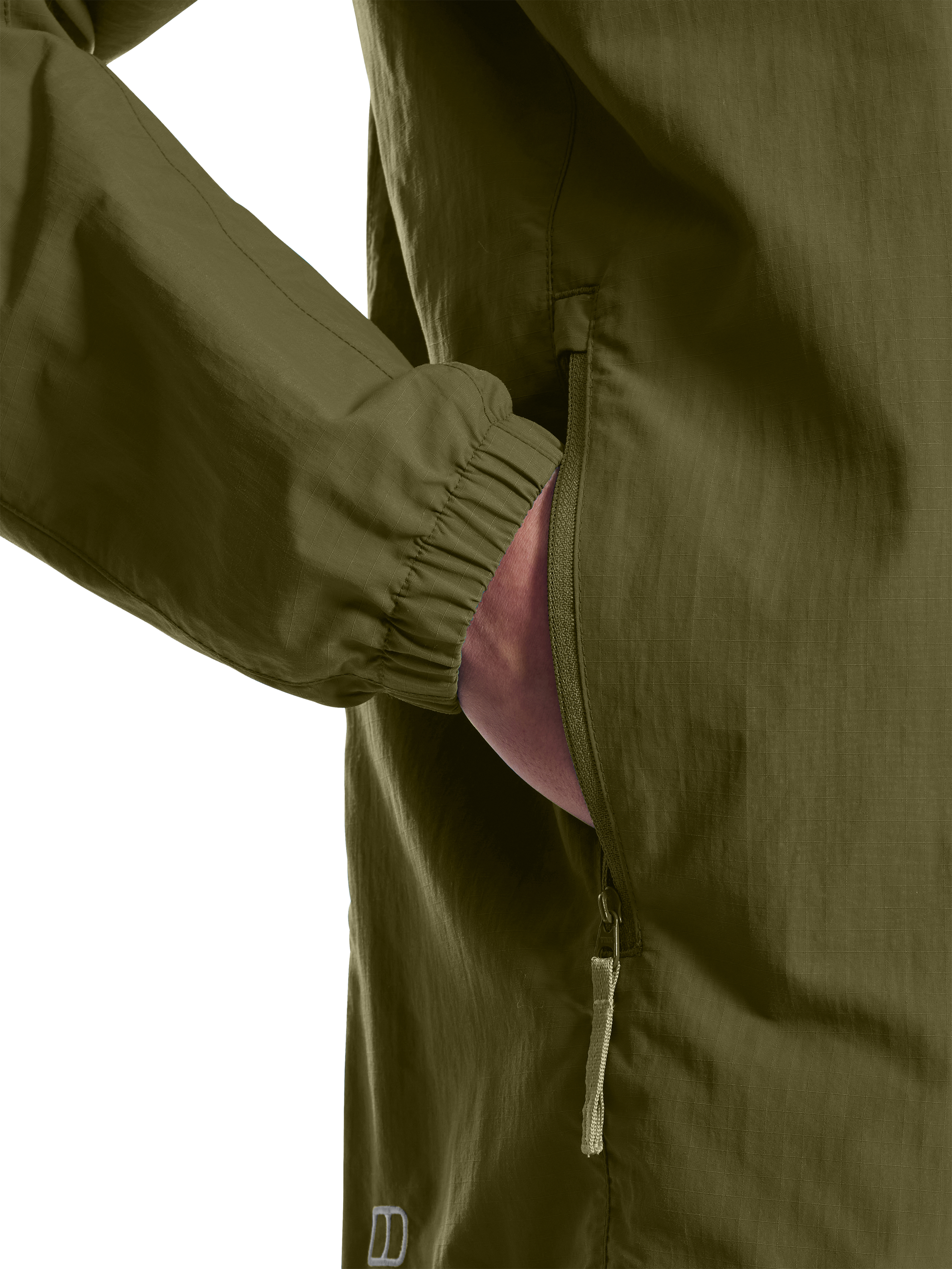 This jacket packs into a zipped back pocket pouch and has a hanging loop for easy, minimal-sized transport.
