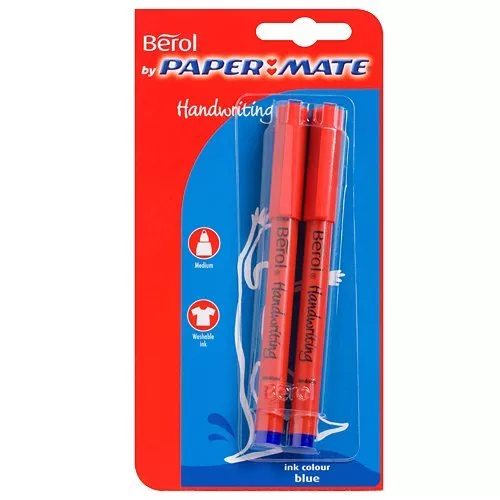 Pack of 2 rollerball pens for smooth, flowing handwriting. Medium point. Blue, washable ink.