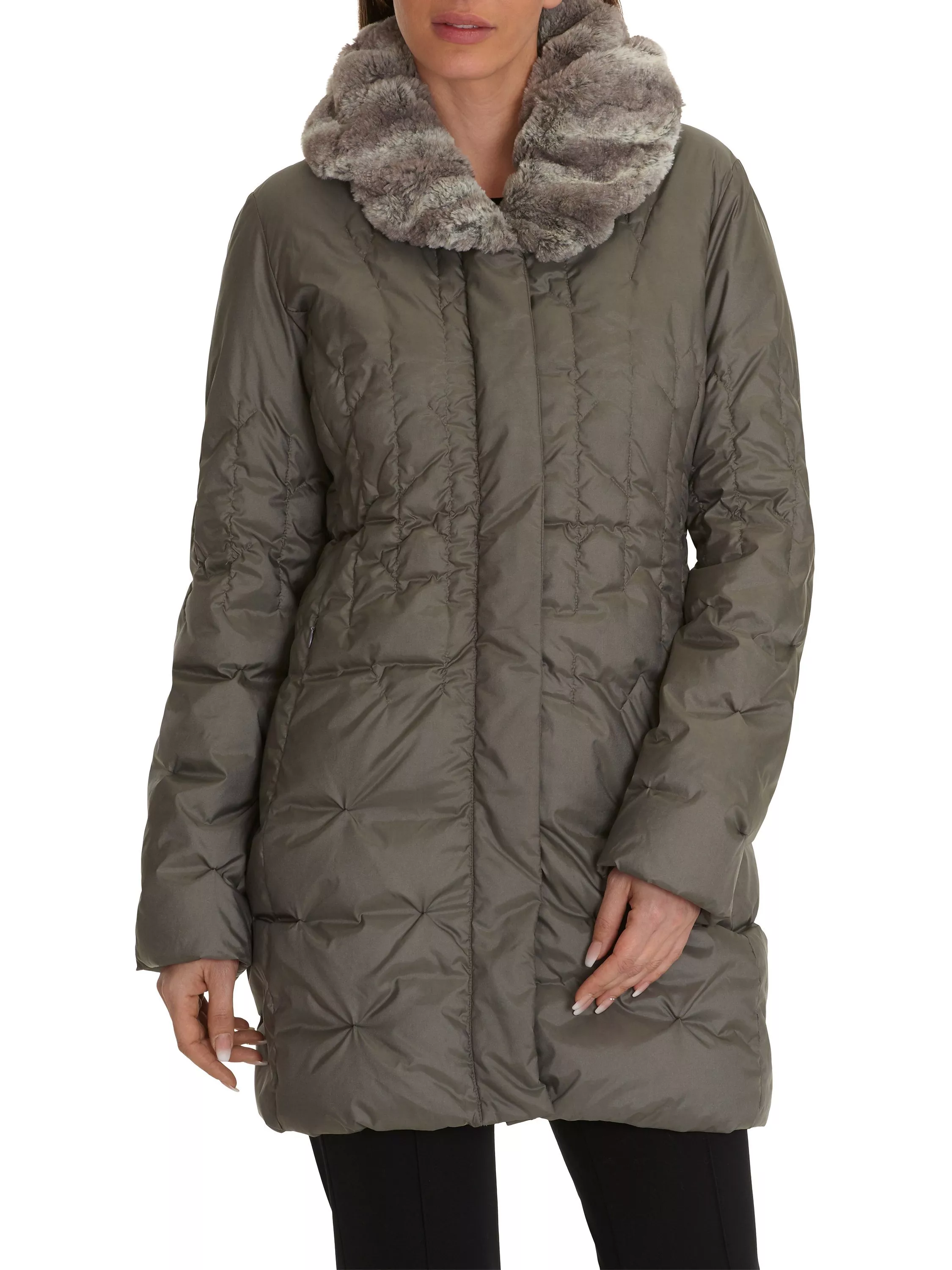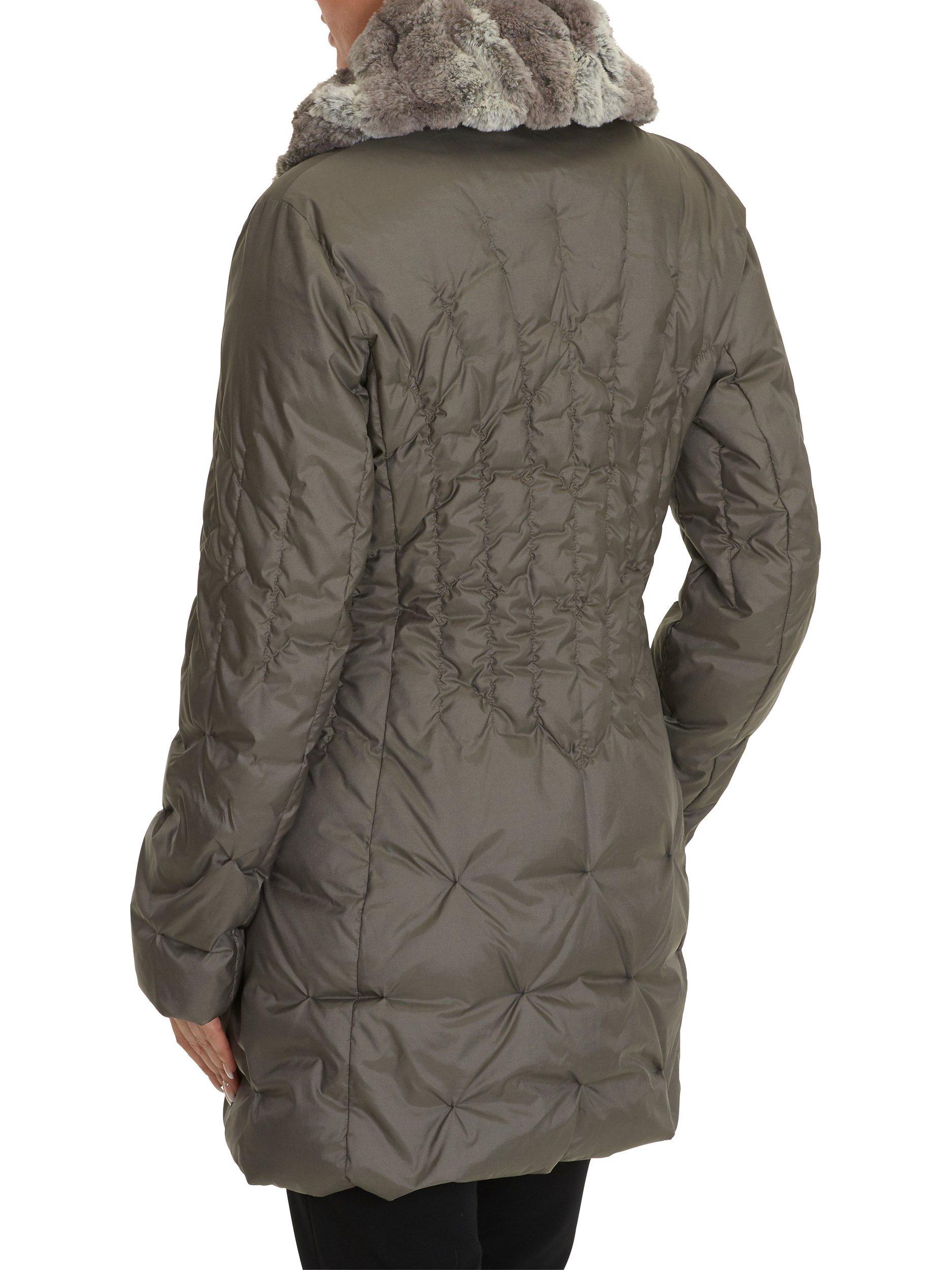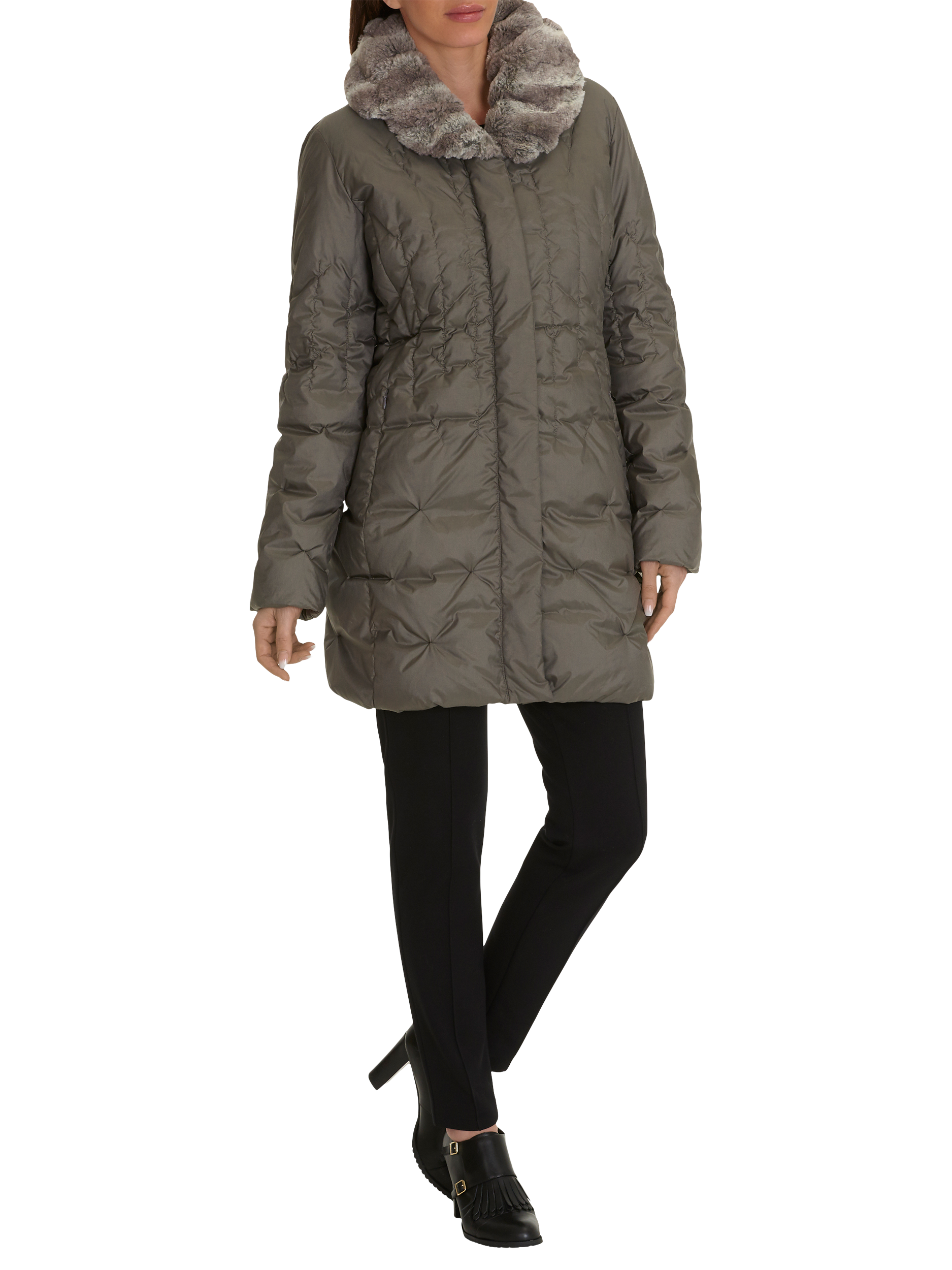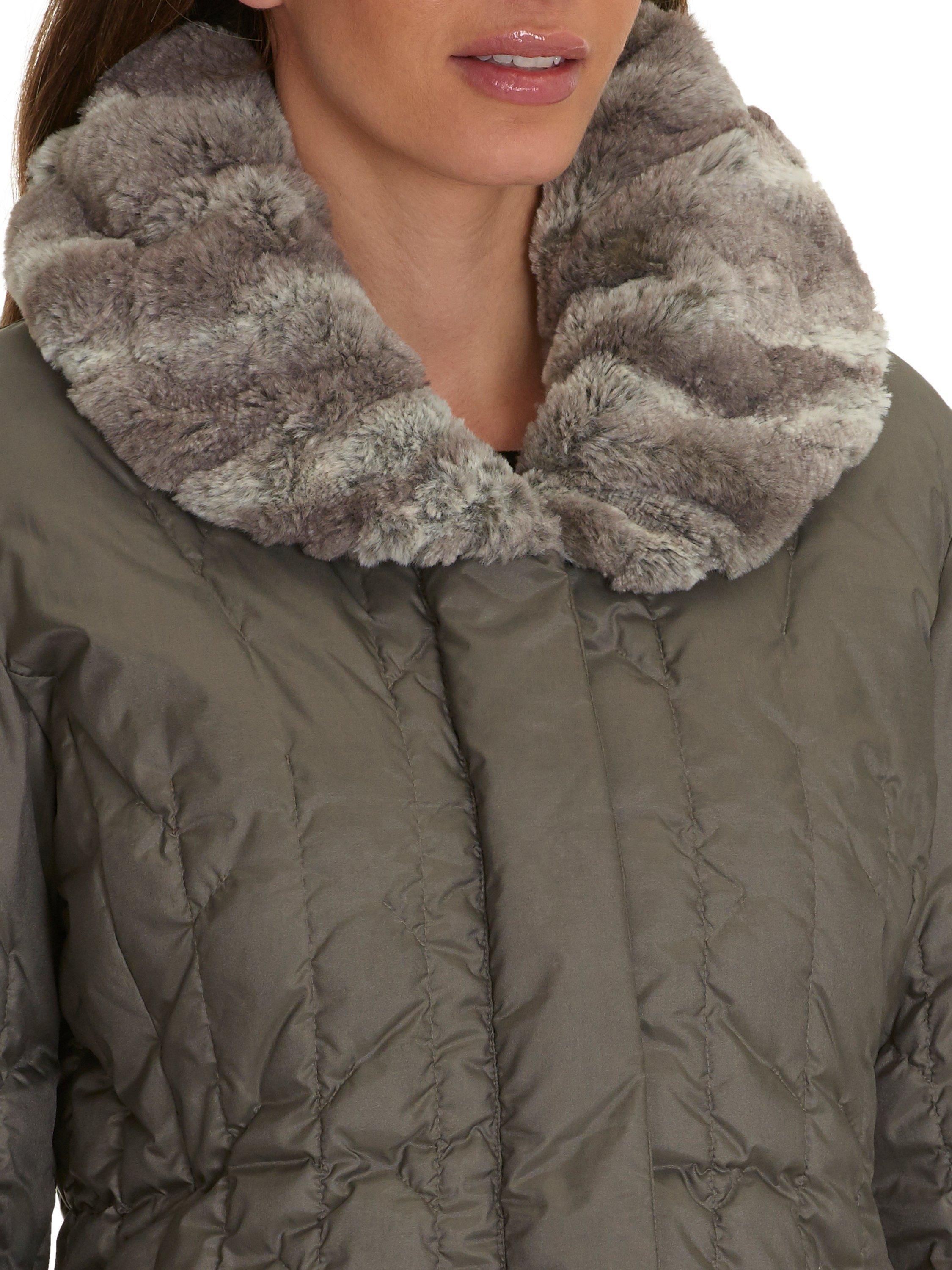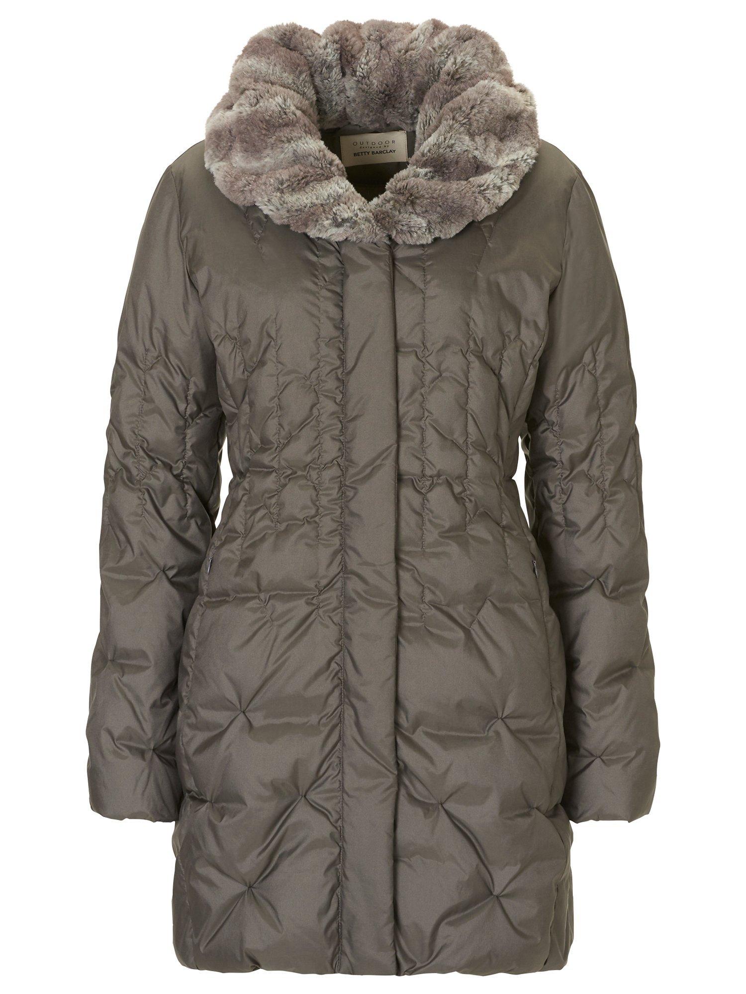 This luxurious quilted down outdoor jacket by Betty Barclay has a generous faux fur collar and is ultra-cosy, warm and stylish.