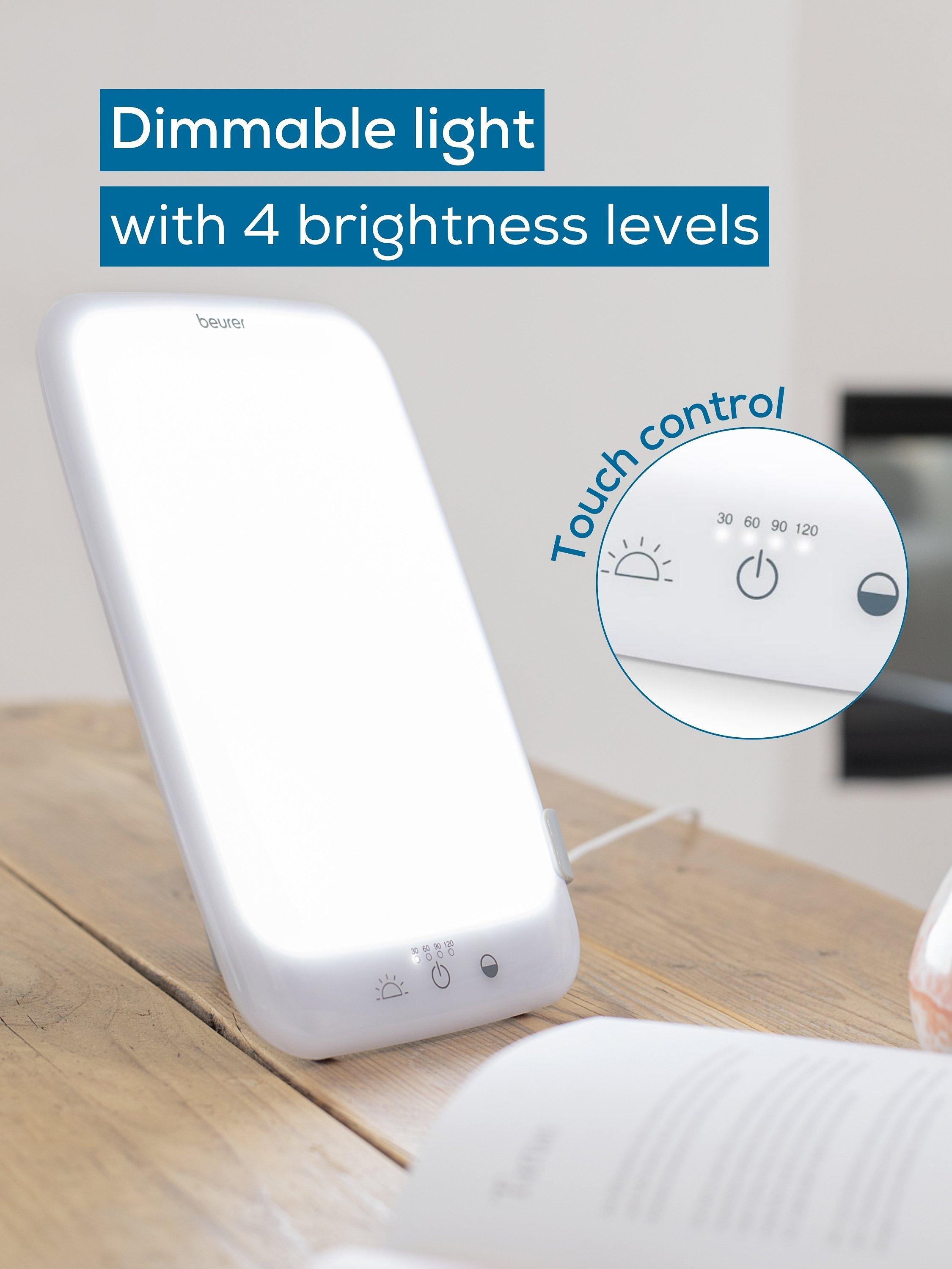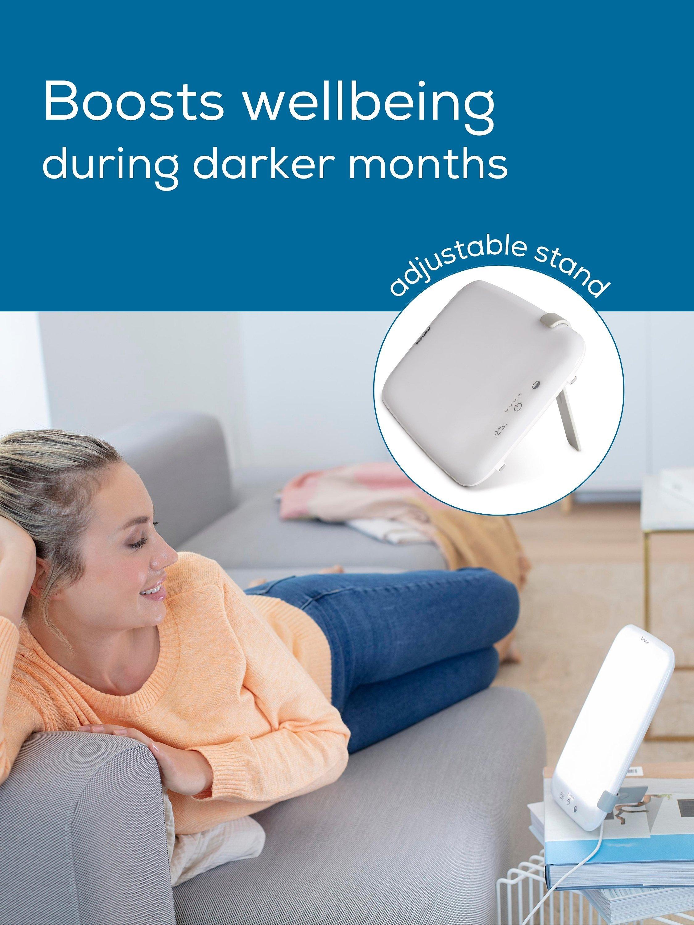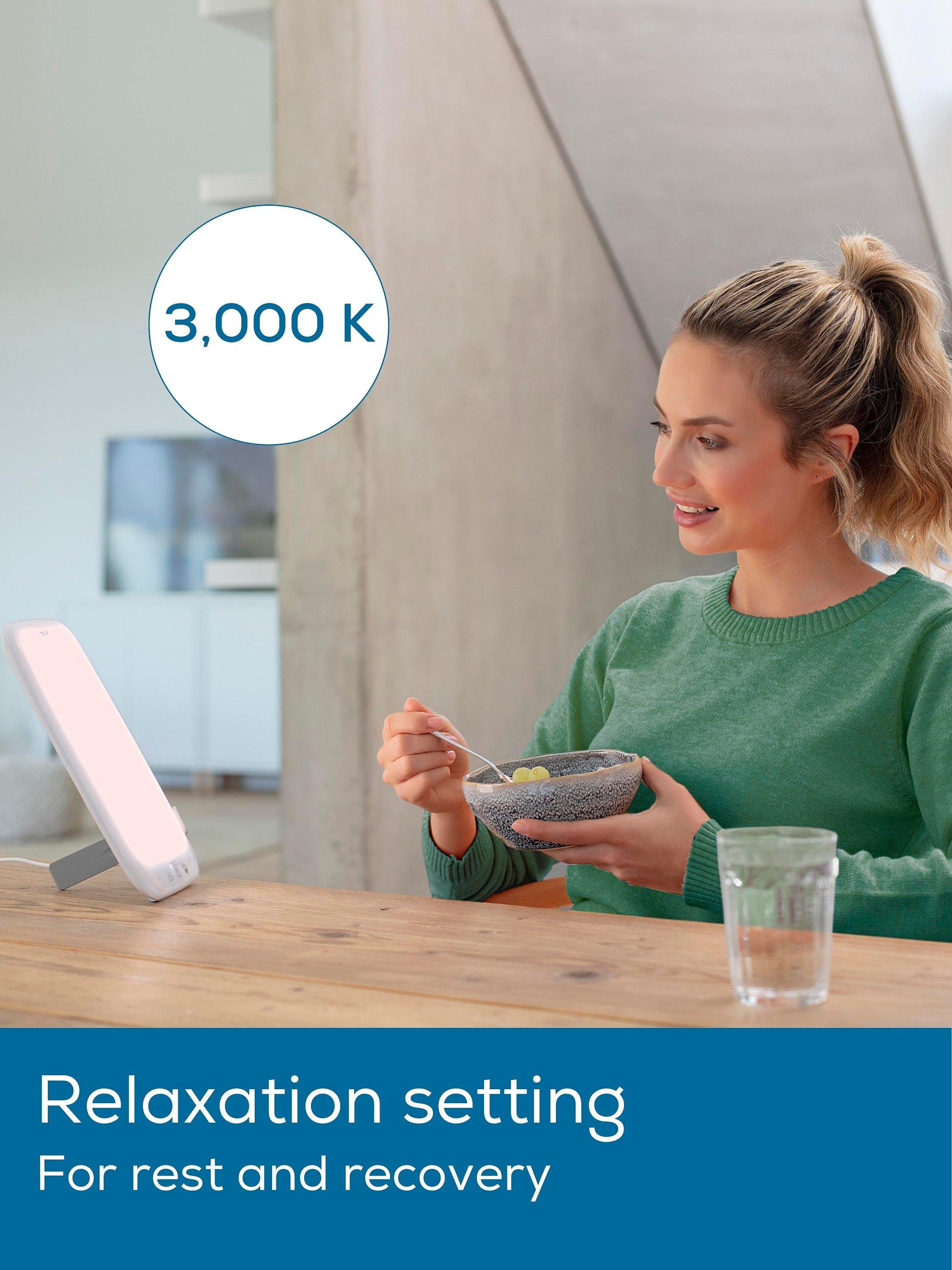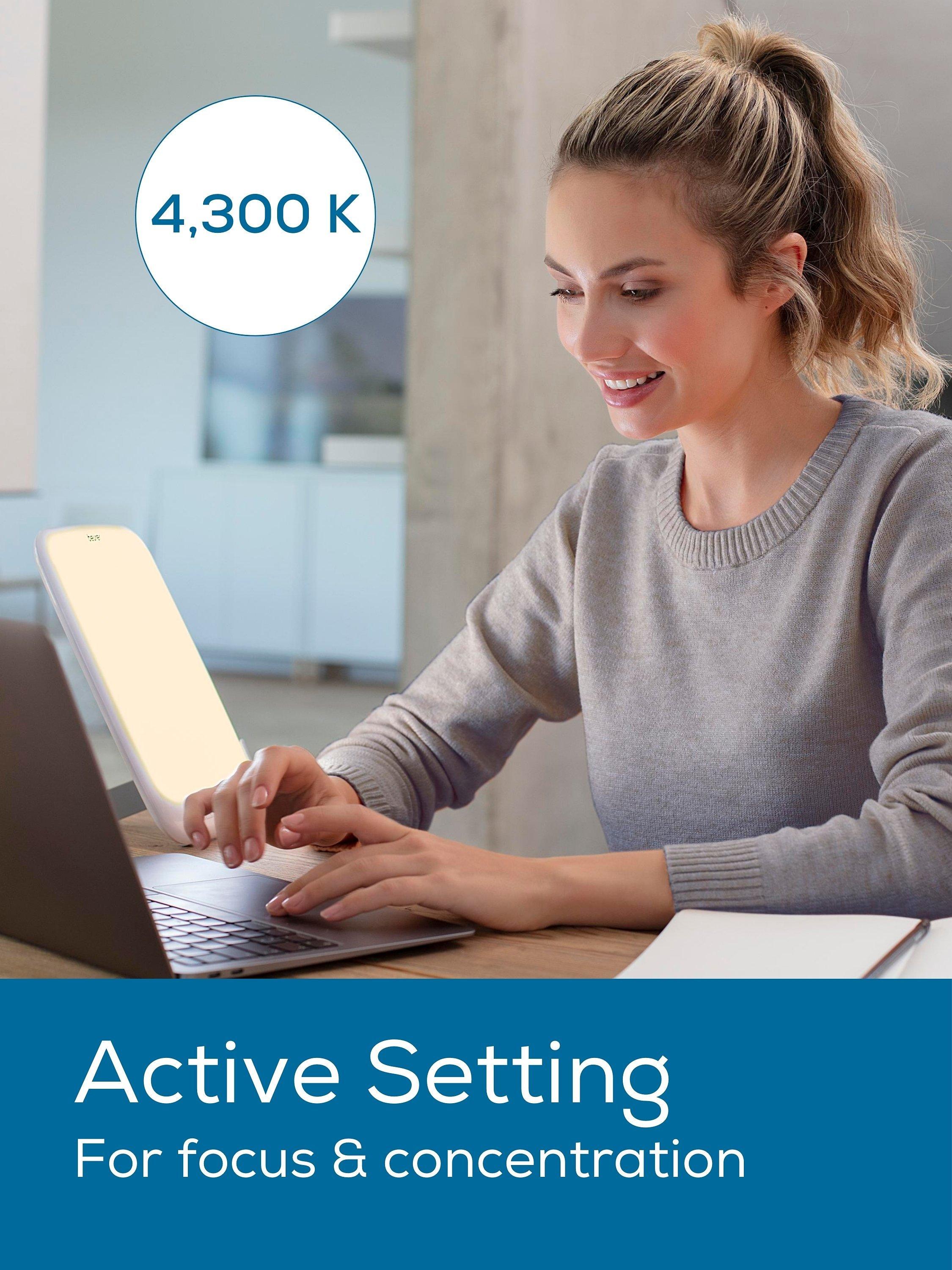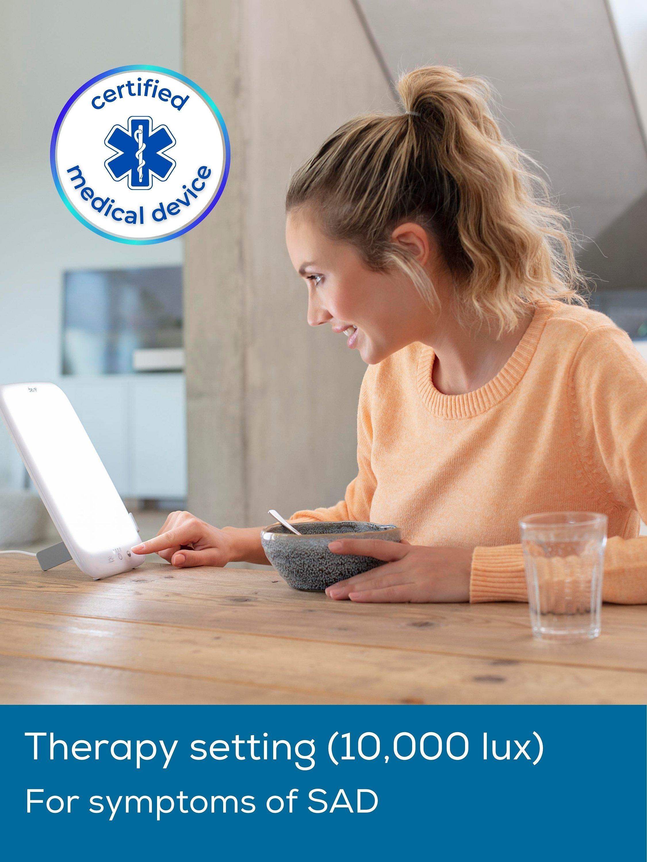 The mood-enhancing therapy setting shines 10,000 lux of light at a distance of approximately 13cm. Light of this intensity is medically certified to help low mood and fatigue associated with lack of sunlight.