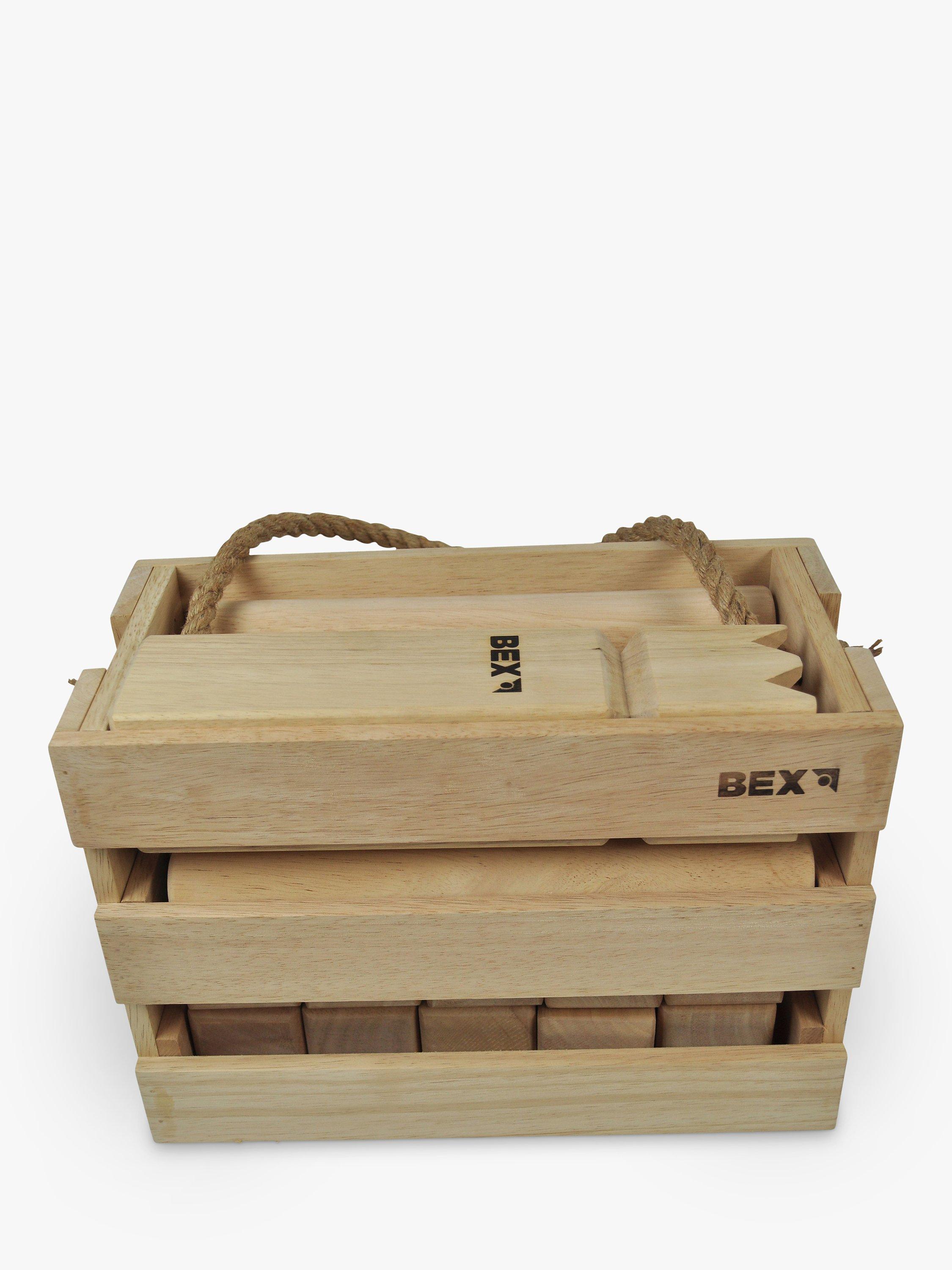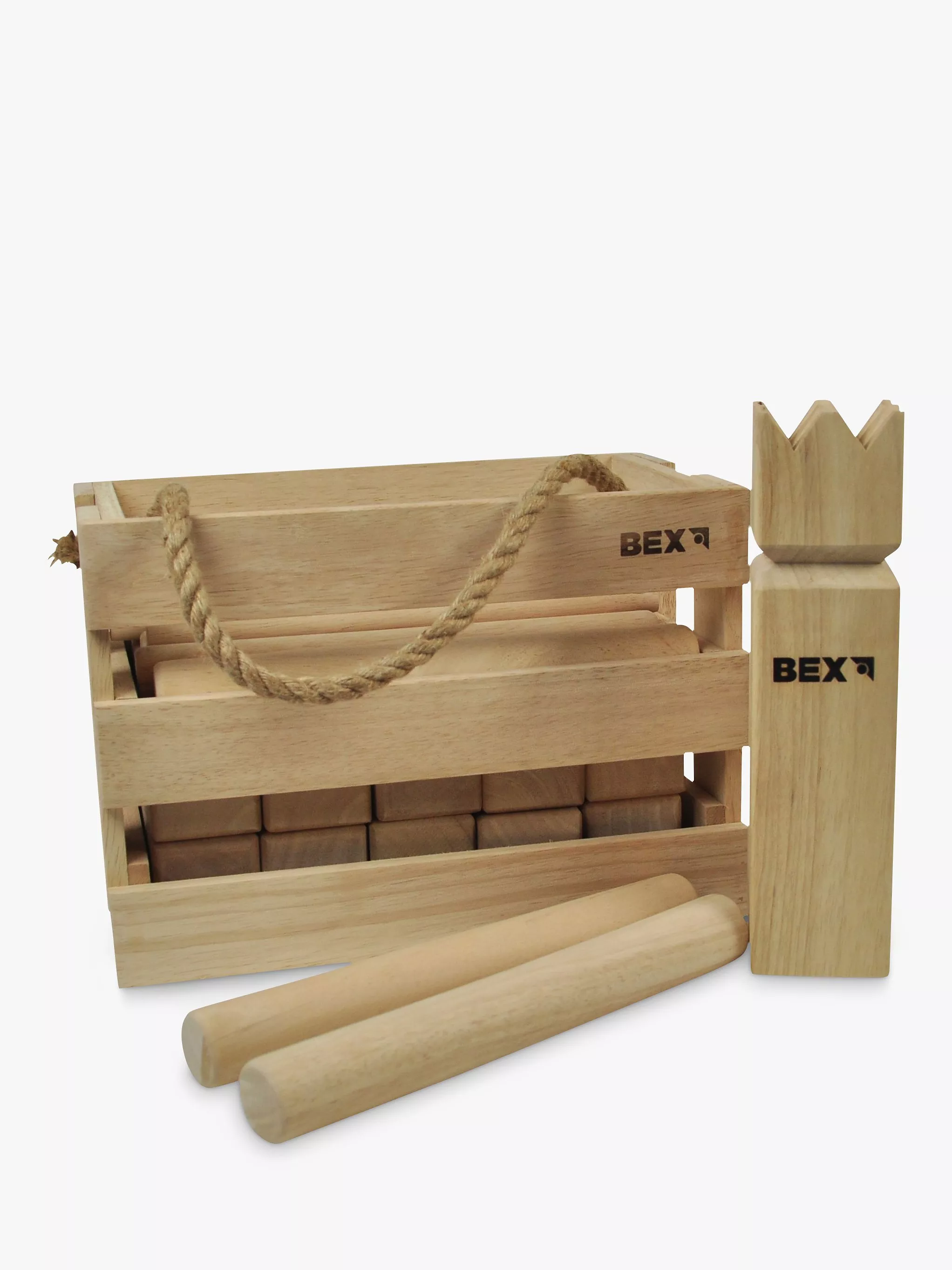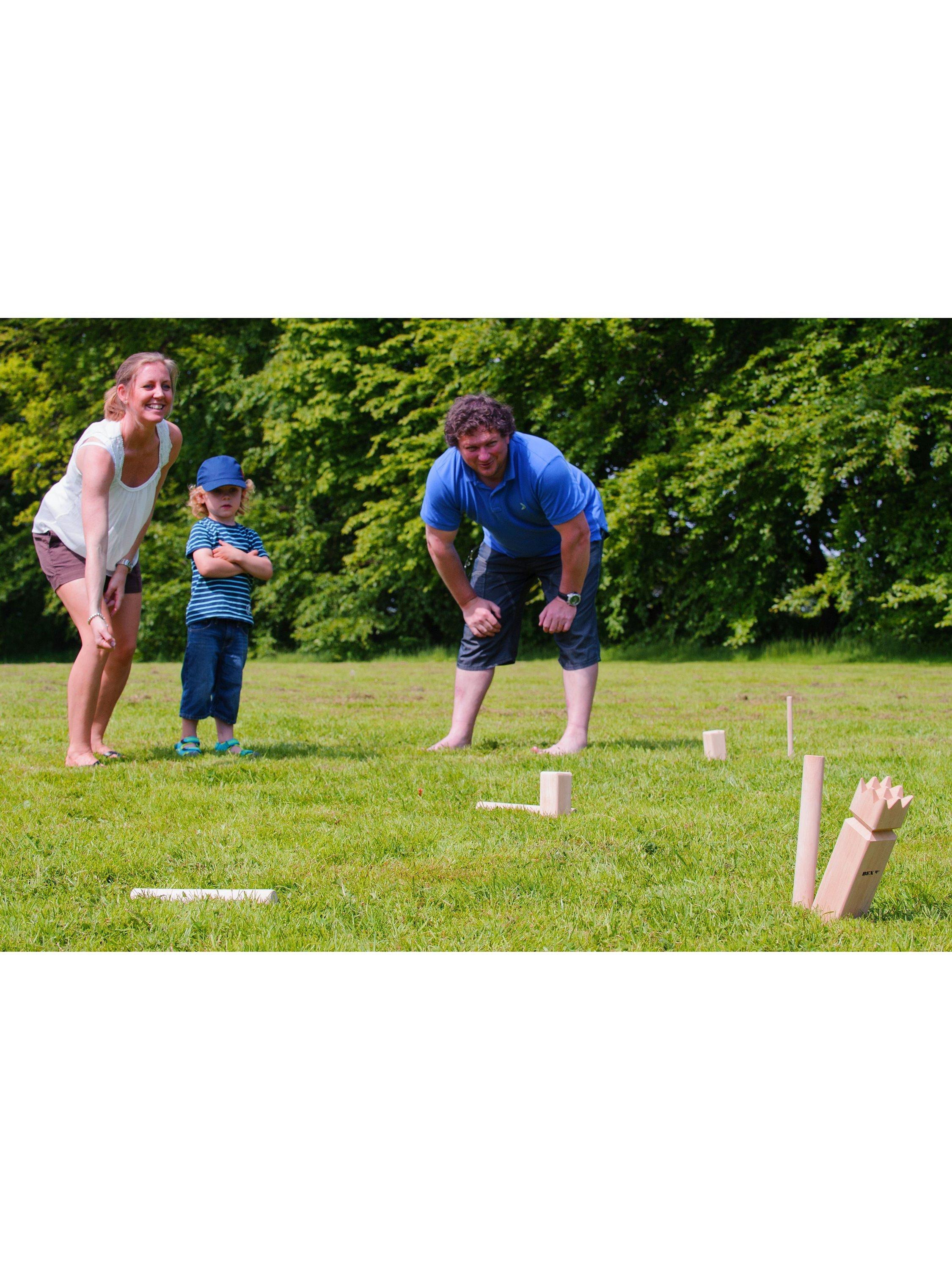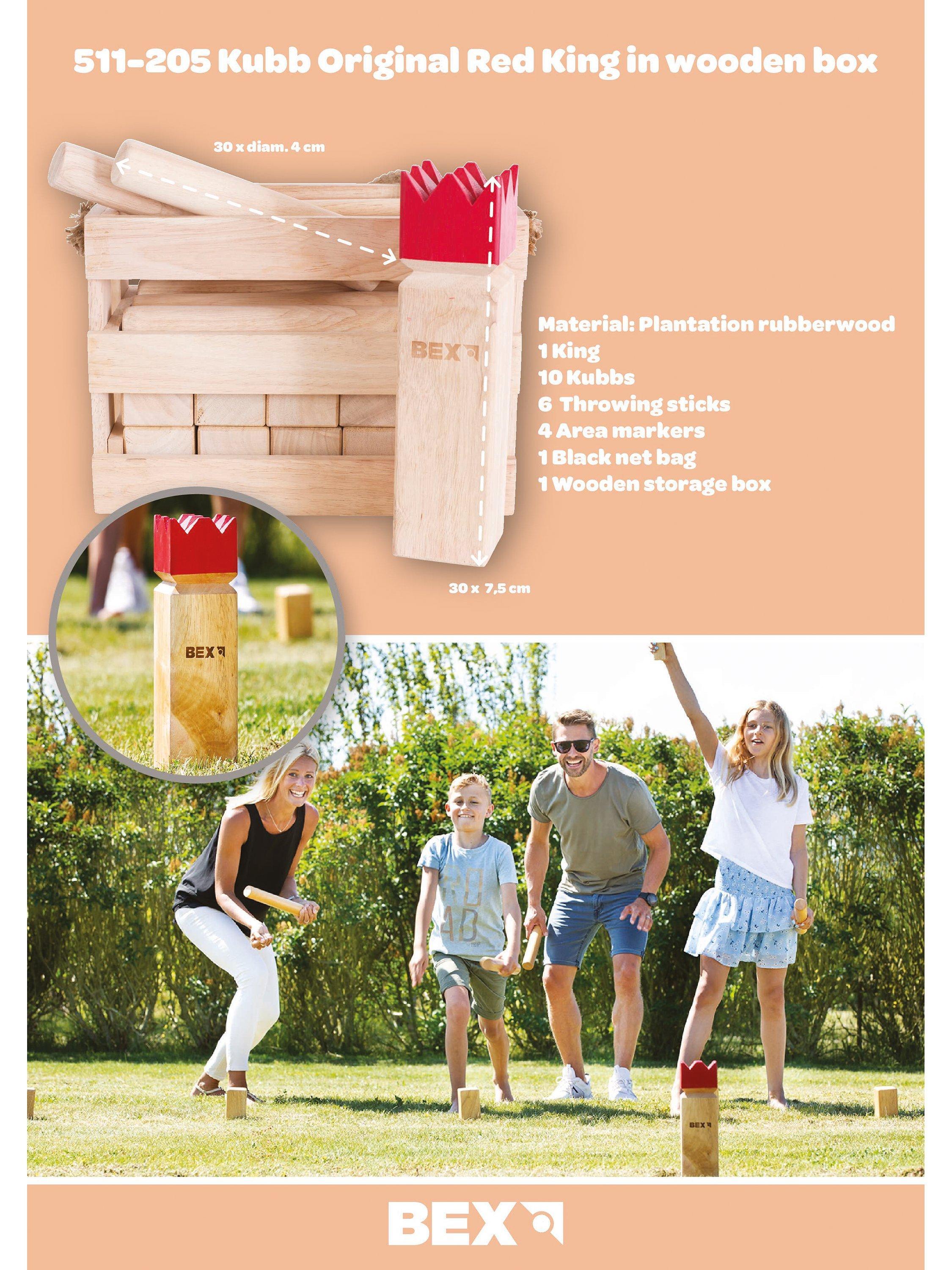Quality wooden garden game for all the family. Made from rubber wood it includes 1 King (30x7cm), 6 throwing sticks (30x4cm), 10 Knights (15x6cm), 4 area markers, 1 wooden box with hemp handle, rules and instructions.