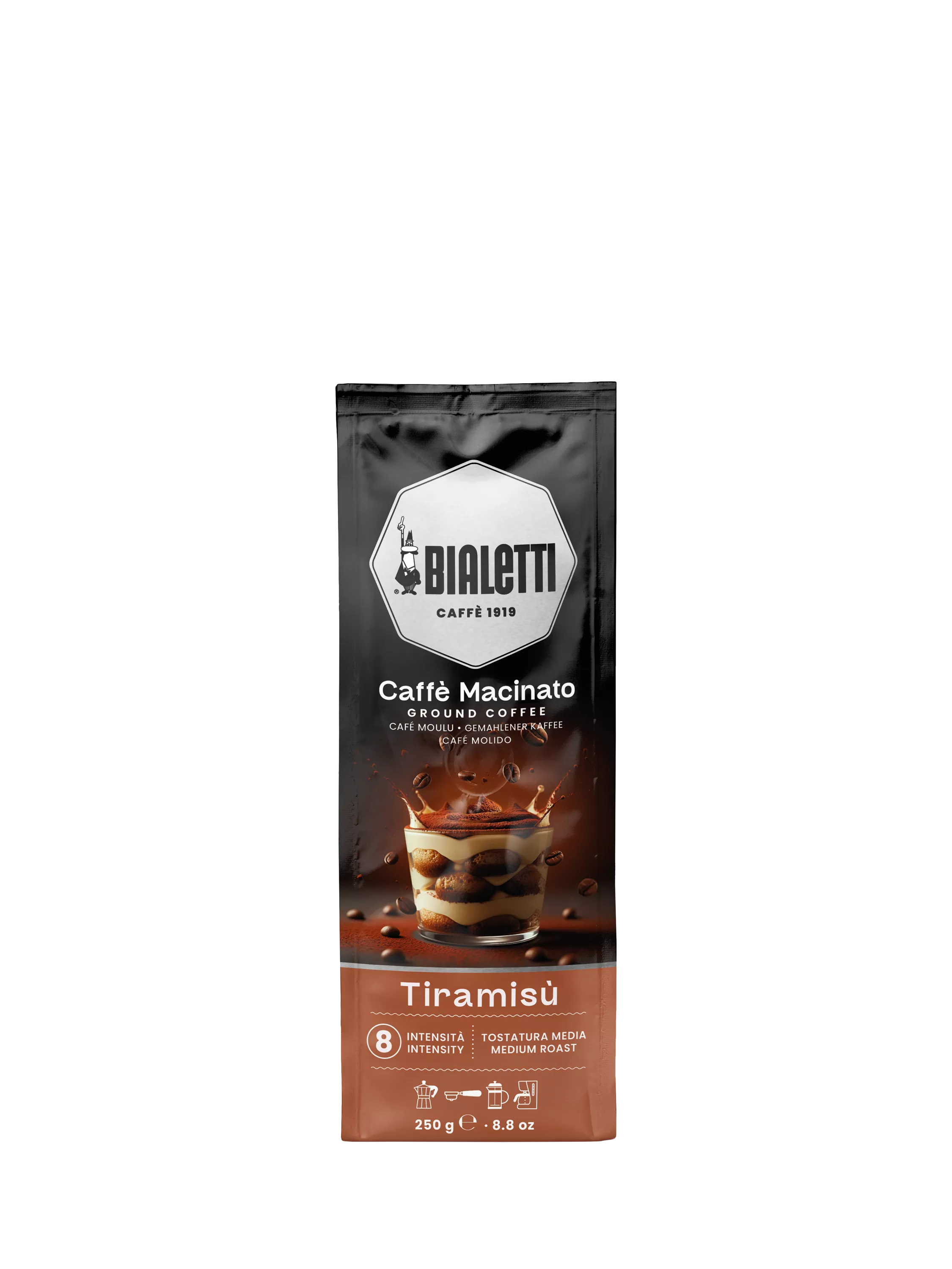 Bialetti's Moka Tiramisu ground coffee is a medium roast, perfectly suited to Bialetti's Moka coffee maker and traditionally roasted in Italy. The enveloping creaminess and rich notes of chocolate, mascarpone and biscuit give life to this tiramisu coffee with a sweet aroma and a persistent fragrance reminiscent of Italy's famous dessert.