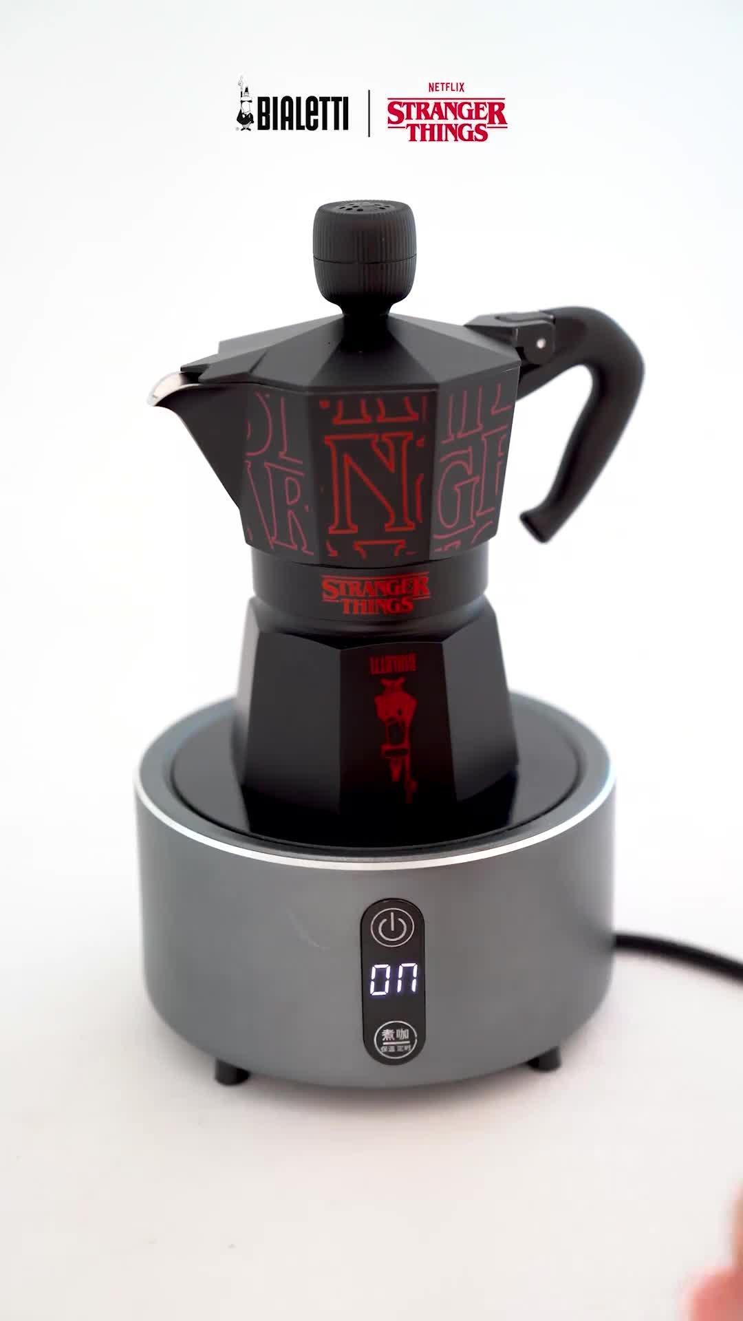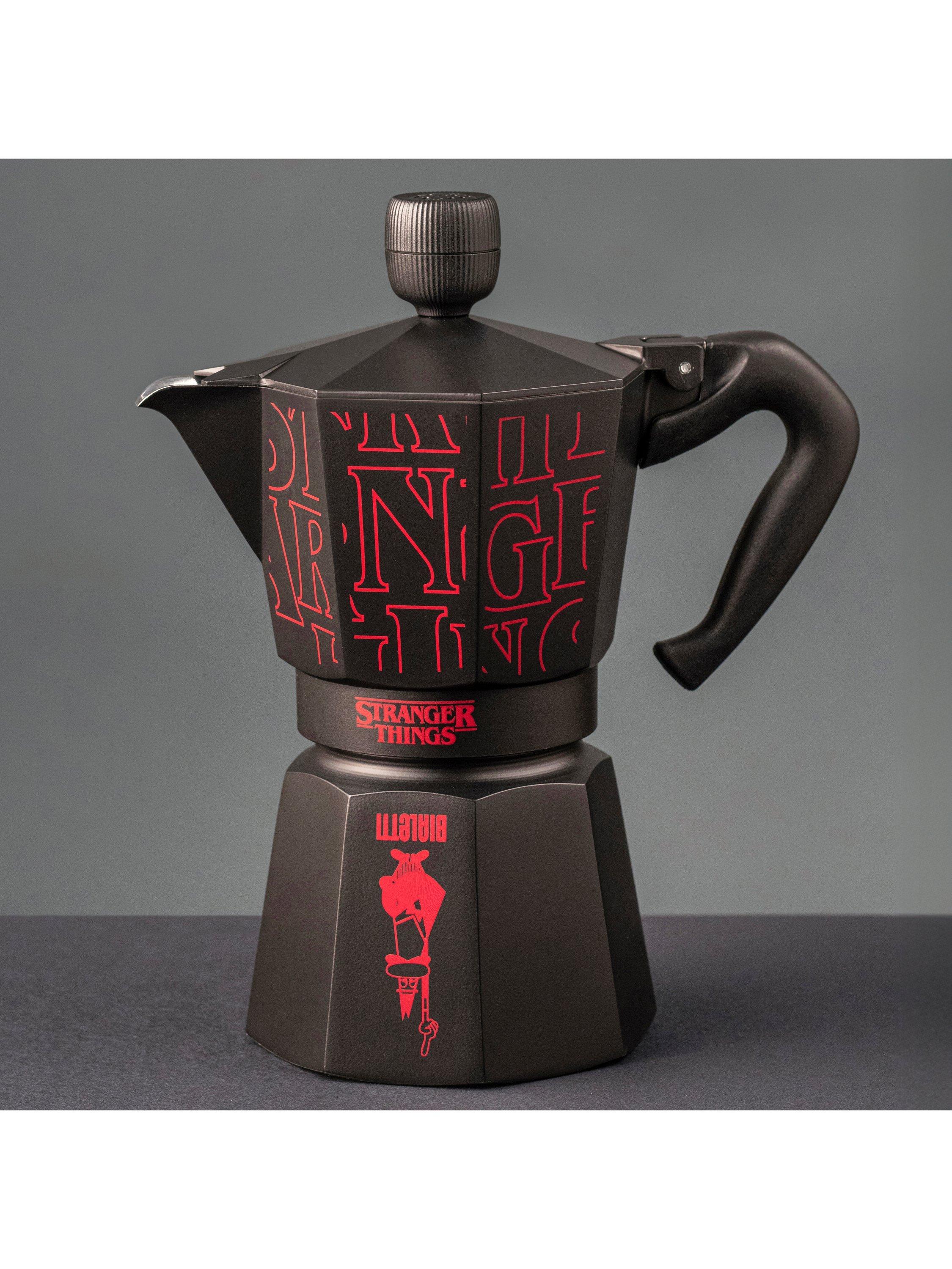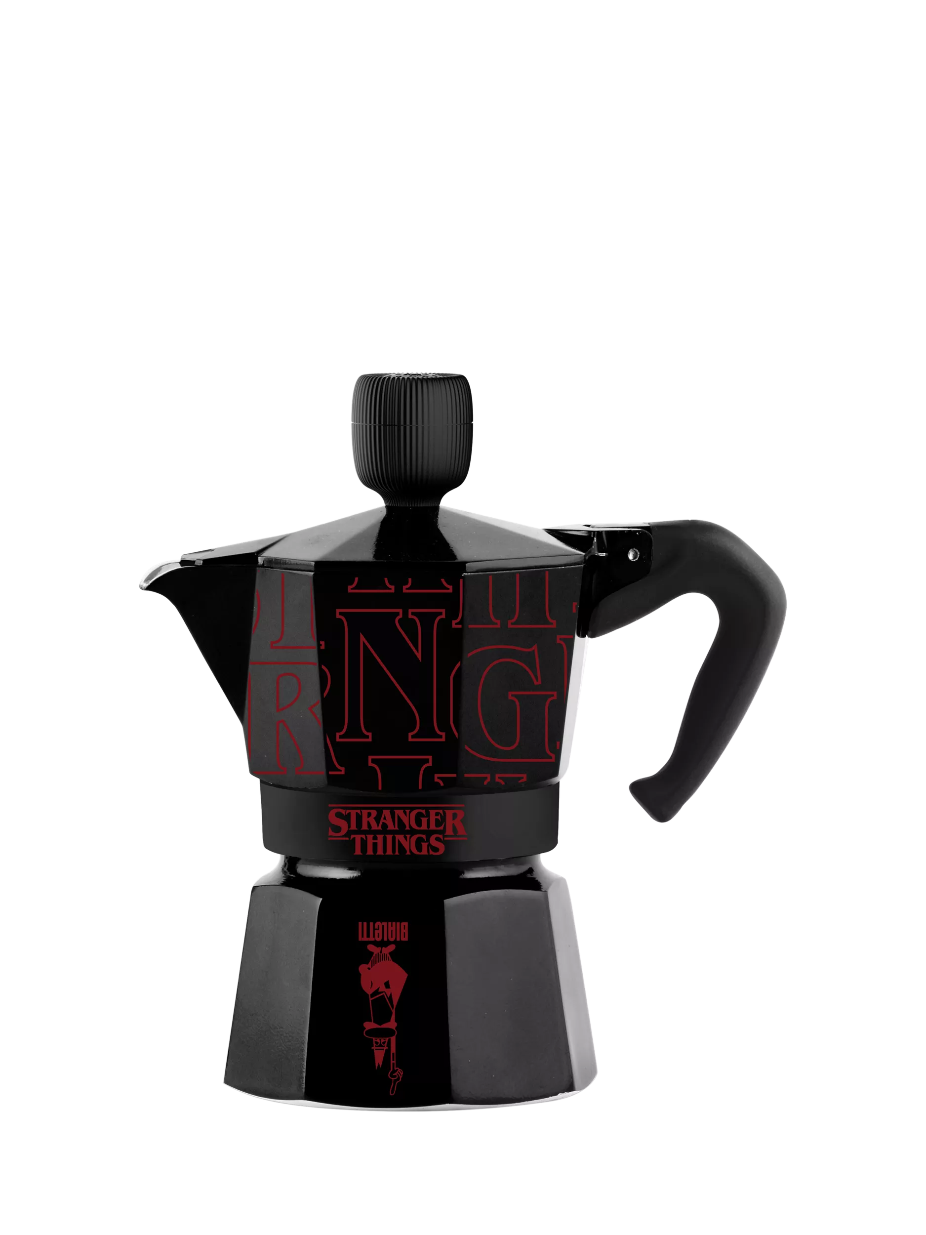 A Moka Express from the Bialetti x Stranger Things Capsule Collection. Fitted with an innovative and extraordinary knob, this three-cup espresso coffee maker is an elegant and unique design.