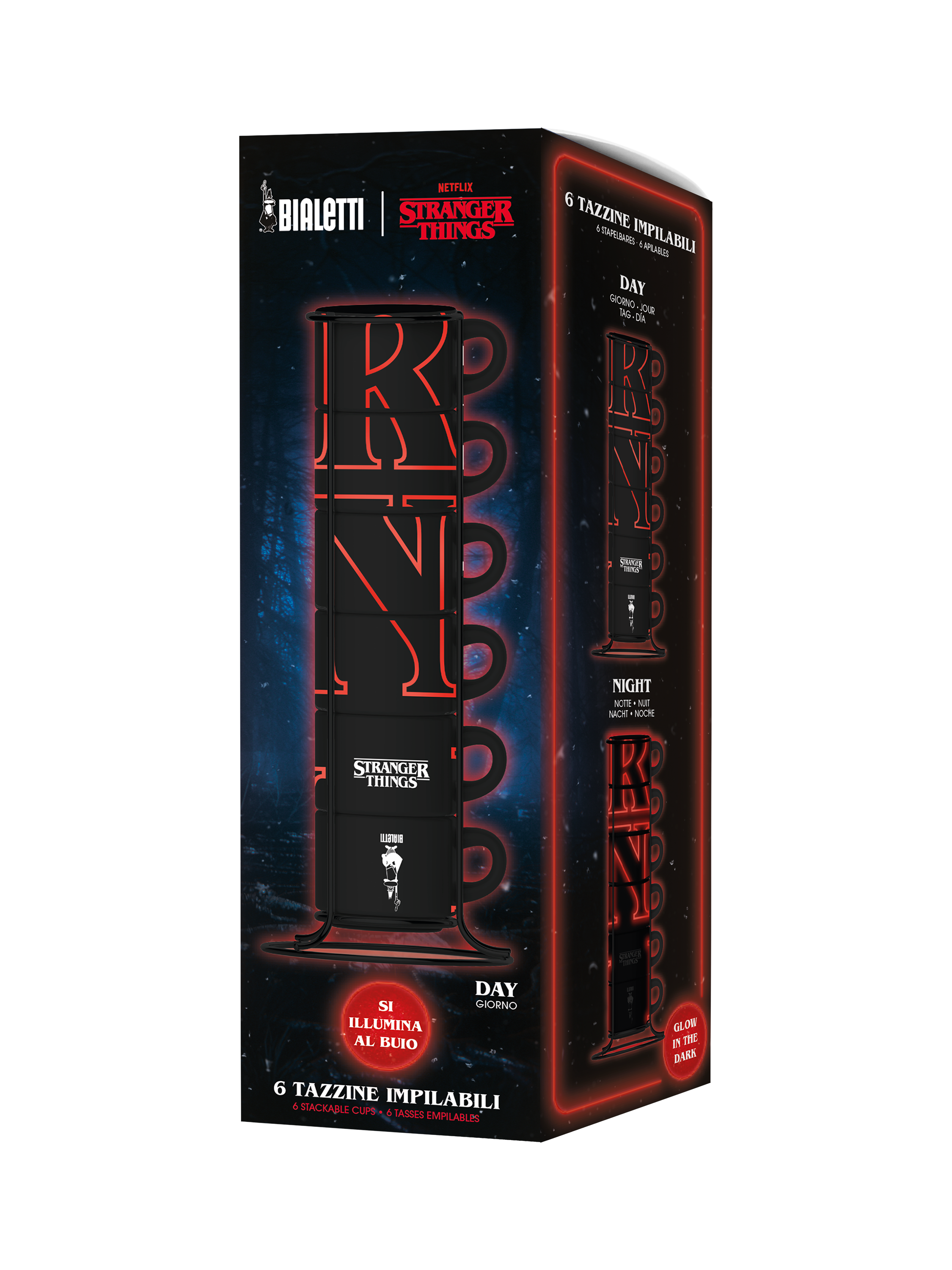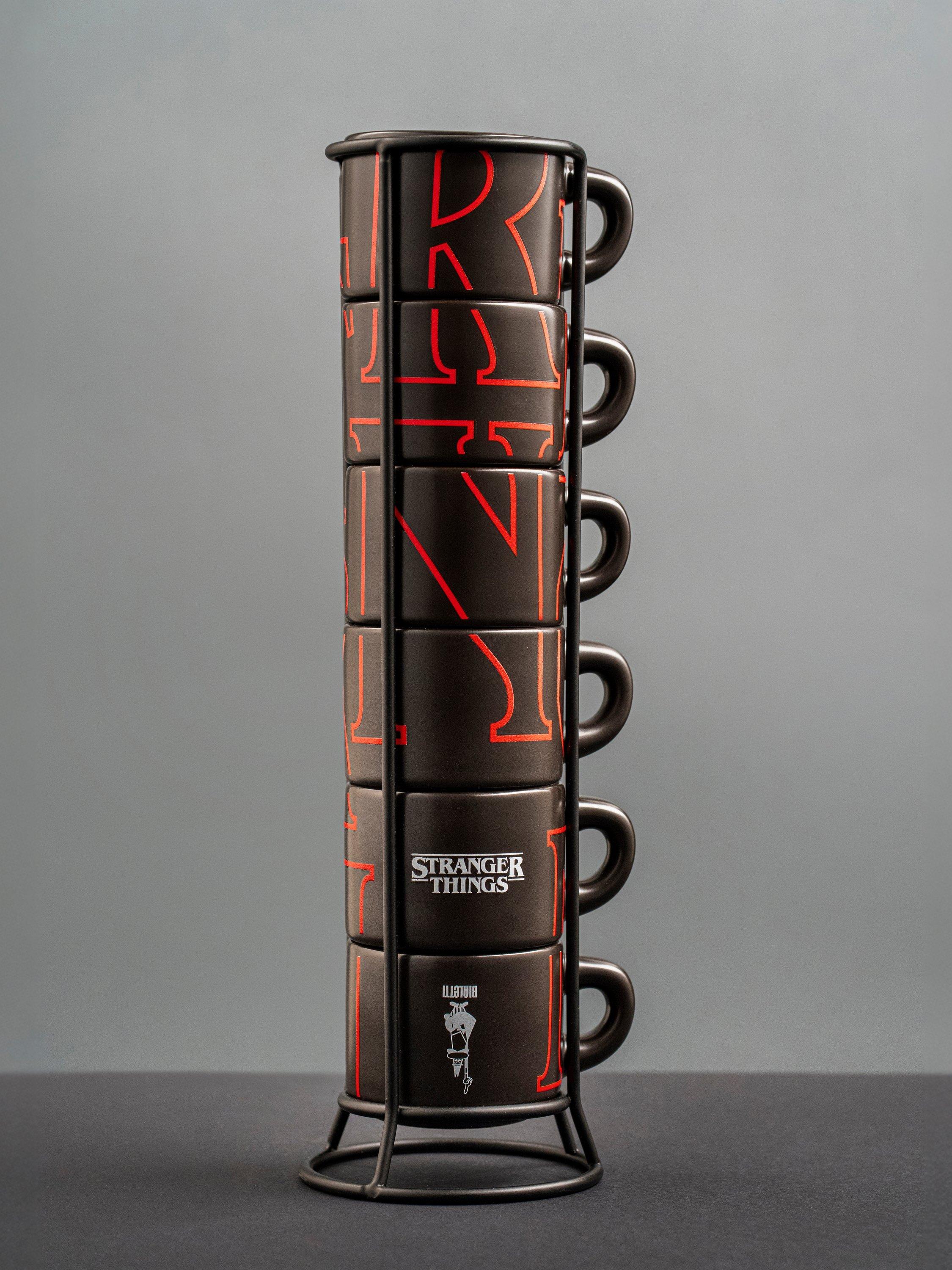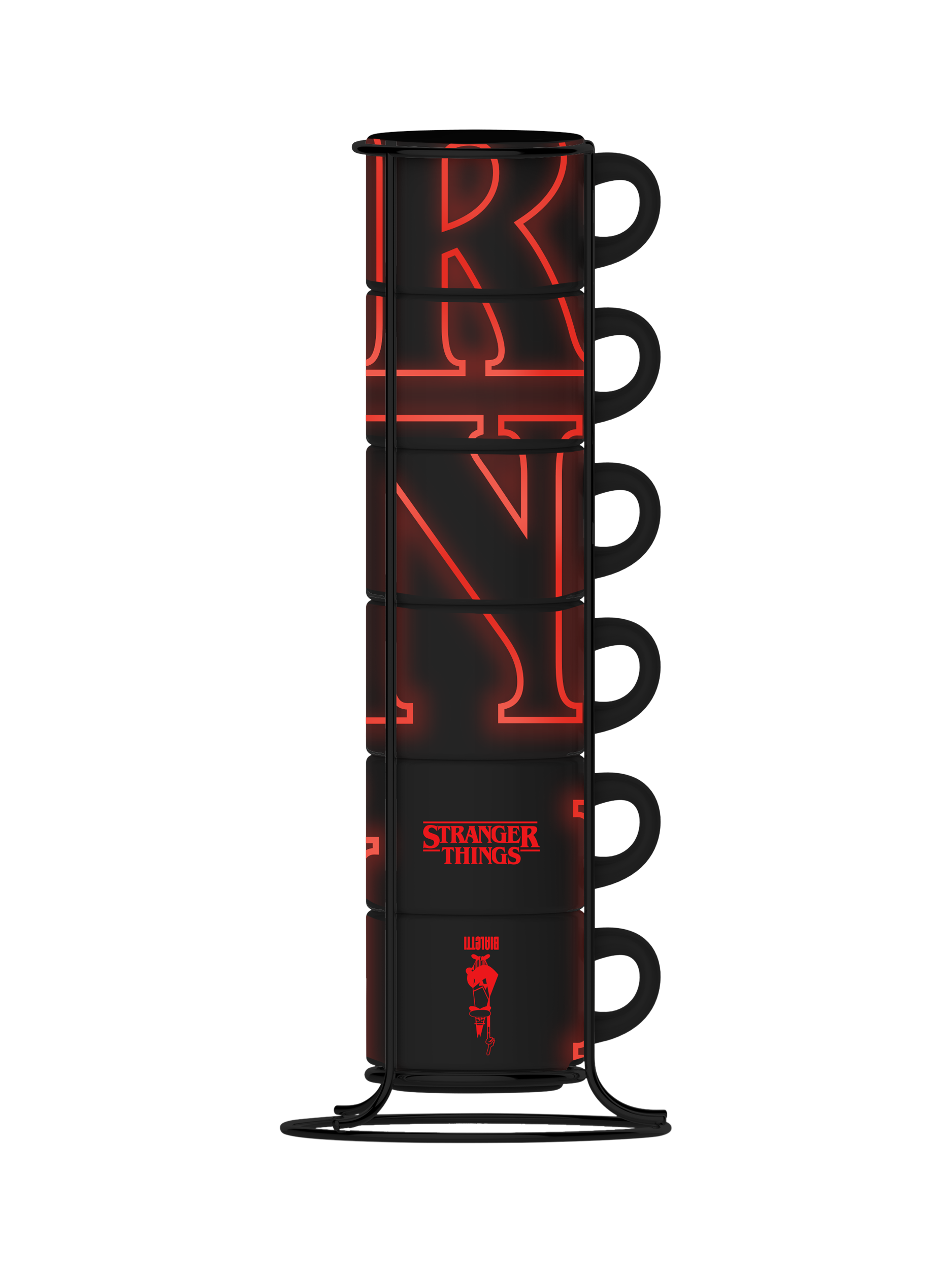 A set of six Bialetti espresso cups stacked one on top of the other on a stand. A must-have for every coffee-loving Stranger Things fan. The Bialetti x Stranger Things Capsule Collection features practical, innovative and heat-reactive ceramic products.