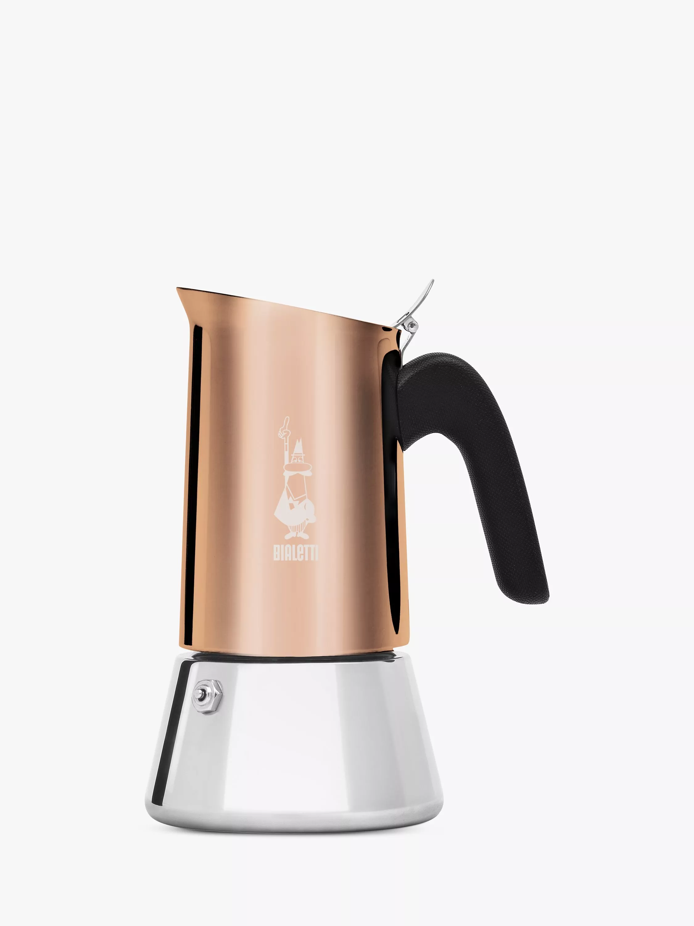 A modern update of Bialetti's iconic Moka Express coffee maker, with a bright copper finish that retains its shine. Stylish and practical, the Venus model is compatible with induction stovetops, as well as traditional stovetops.