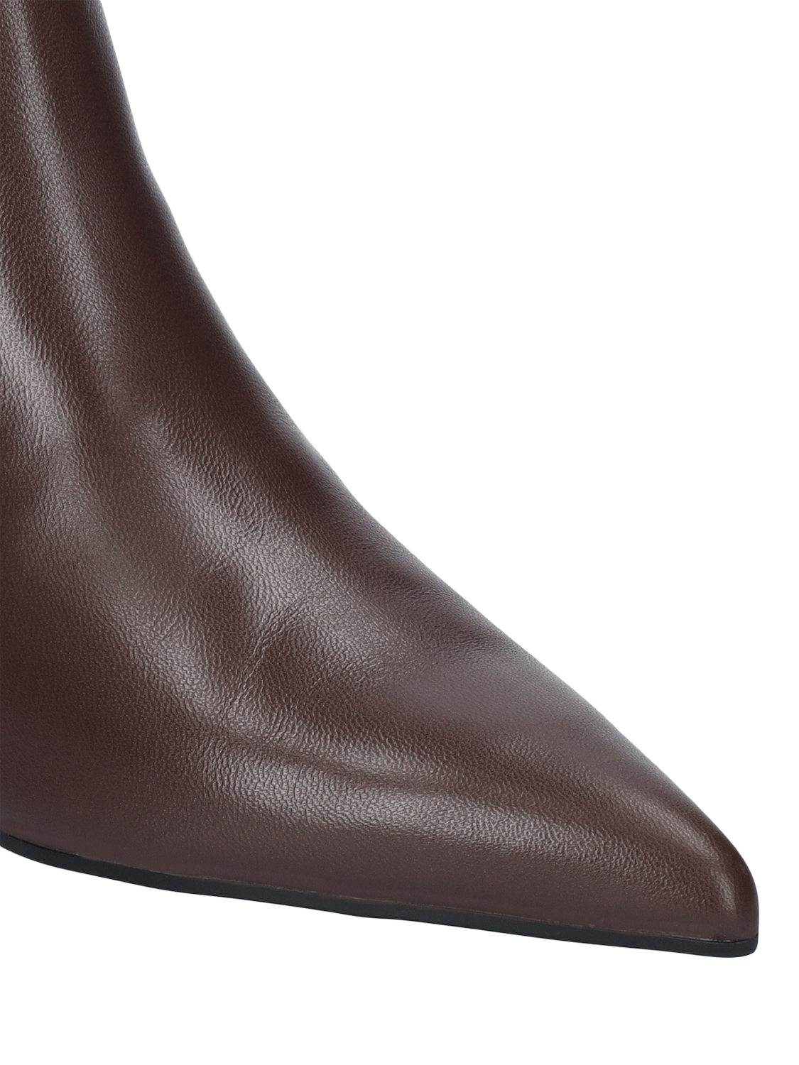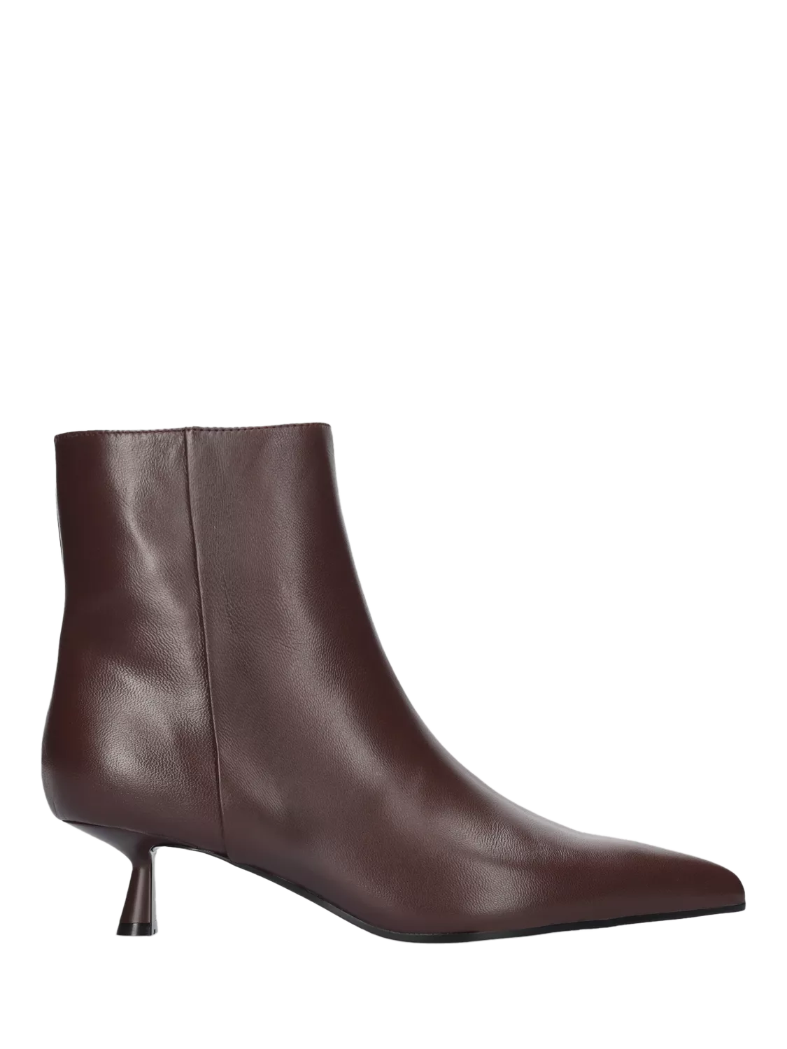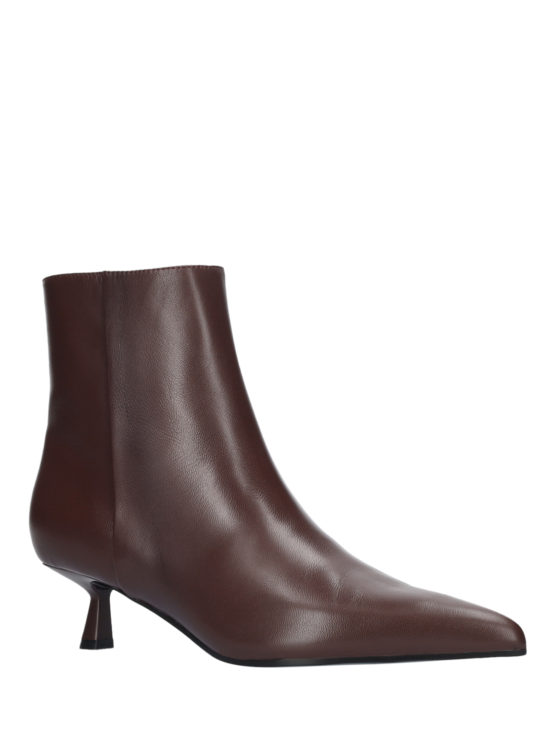 Mid-heel ankle boots, blending comfort with a leather uppers, a sharp pointed toe and easy zip fastening.