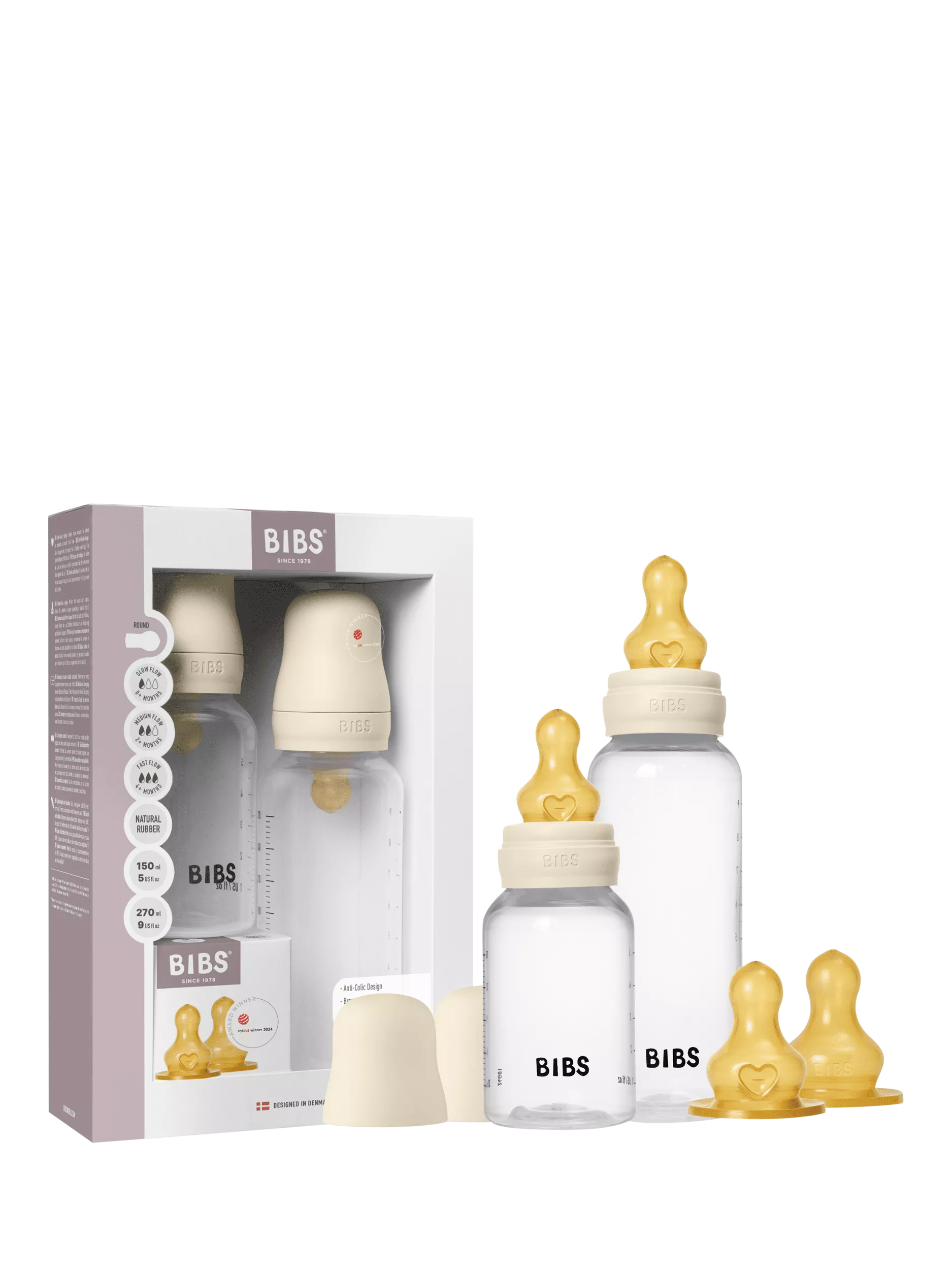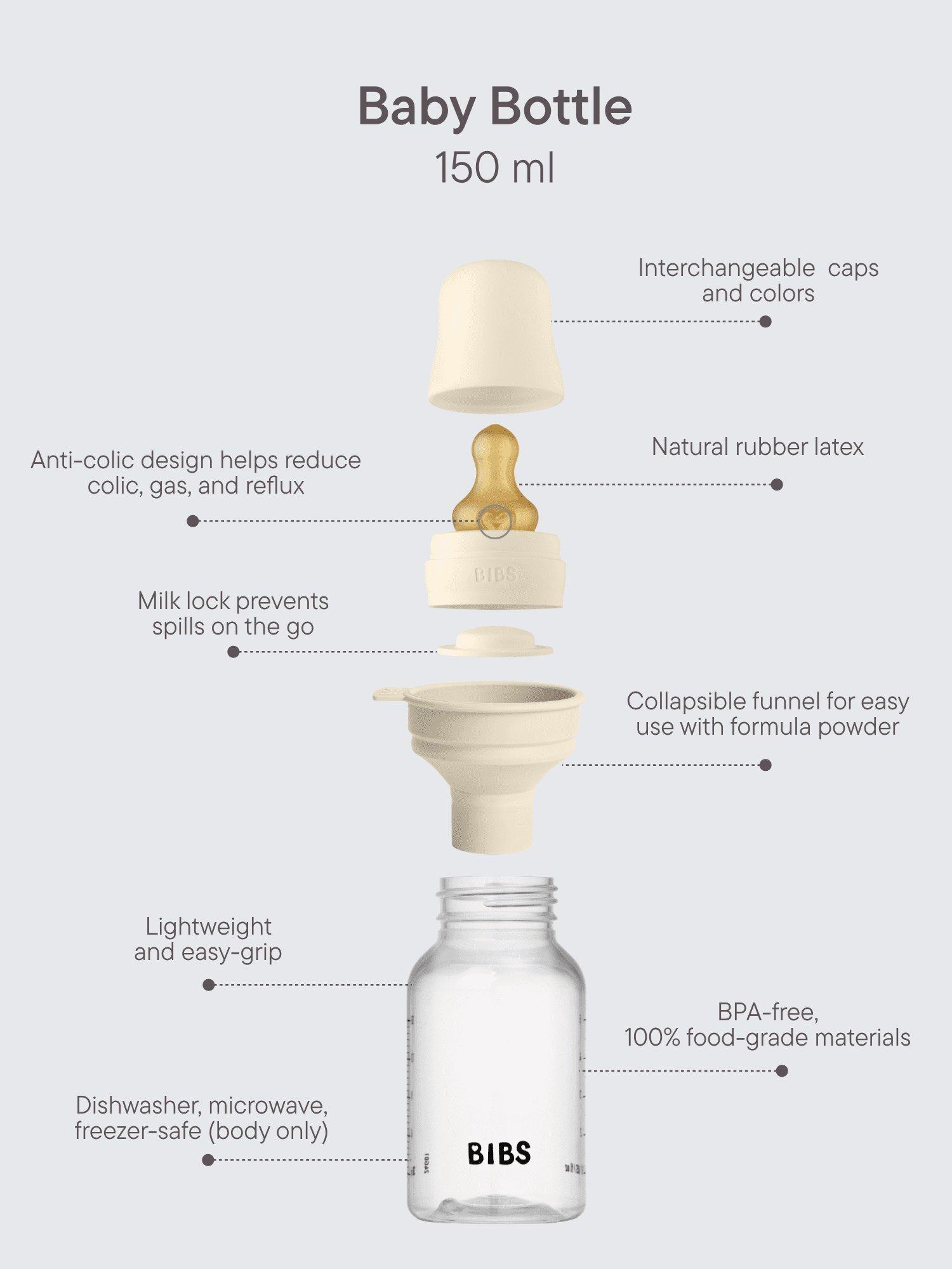 Lightweight, dishwasher-safe and award-winning bottle. BIBS bottles are loved for their sleek look, anti-colic valve that reduces gas and reflux, and breast-like nipple that eases the transition between breastfeeding, bottle feeding, and soother use. This set includes 1x 150ml and 1x 270ml bottle.