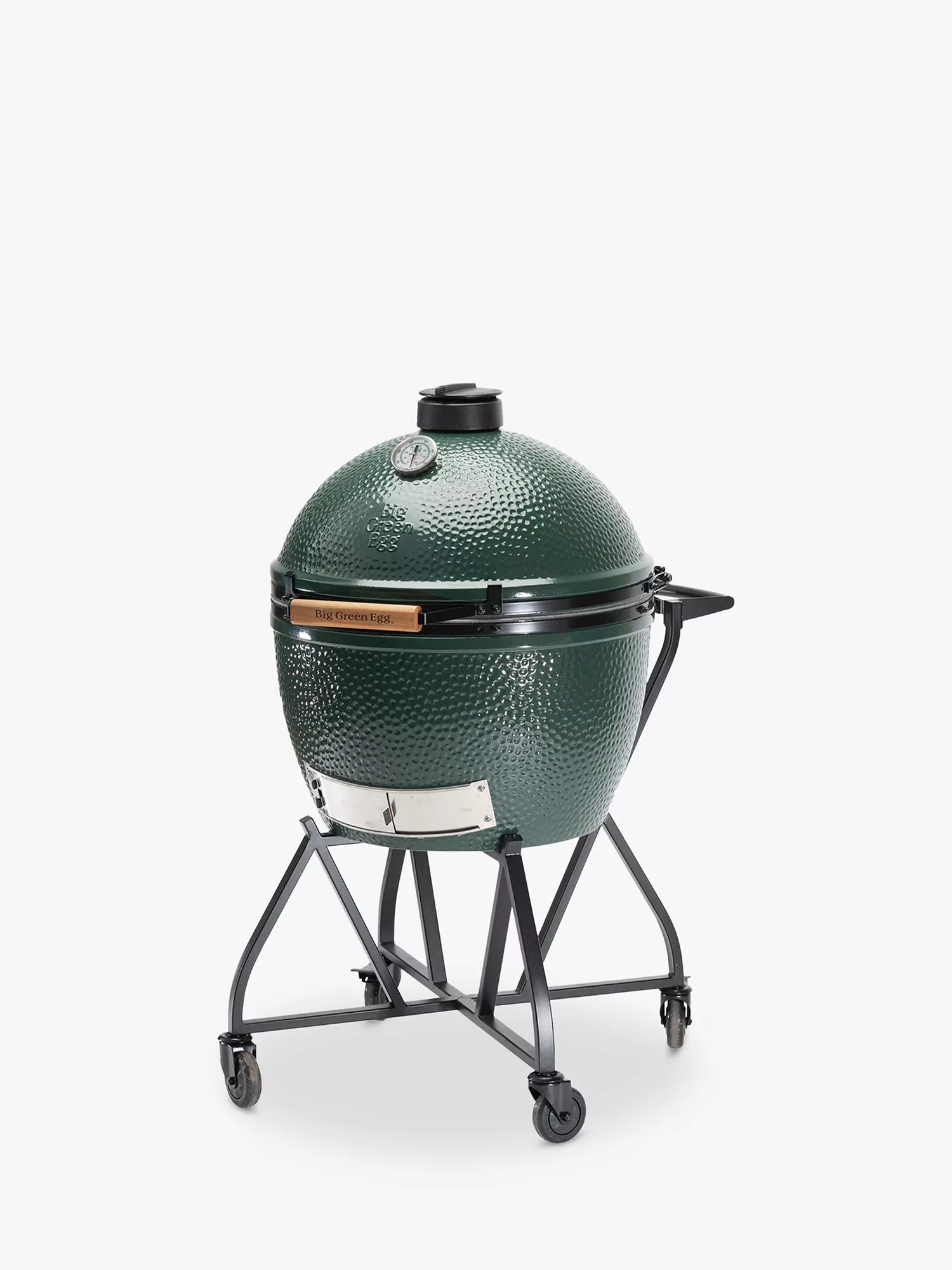 This Extra Large Big Green Egg bundle includes a metal stand or IntEGGrated nest, with the Egg sitting perfectly in the middle. The stand has caster wheels for easy moving and wheel locks to secure it into position. The Egg has a large gauge for keeping an eye on the cooking temperature.
