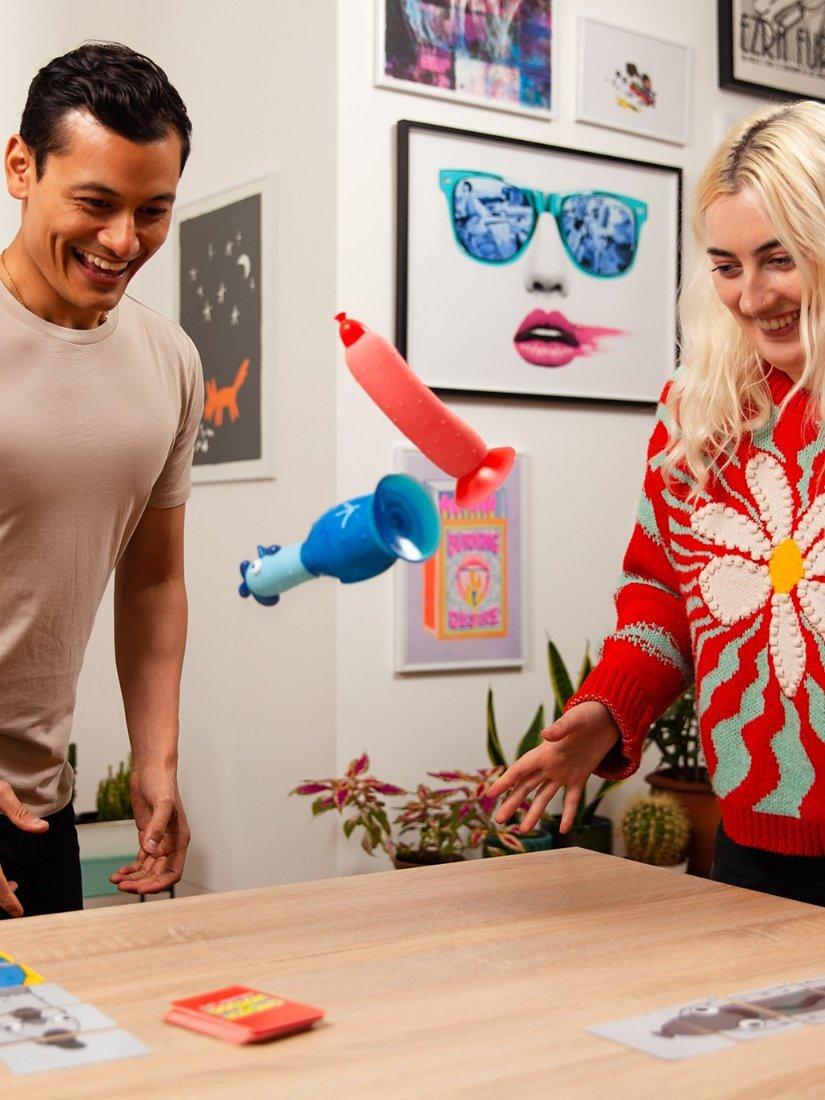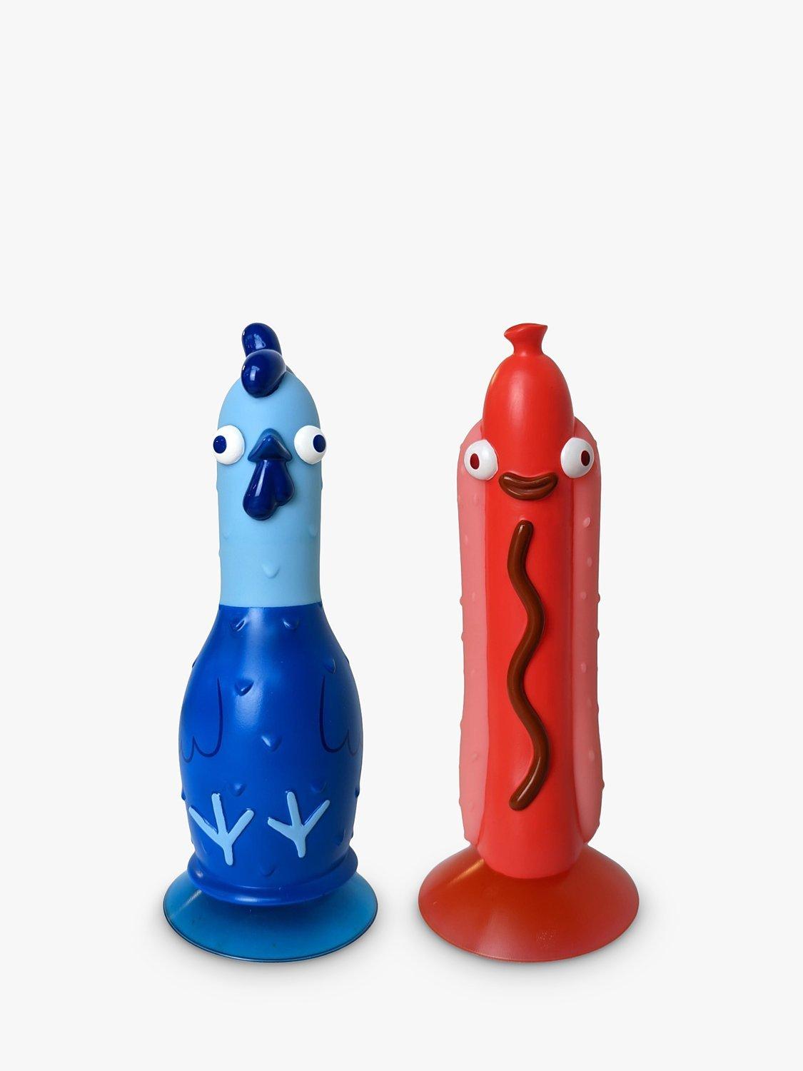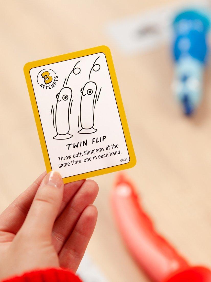A flip it and stick it party game. Okay, it's time to settle this once and for all - who is top dog (or chicken)? Get ready to find out. Split into teams, or go one-on-one, then get ready to bid and flip your way to sweet-tastin' victory. Turn over a Challenge Card, then secretly bid high if you think you can nail it or bid low to avoid it. If both bids match, then it's Flipperama time! Every time you compete a challenge you can turn over a Character Card. Turn over enough cards to create your Chicken (or Hot Dog) and you've won the game!