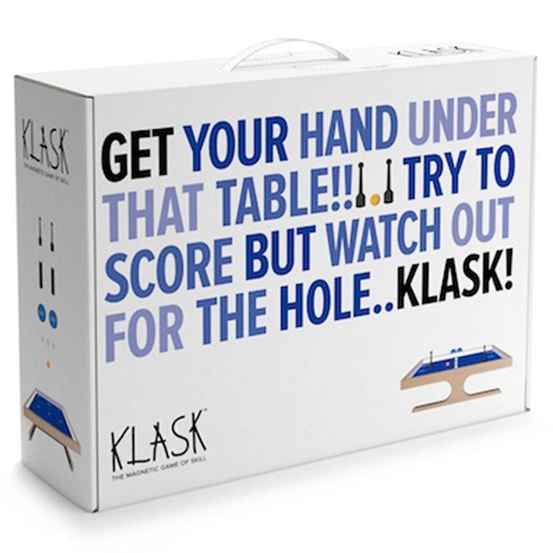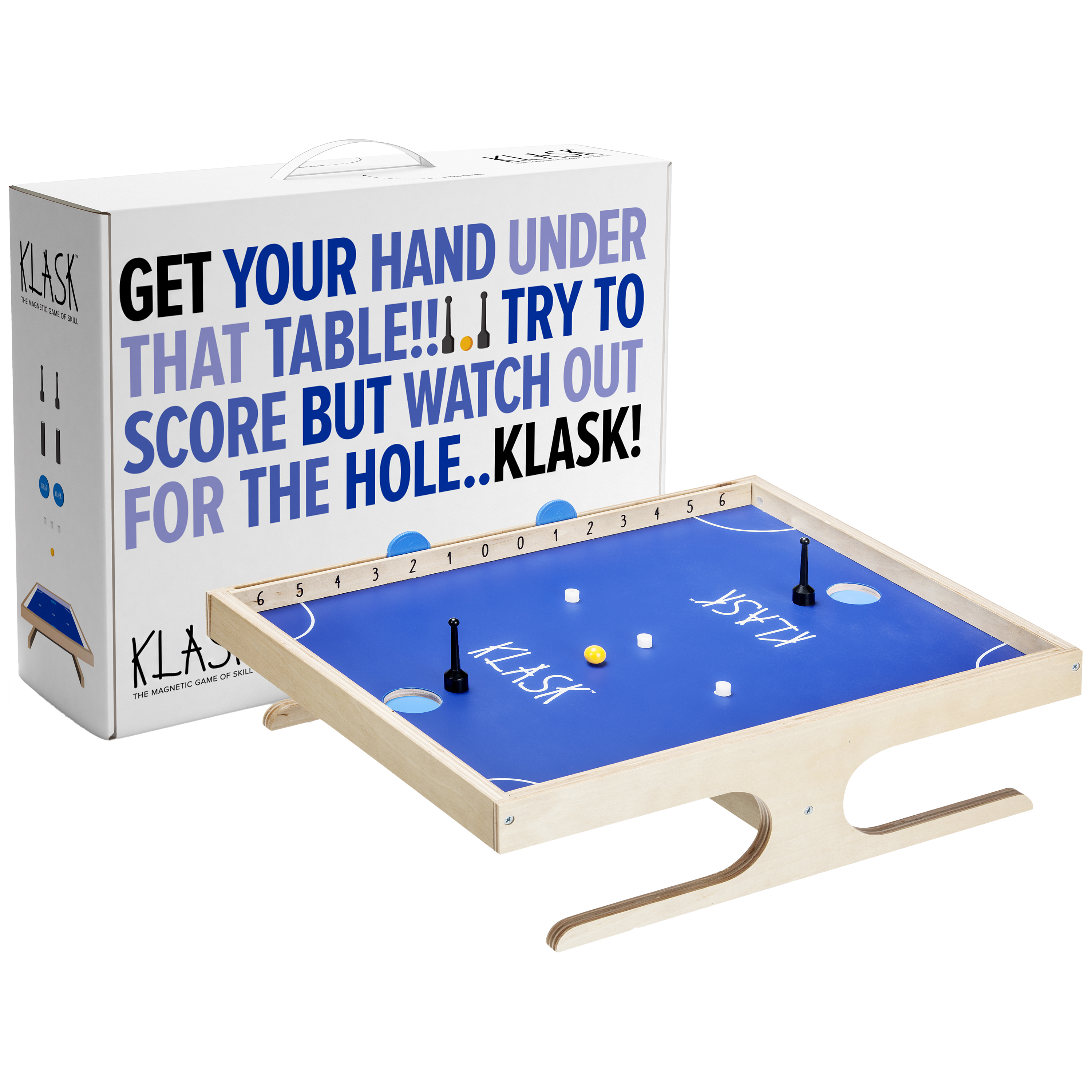 The magnetic gameplay of Klask is unique, fun and like no other game out there... Klask will entertain all players from the youngsters to the old folks. The player is in charge of the magnets from under the table. Both players try to score while trying to avoid the white barrier magnets in the middle of the game field.