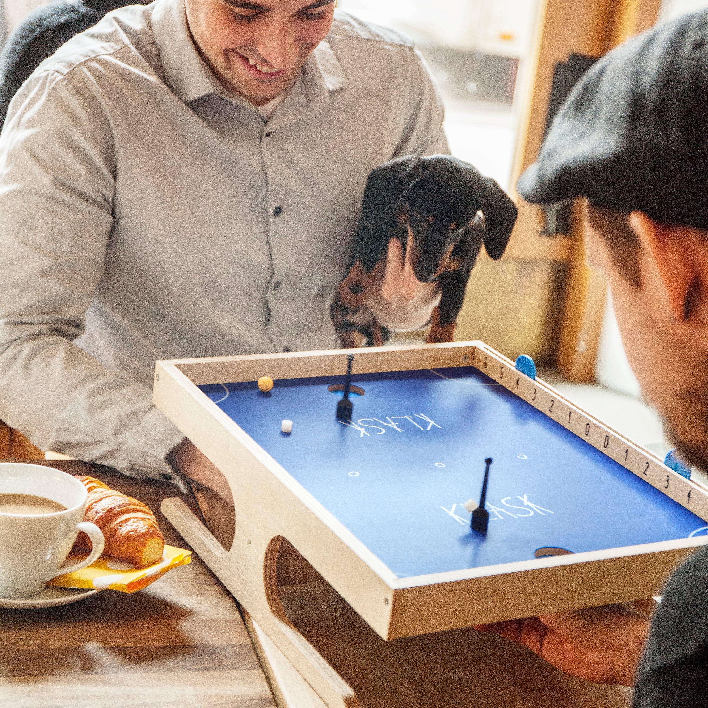 Klask is a fun magnetic game where the players challenge each other in a battle that can get loud and exciting!
