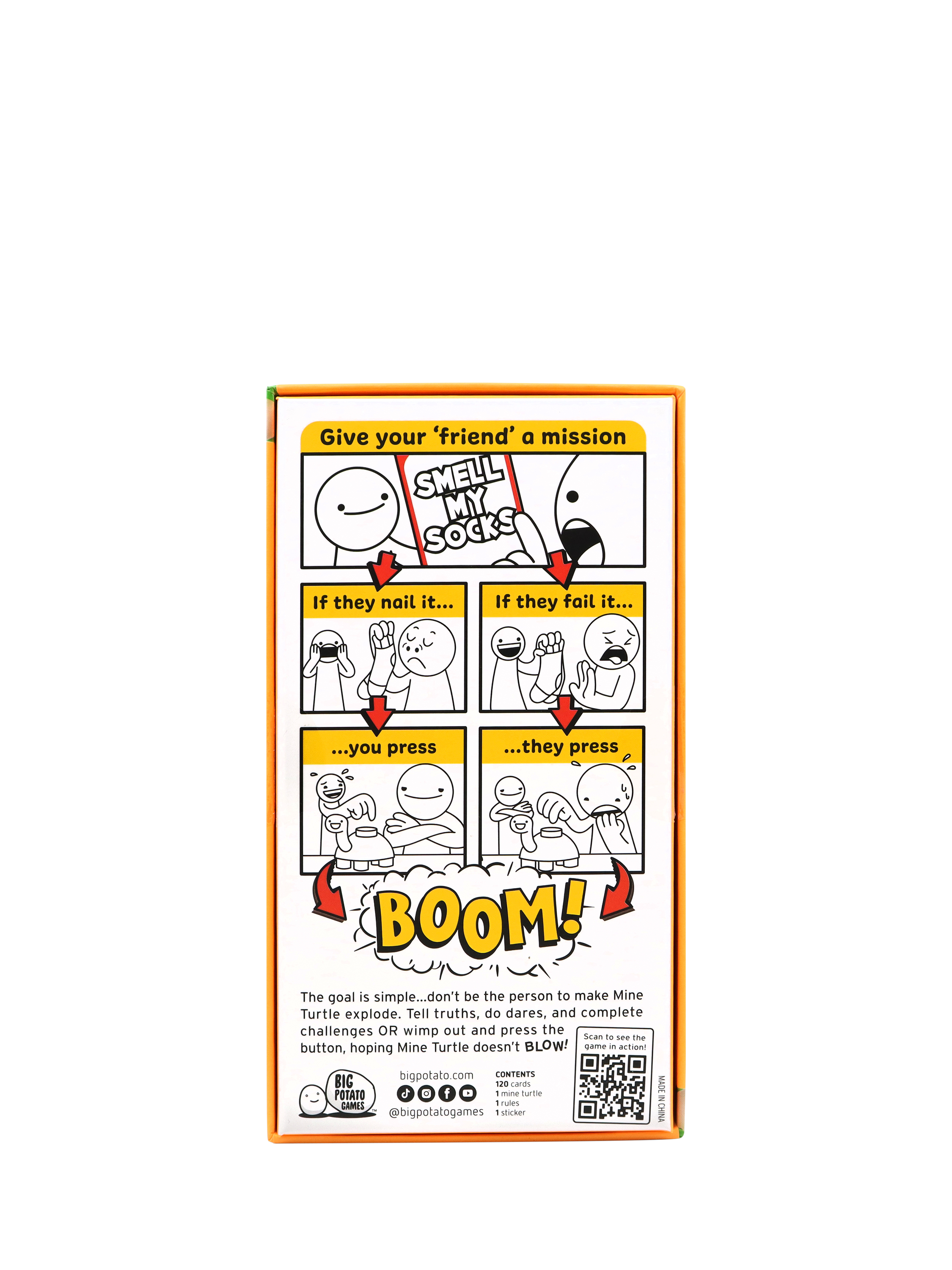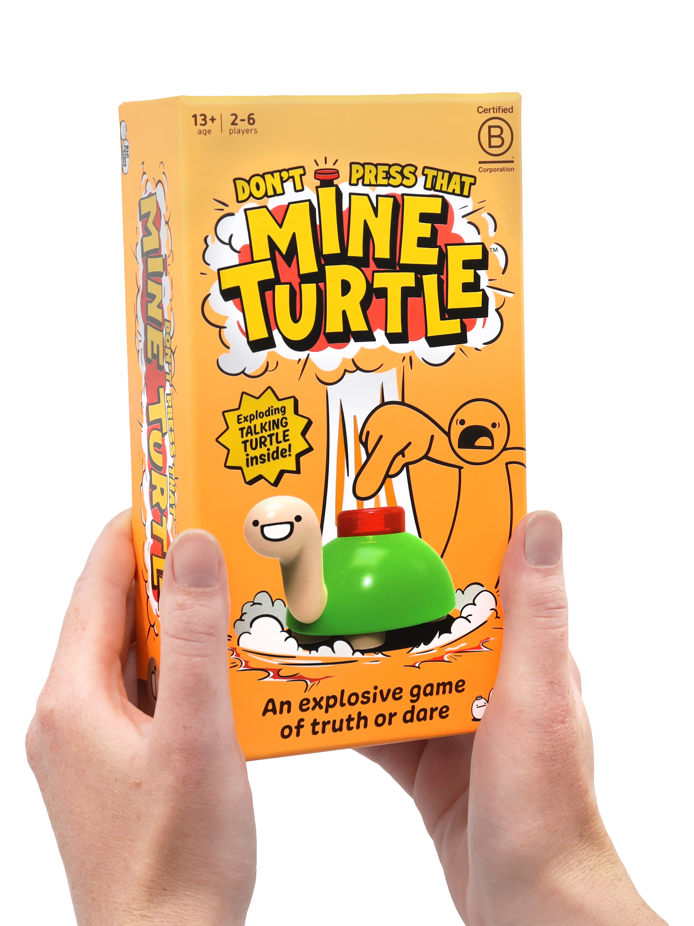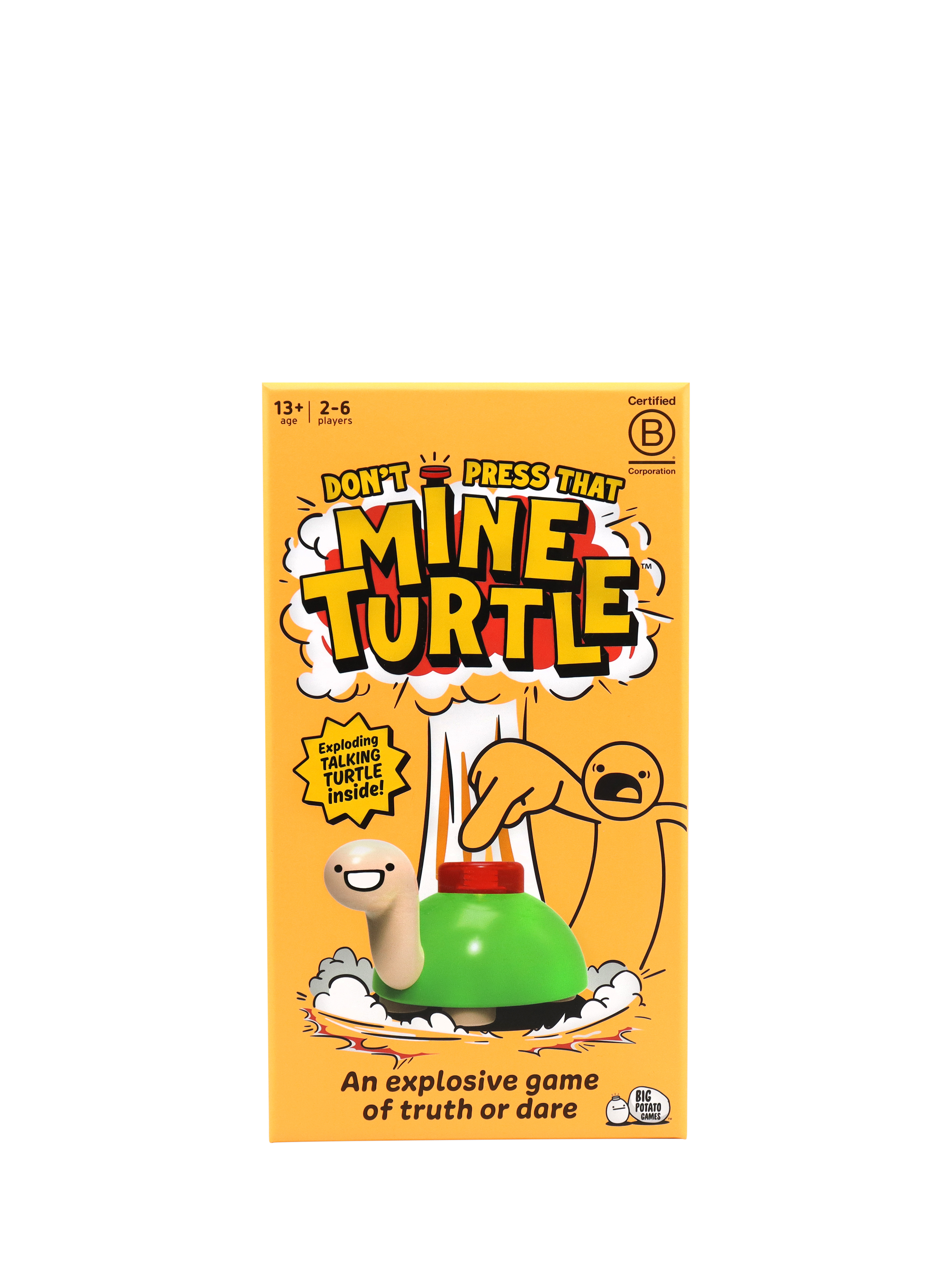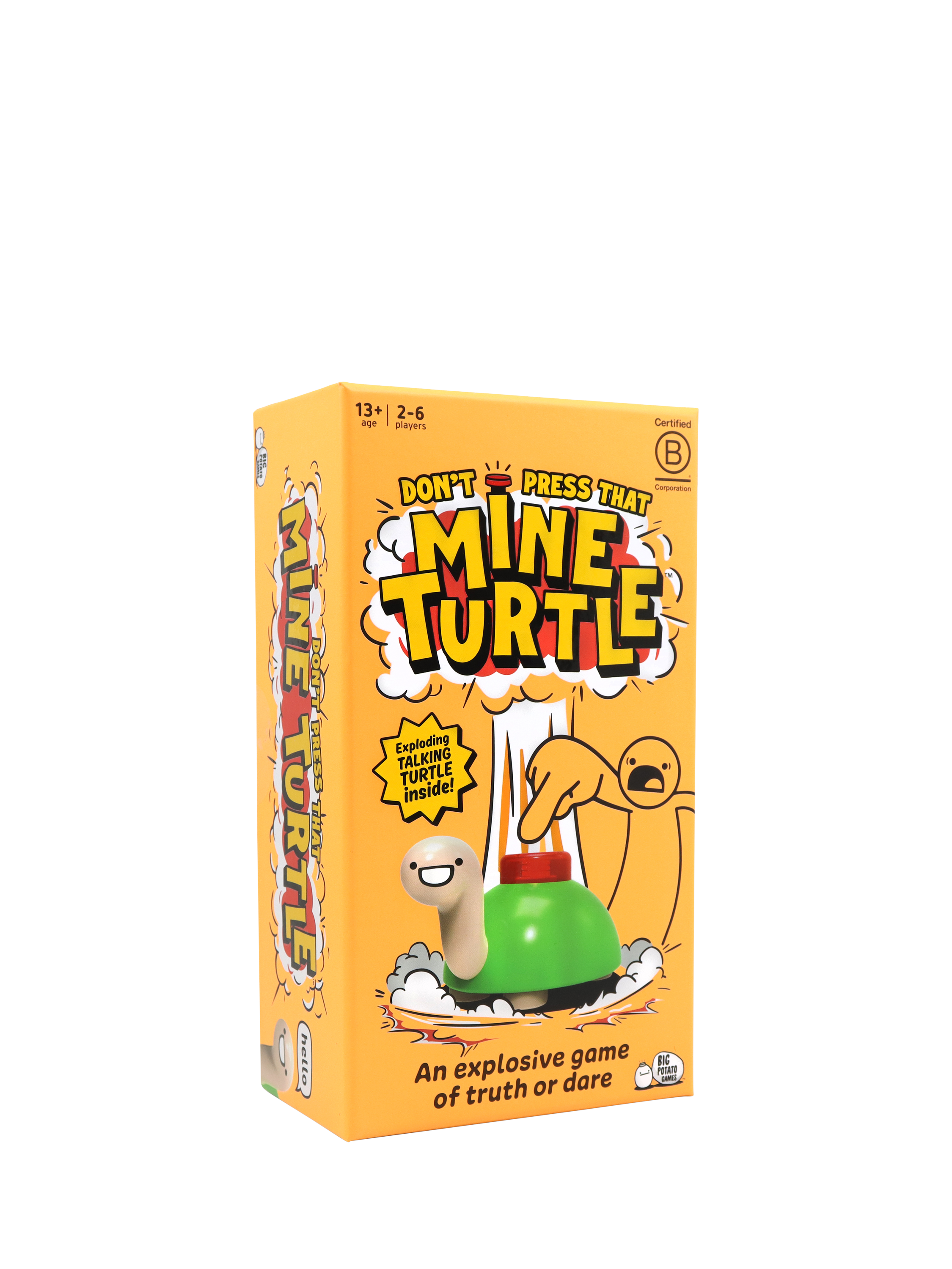 Hello BOOM! The goal is simple: Don't be the person who makes Mine Turtle explode. Tell truths, do dares, and complete challenges to dodge pressing Mine Turtle. But chicken out, and you're going to have to push that button, praying Mine Turtle doesn't blow! It's a truth-or-dare game, plus, it comes with a super-cute but highly explosive talking turtle.