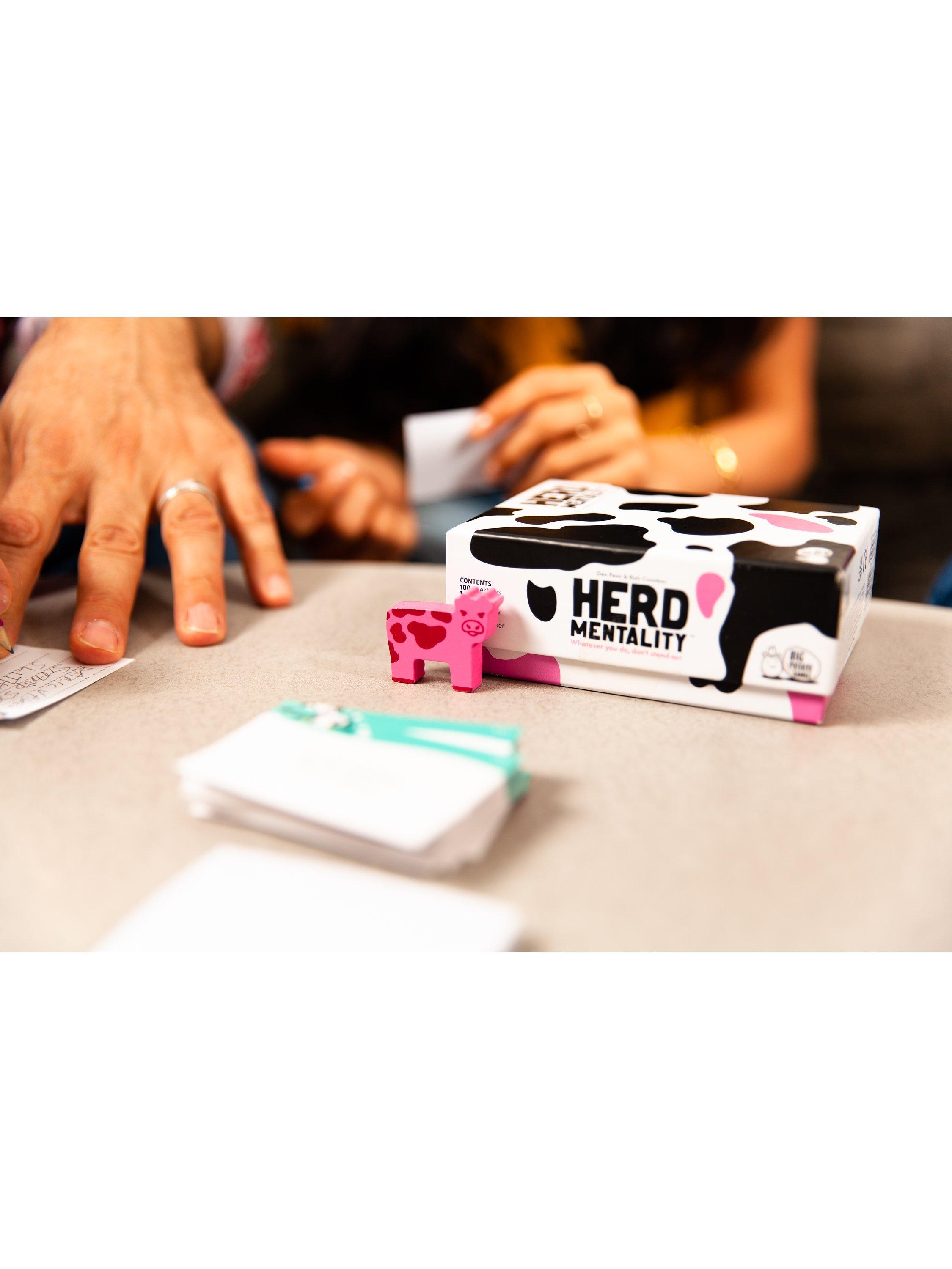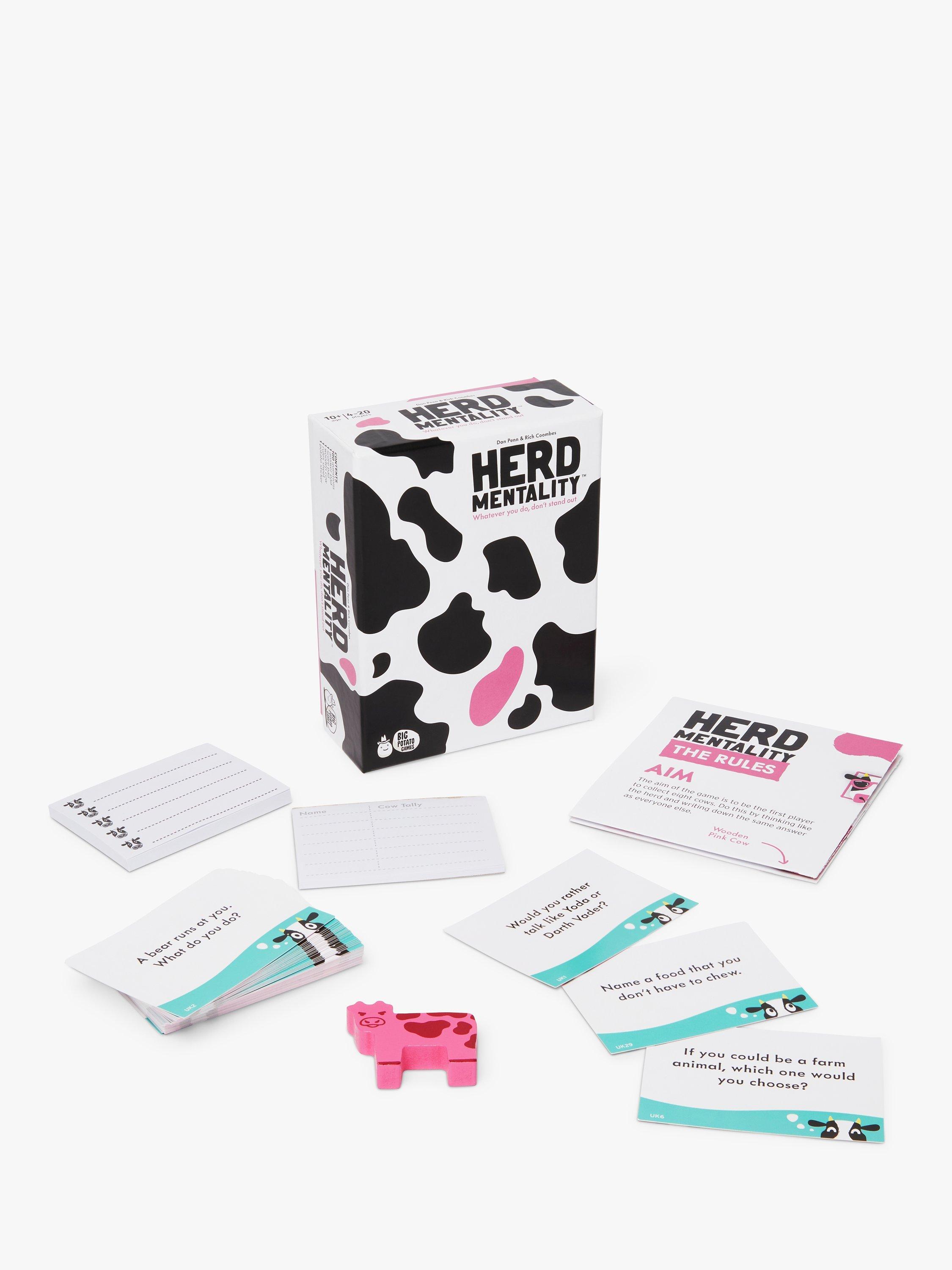 Herd Mentality is a party game with a simple black and white mission: write down the same answer as everyone else. It starts with a random question, then everyone secretly writes down an answer. If your answer is in the majority, you win cows. But if your answer is the odd one out, you'll land the Pink Cow and your herd will be worthless - unless you can pass it on to someone else!
