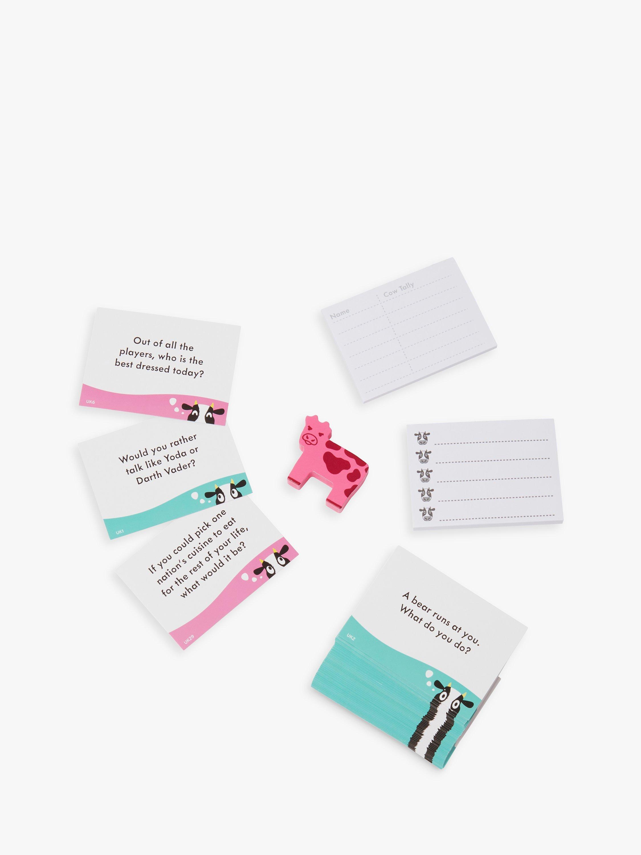 - 100 question cards, 1 answer pad, score pad, 1 wooden cow, 1 rules