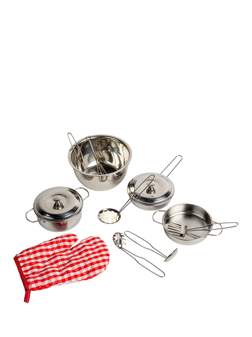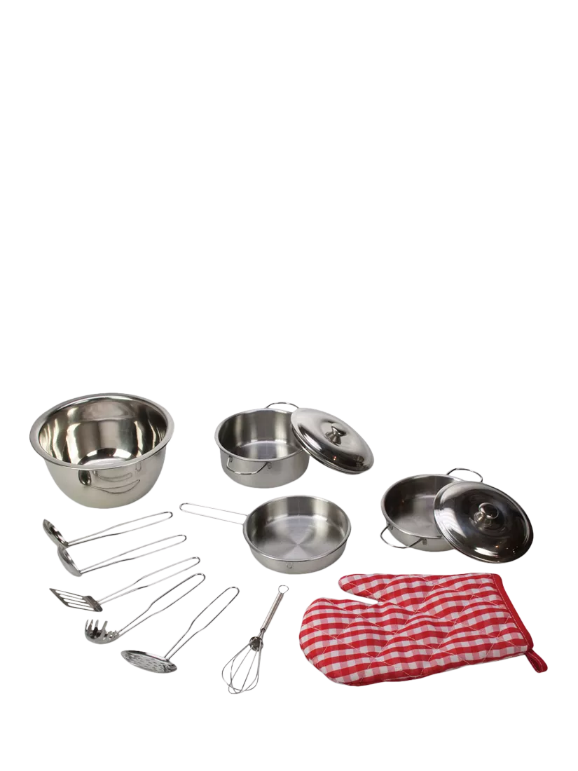 Perfectly sized for little hands, this professional-looking Kids Kitchen Set will inspire and delight young chefs in equal measure! Use in either the play kitchen or the real-life kitchen with Mum and Dad. The stainless steel pots, pans, and ladles come complete with a handy gingham oven mitt. A great way to educate little ones about every step of preparing, creating and cooking in the kitchen!
