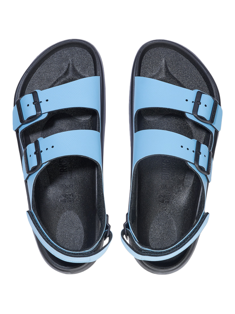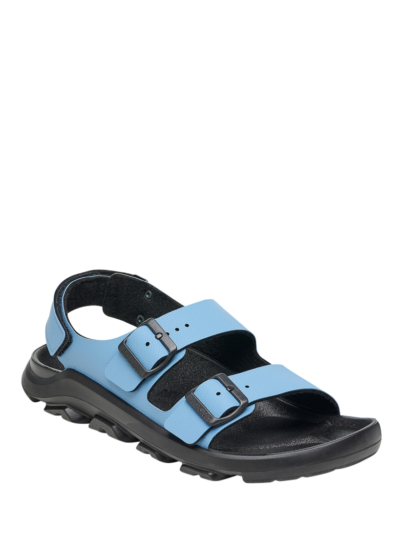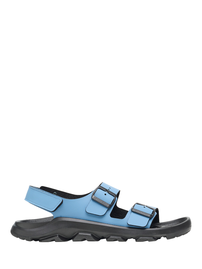 The Birkenstock Mogami is the ideal match for adventures of any kind thanks to the waterproof footbed with toe protection and the highly functional sole which is injected into the footbed and upper in two layers. This makes the sandal extremely flexible and durable in any terrain. The polyurethane sole is affixed to the footbed in two layers and therefore offers maximum flexibility, grip, and durability. The upper is made from the skin-friendly, hard-wearing synthetic material Birko-Flor.