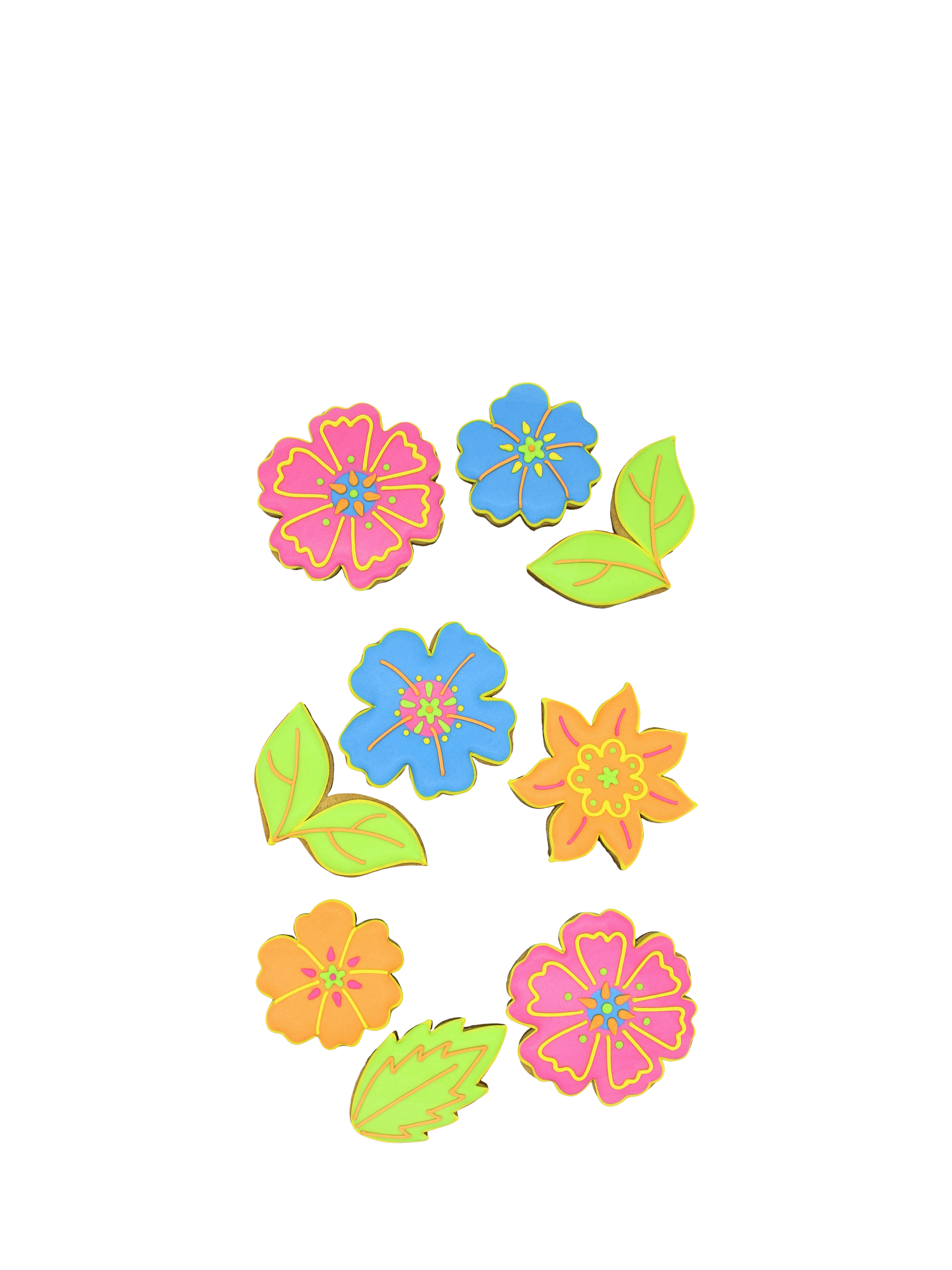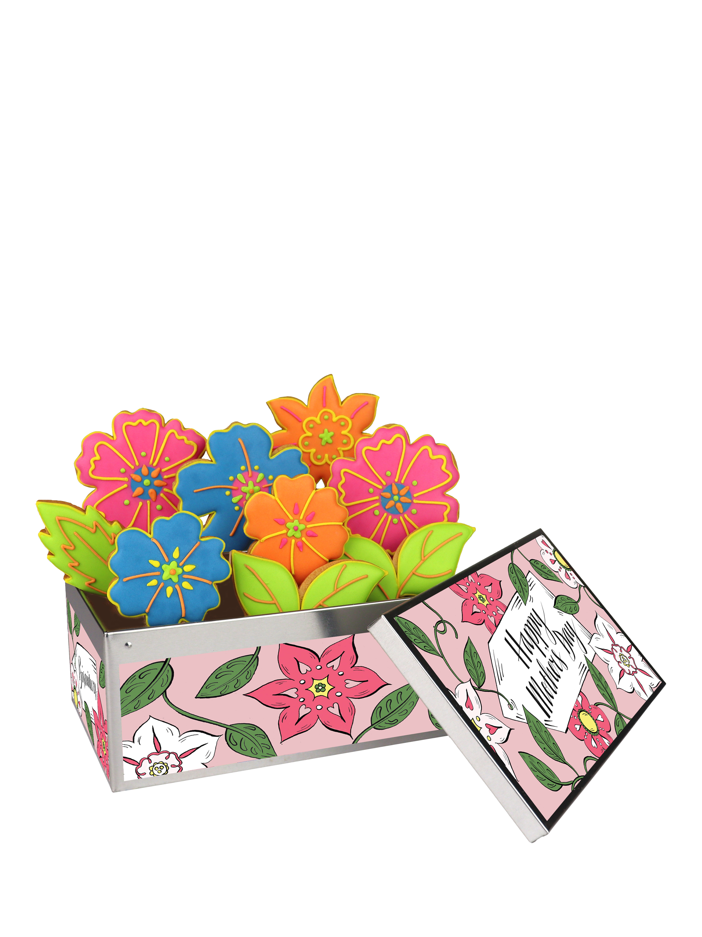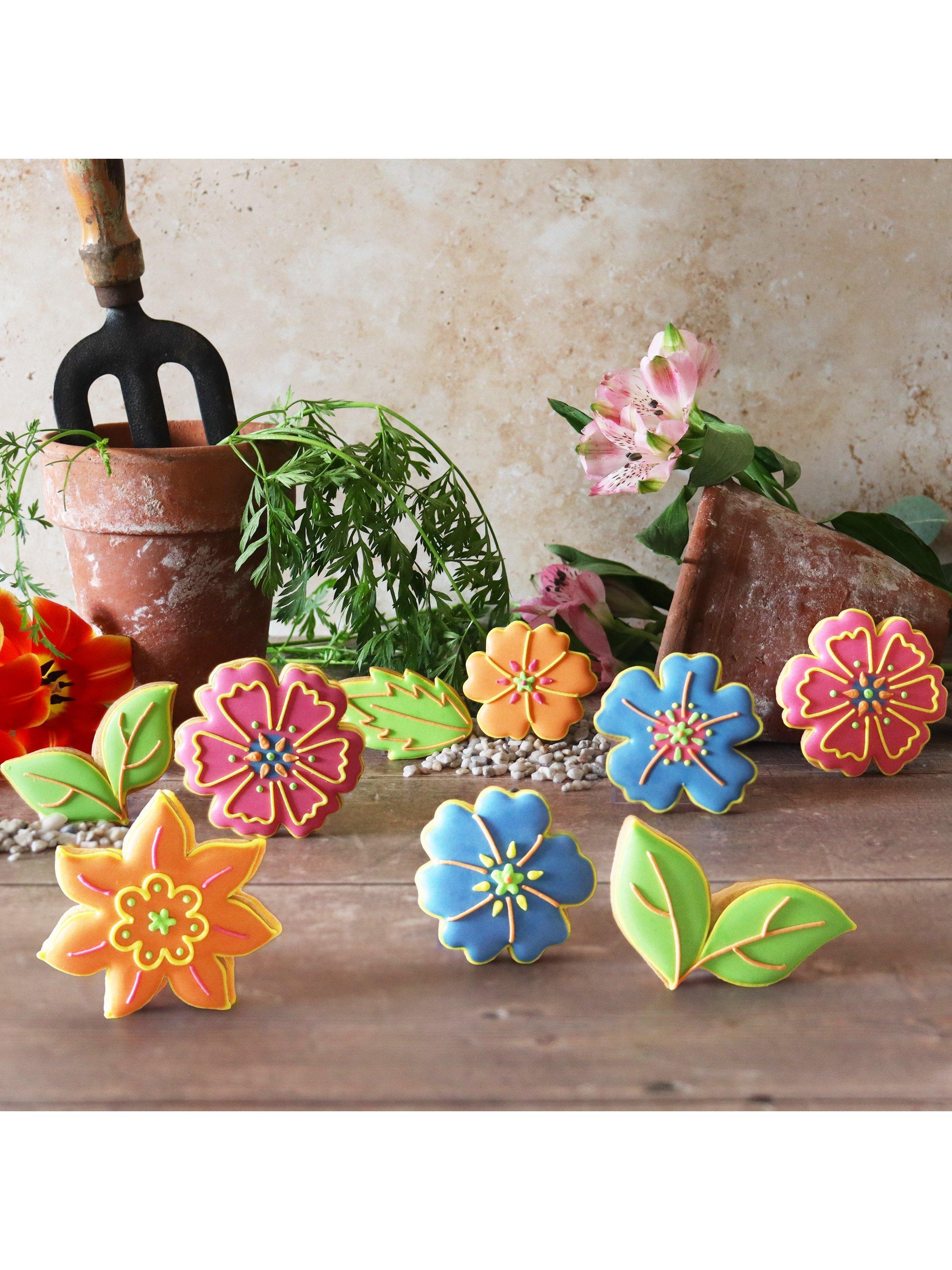 Nine hand-iced biscuits in various flower and leaf designs. When the biscuits are finished they'll have a lovely keepsake tin to enjoy.