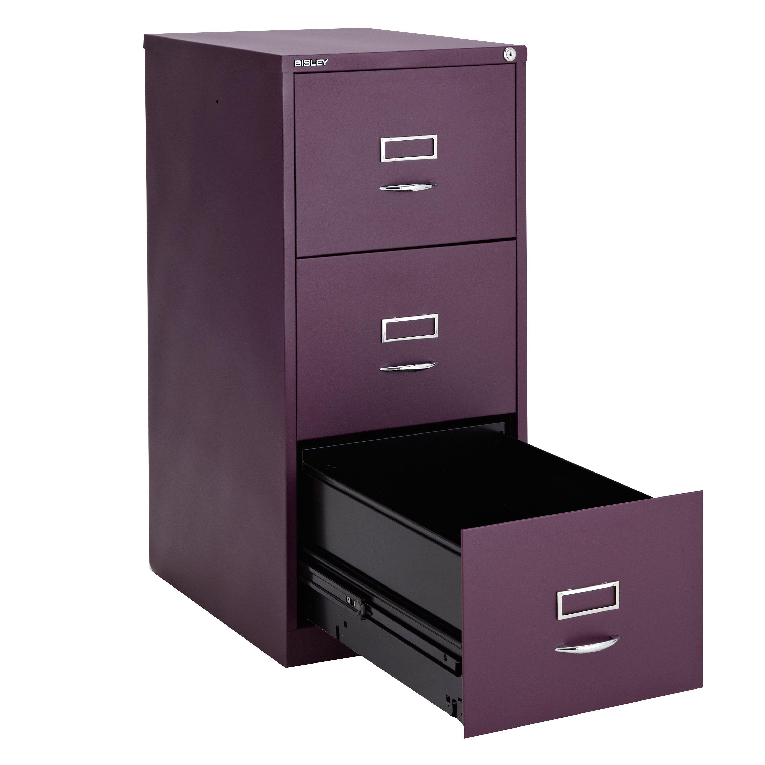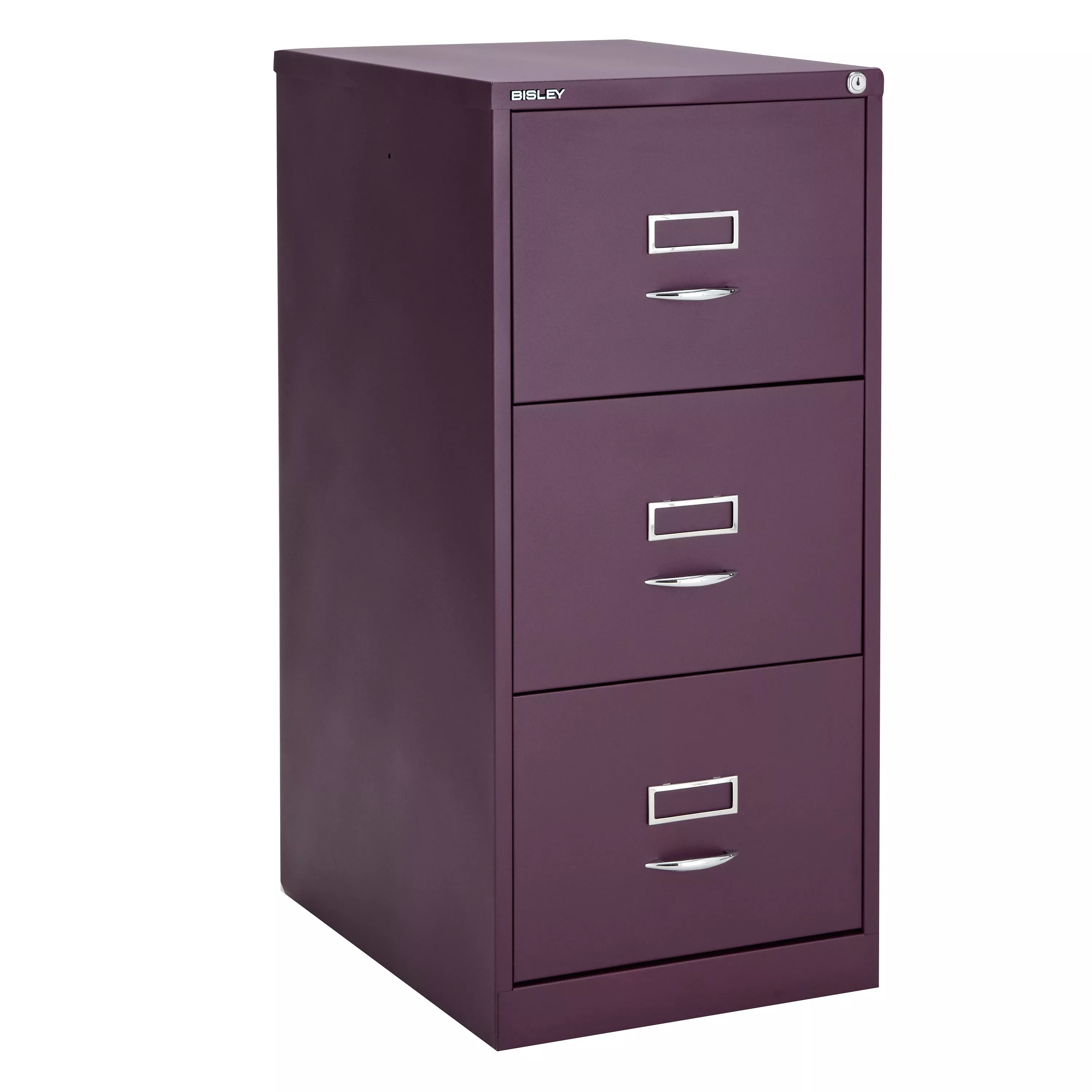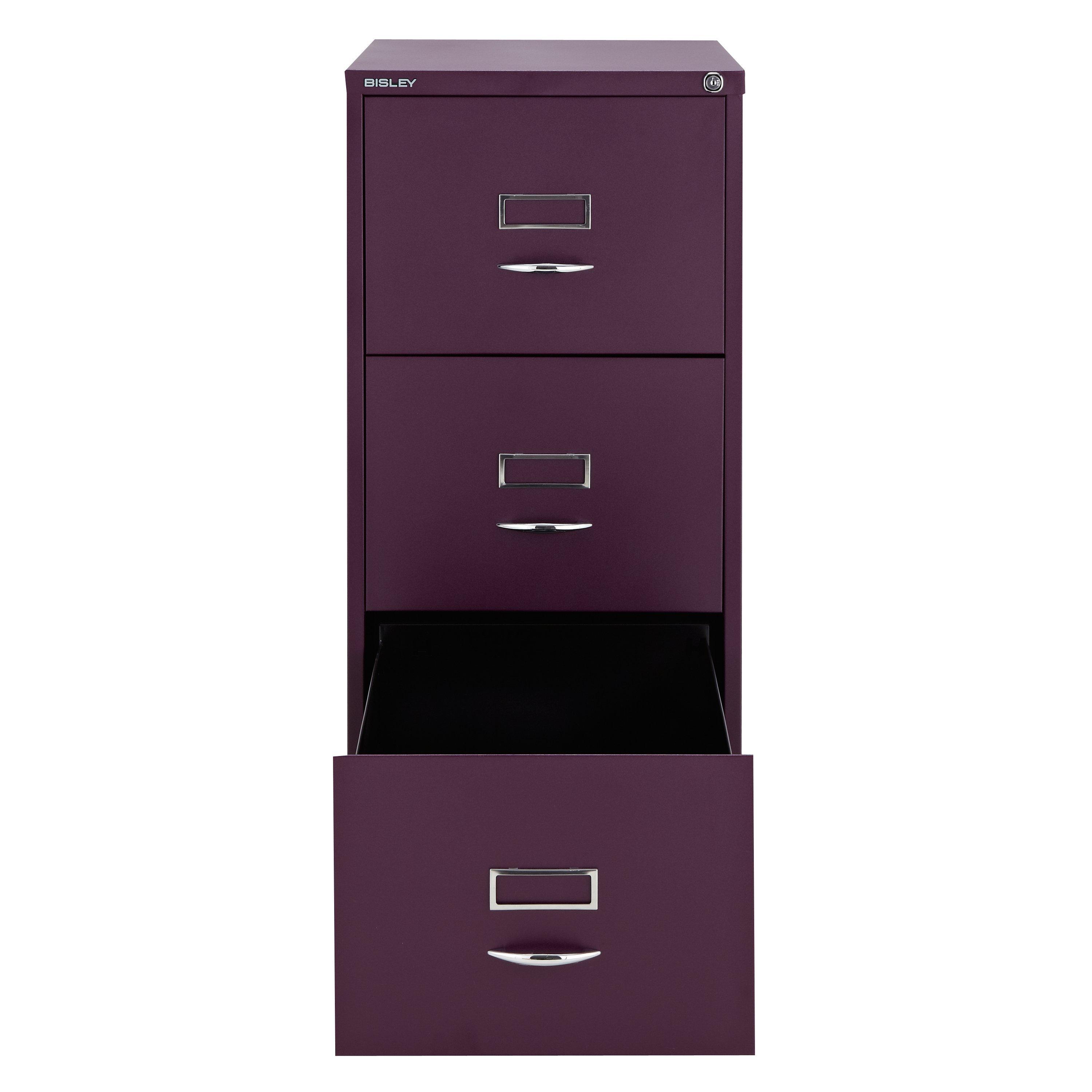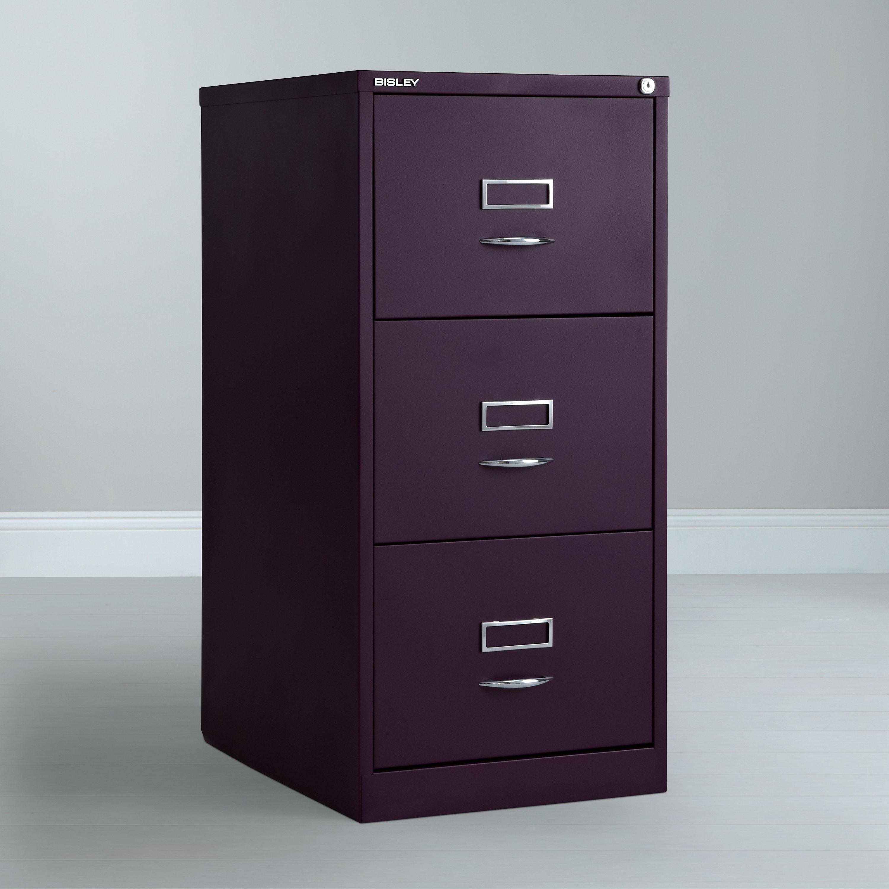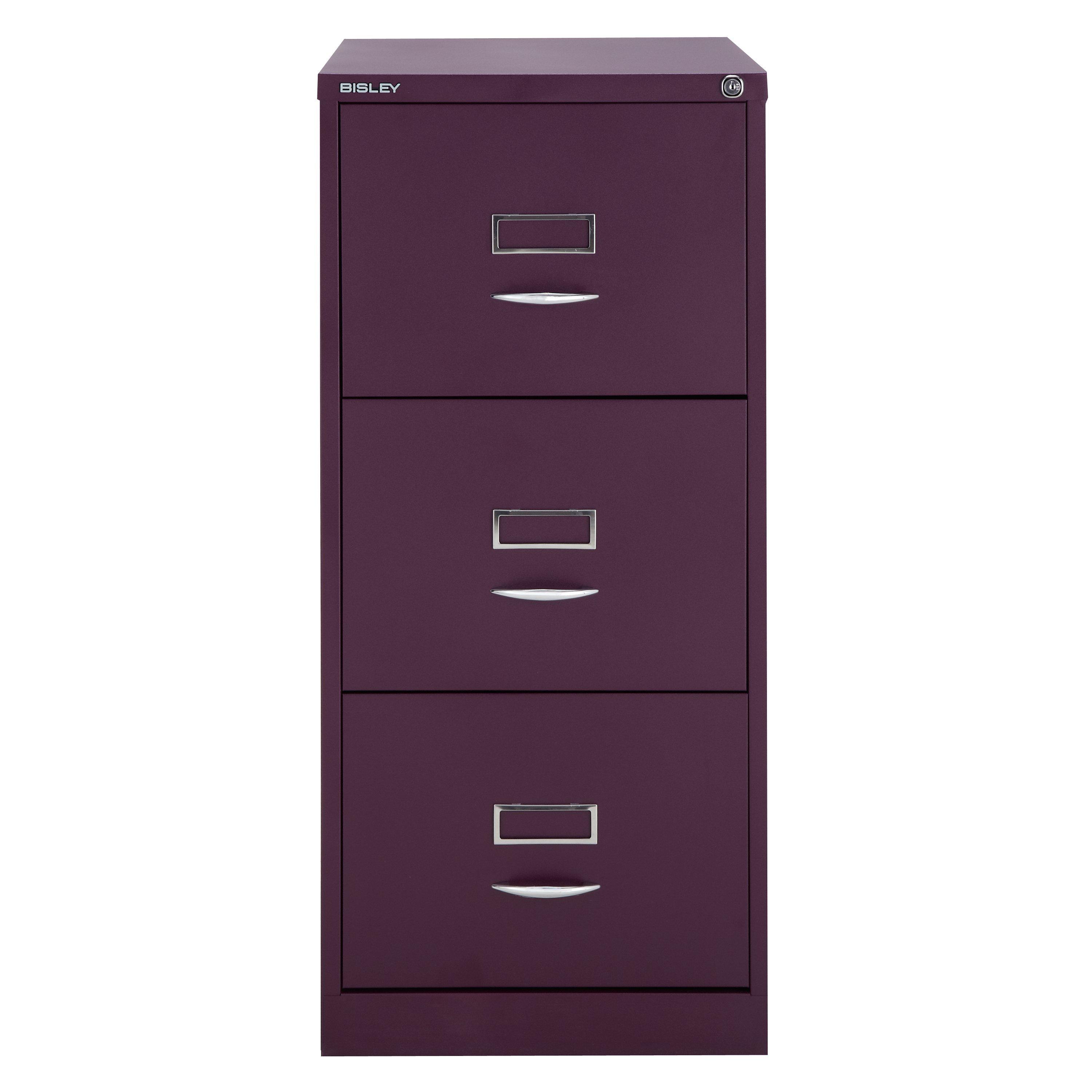This classic three drawer filing cabinet from Bisley provides a practical and stylish way to store important work documents. Made from durable steel in a range of exclusive painted finishes, it's suitable for Foolscap suspension files only, that are hung directly on the drawer sides. Each drawer extends fully to give you easy access to its entire contents, and a metal card holder at the face of each drawer ensures efficient labelling. A top lock provides additional security.