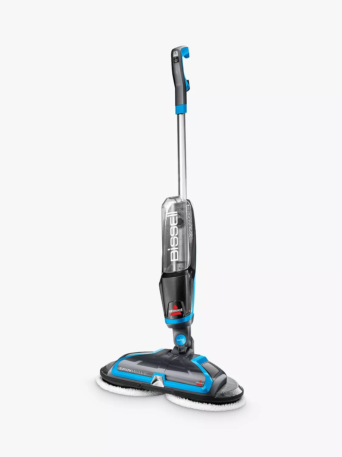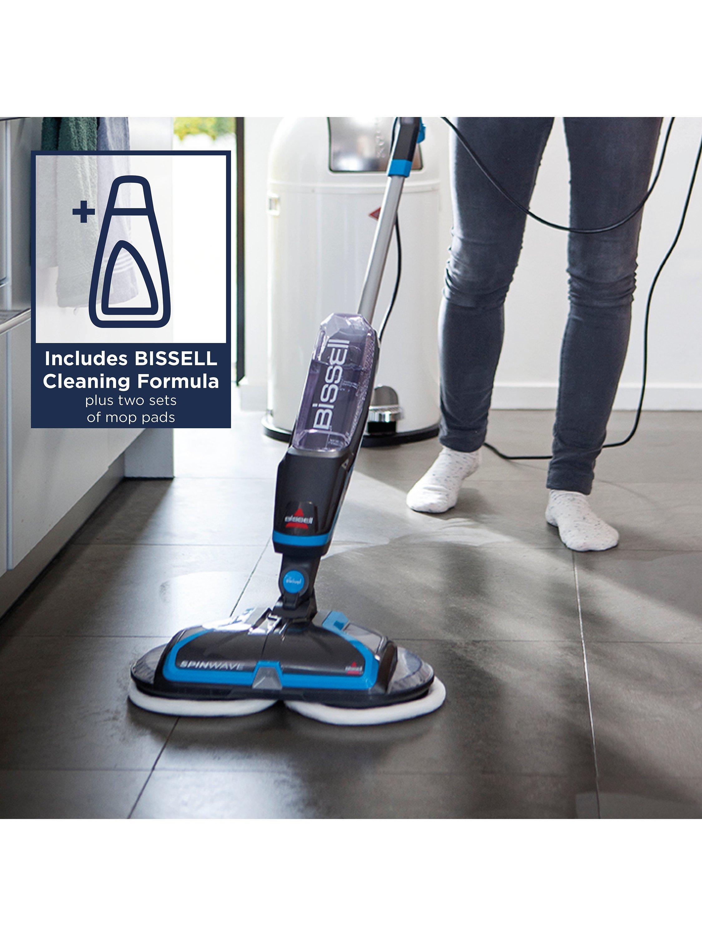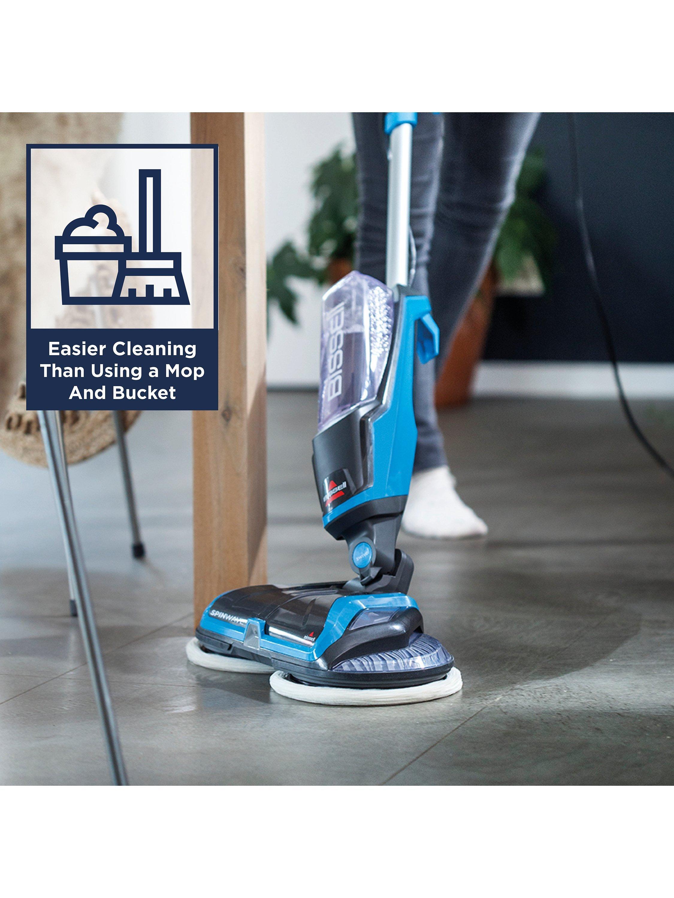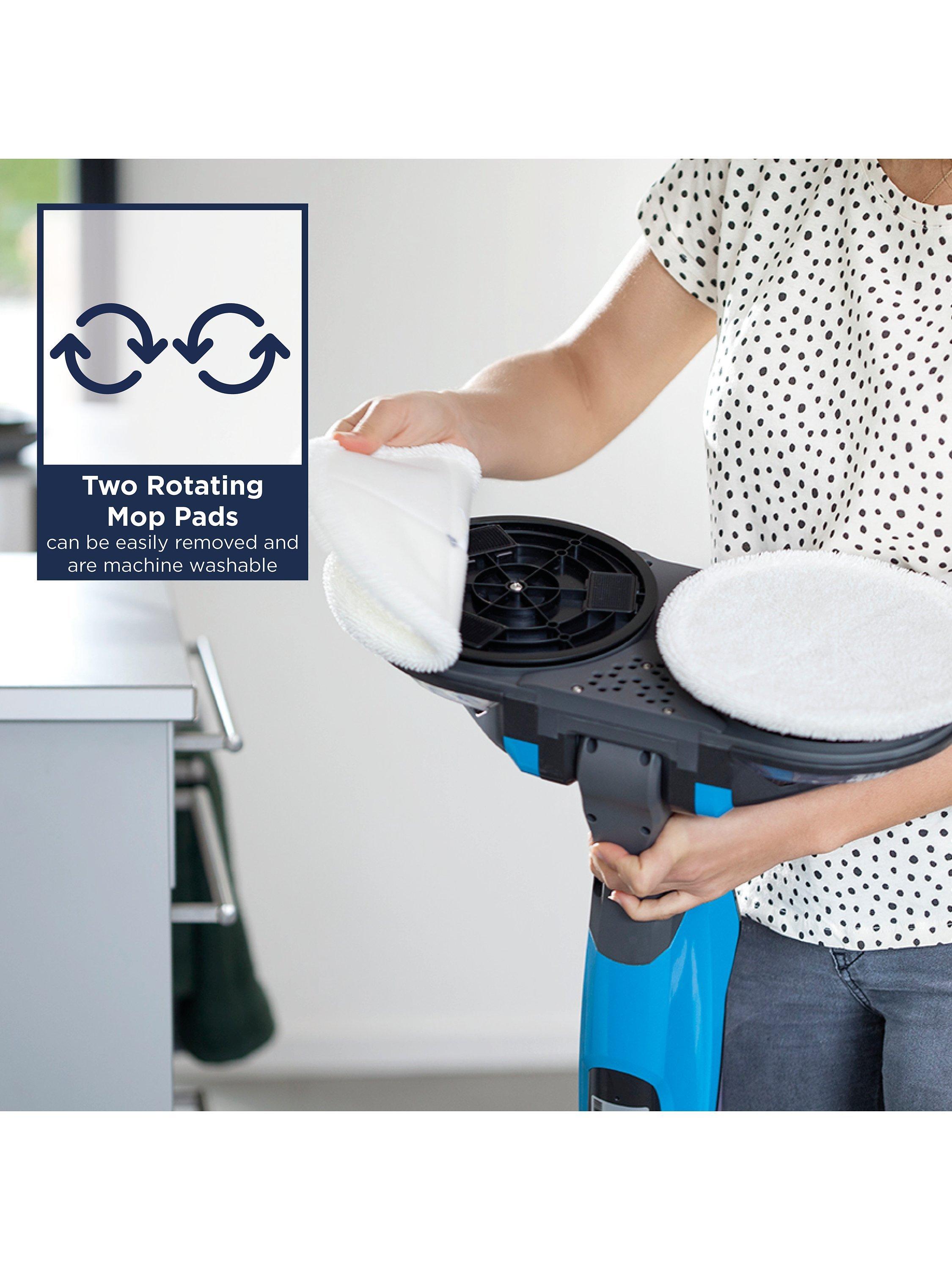 Powered rotating spray mop, for washing hard floors including tiles, stone, laminate and delicate wood.