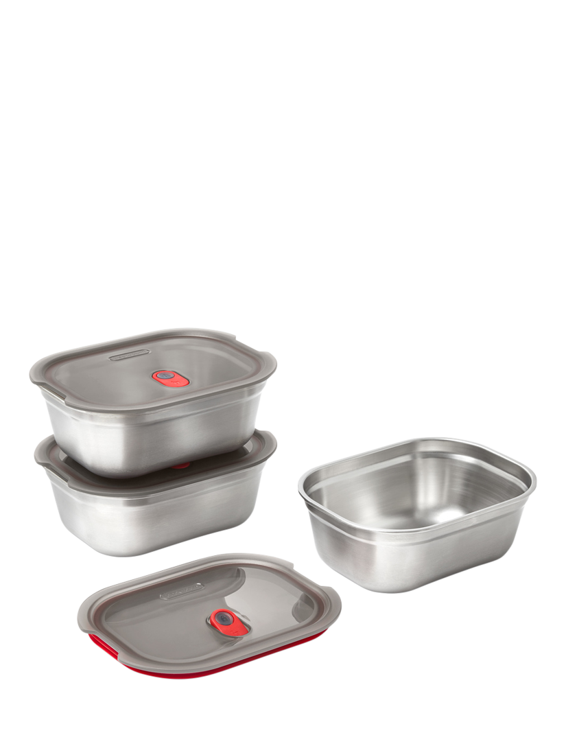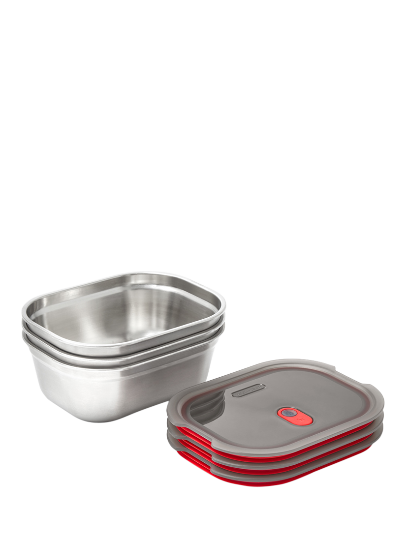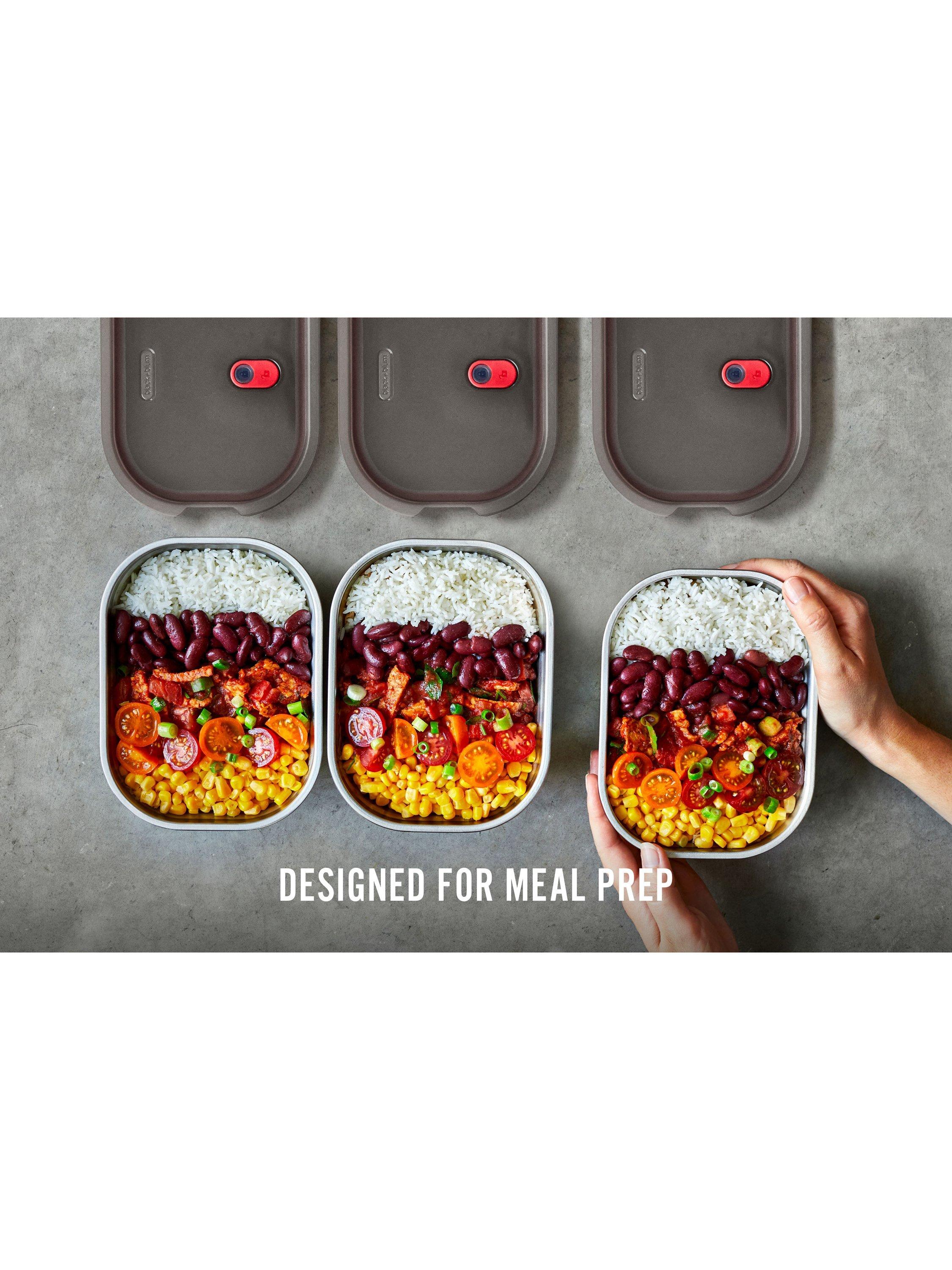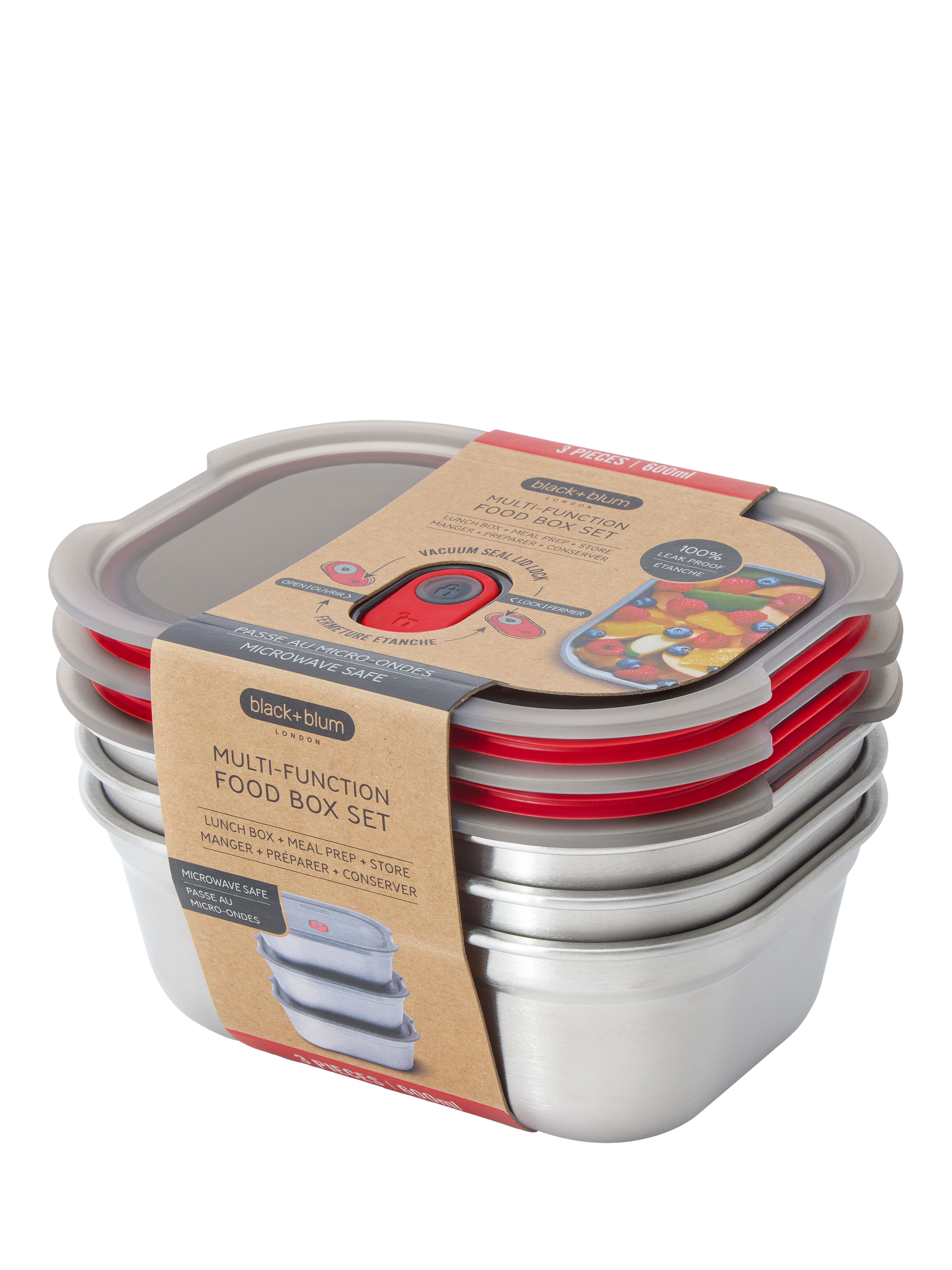 A 3-piece set of Black+Blum's microwaveable 3-in-1 stainless steel 600ml lunch box. This multi-functional box is a lunch box, oven dish and food storage all in one. Made from durable stainless steel and polypropylene, it's vacuum-sealed to make it 100% leak-proof and airtight for storage. It's also oven, freezer and dishwasher safe. An all-round winner.