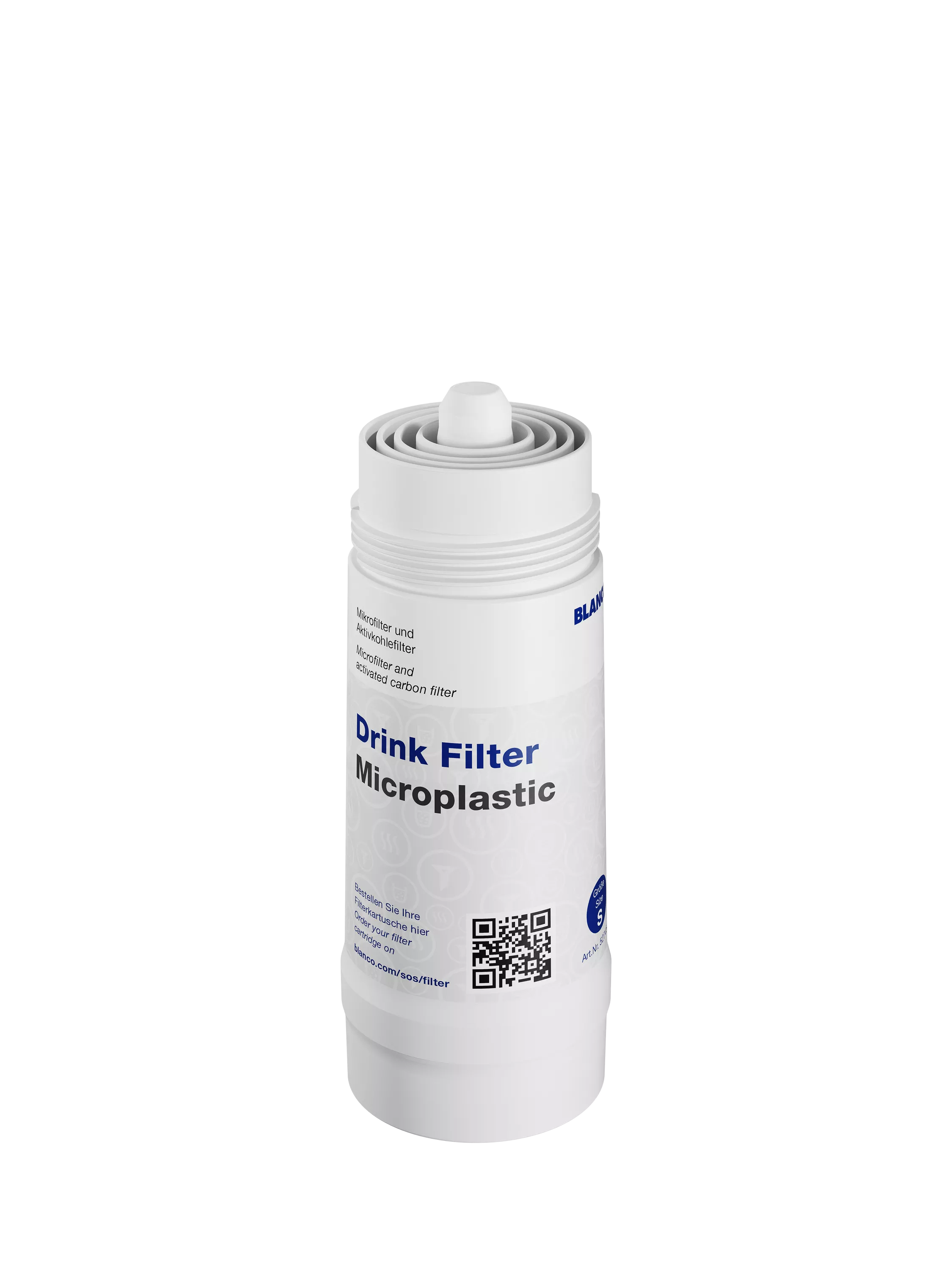 The micro filter reduces microplastic and other particles above 0,001 mm. The integrated active carbon filter reduces particles and any agents which may affect the smell and taste of drinking water such as chlorine. The filter is perfectly suited for BLANCO water or filter systems.