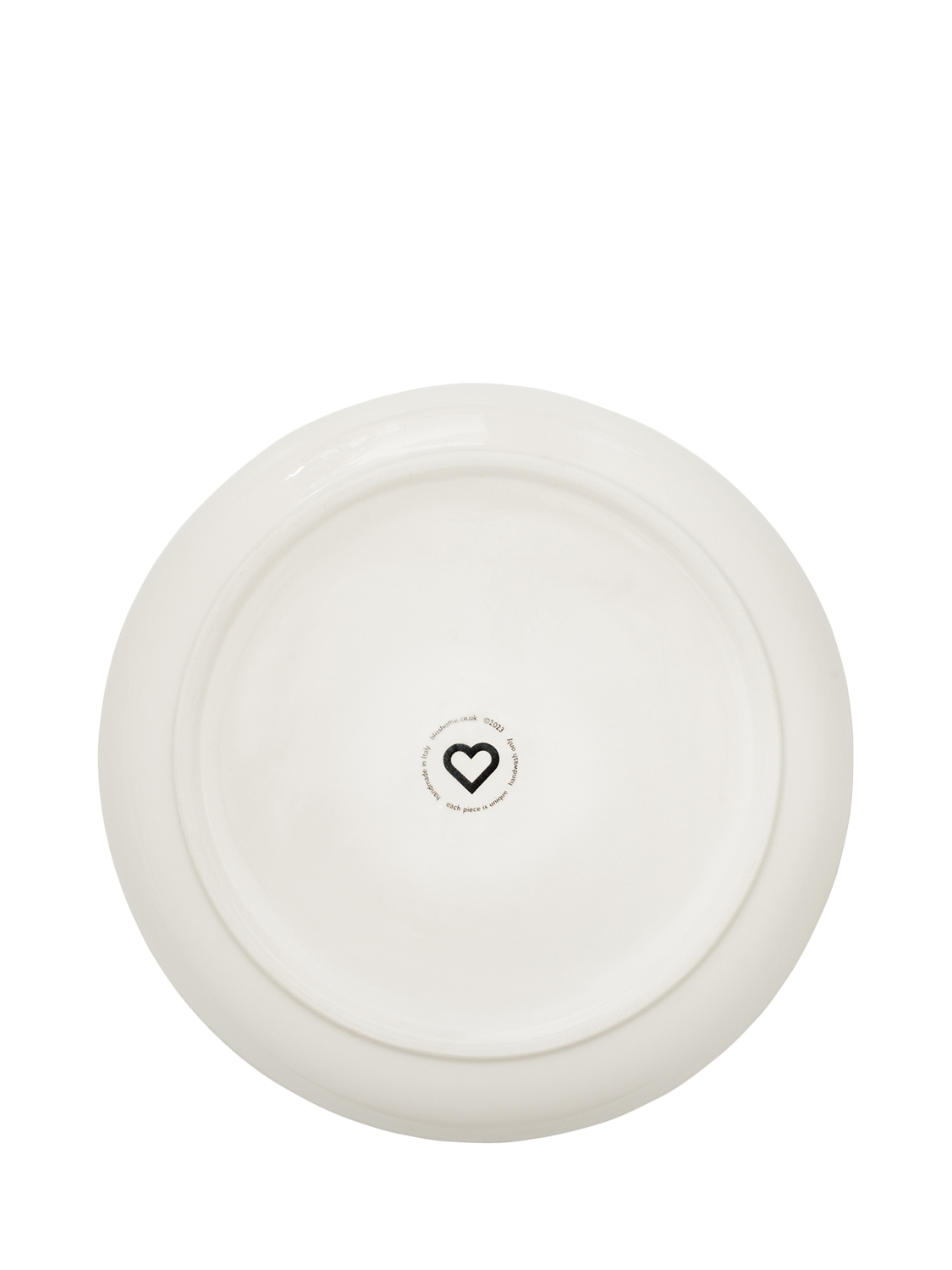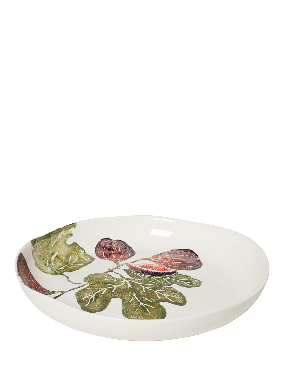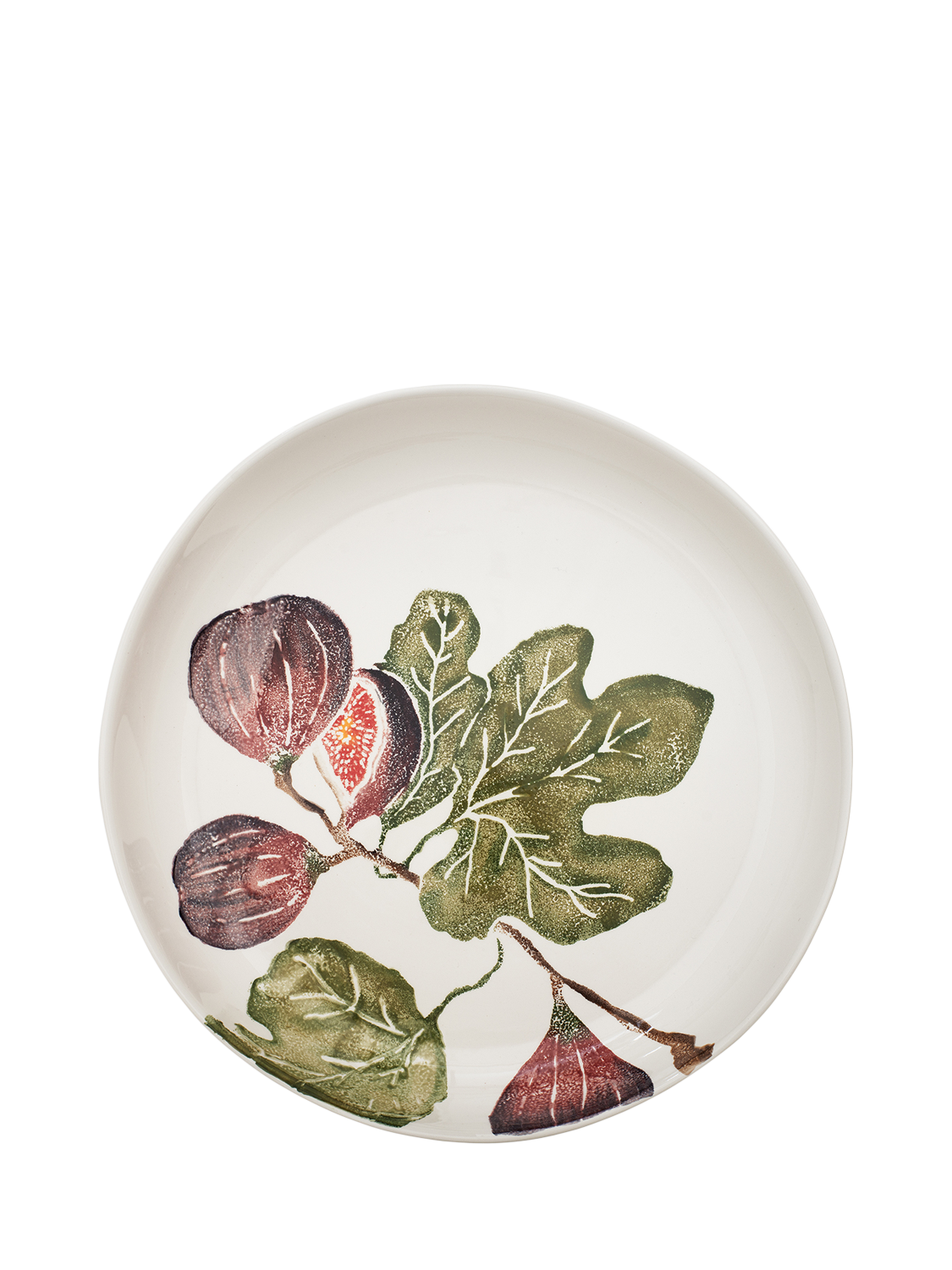 A round, shallow serving platter from BlissHome featuring a delicate fig illustration on earthenware. The decoration is hand-applied by skilled artisans in a family-run factory in Italy using a combination of sponging and reactive glazes. Due to the method of production, each piece is unique.