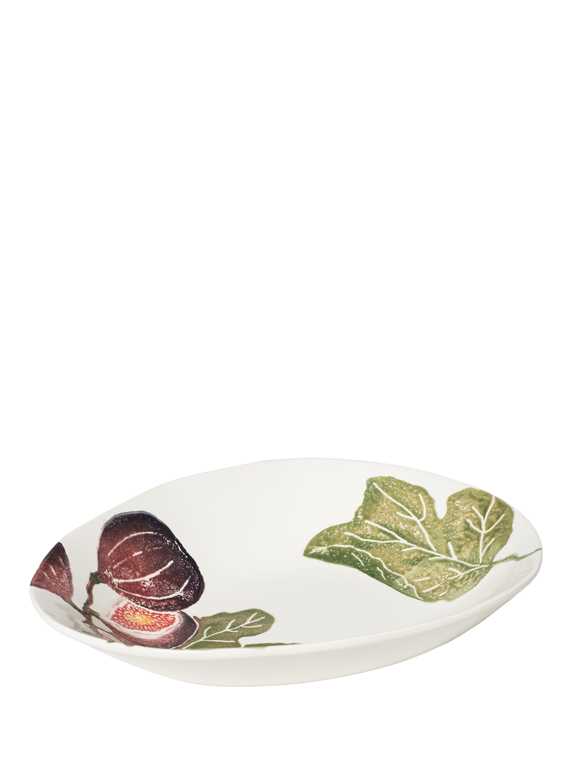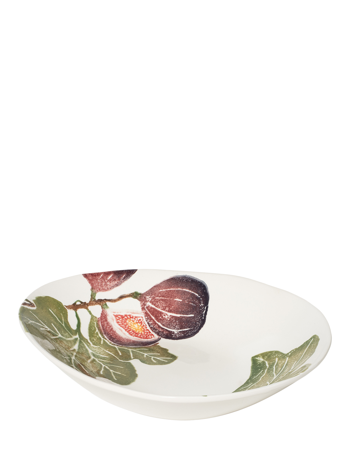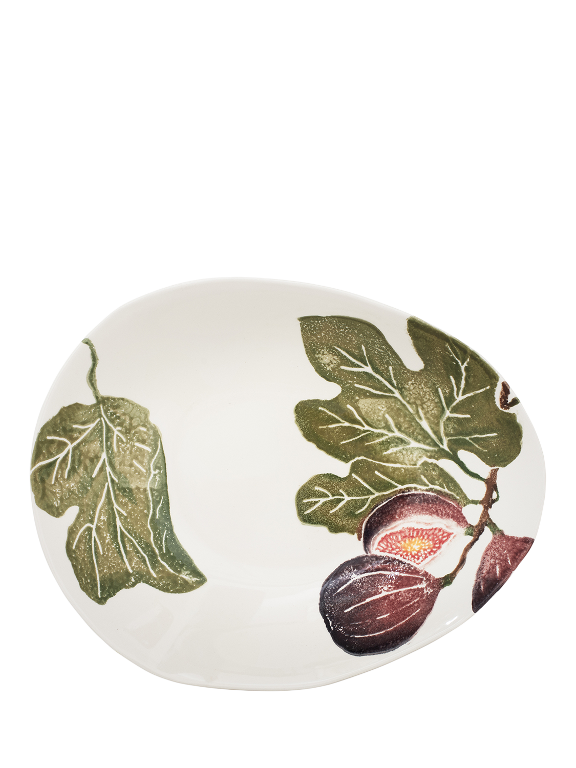 An organic-shaped serving bowl from BlissHome featuring a delicate fig illustration on earthenware. The decoration is hand-applied by skilled artisans in a family-run factory in Italy using a combination of sponging and reactive glazes. Due to the method of production, each piece is unique.