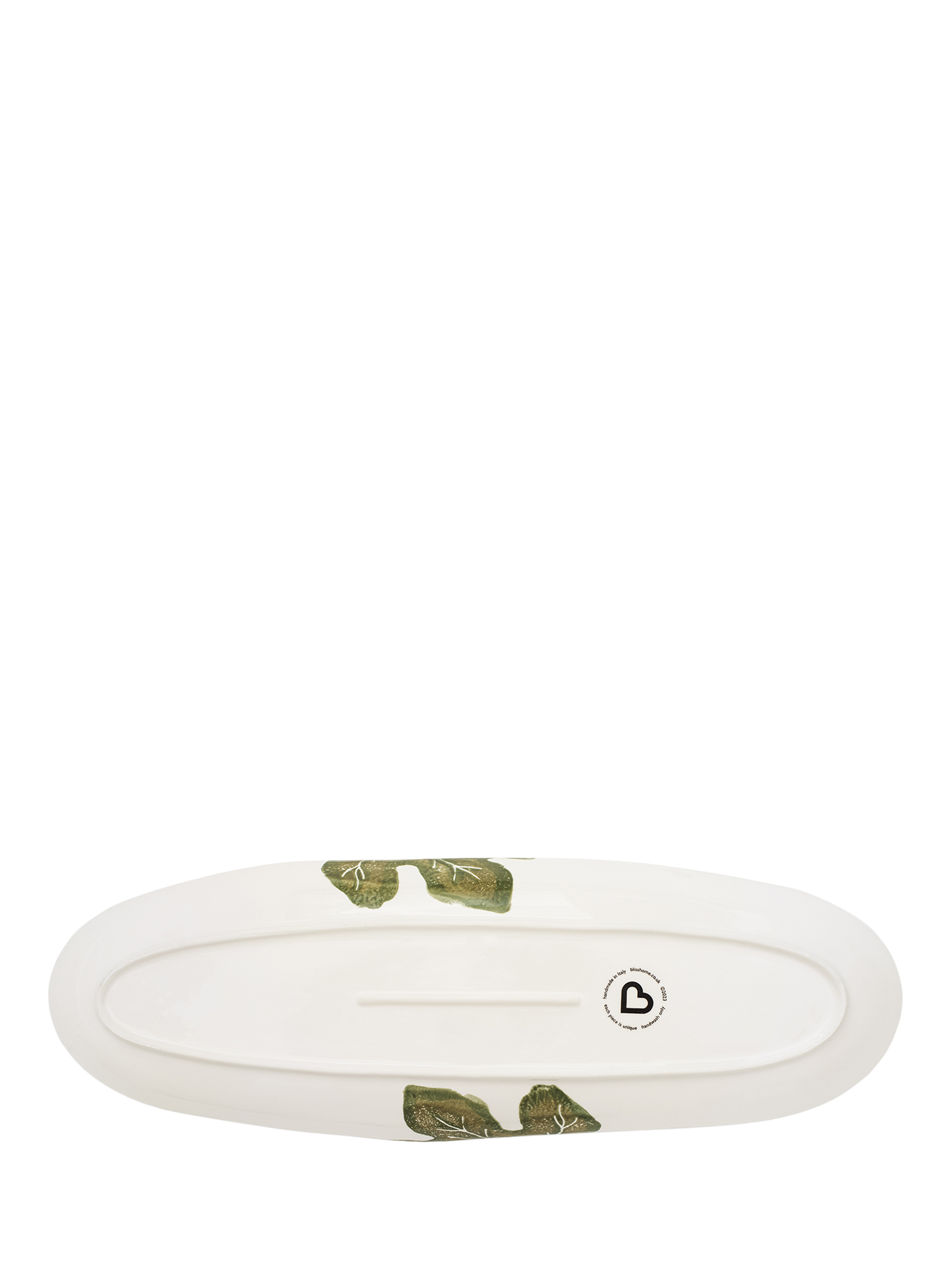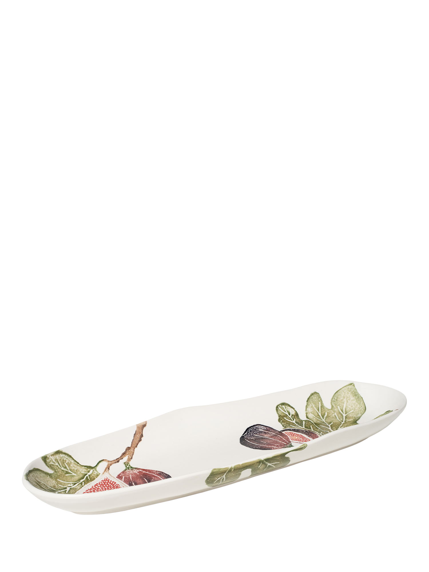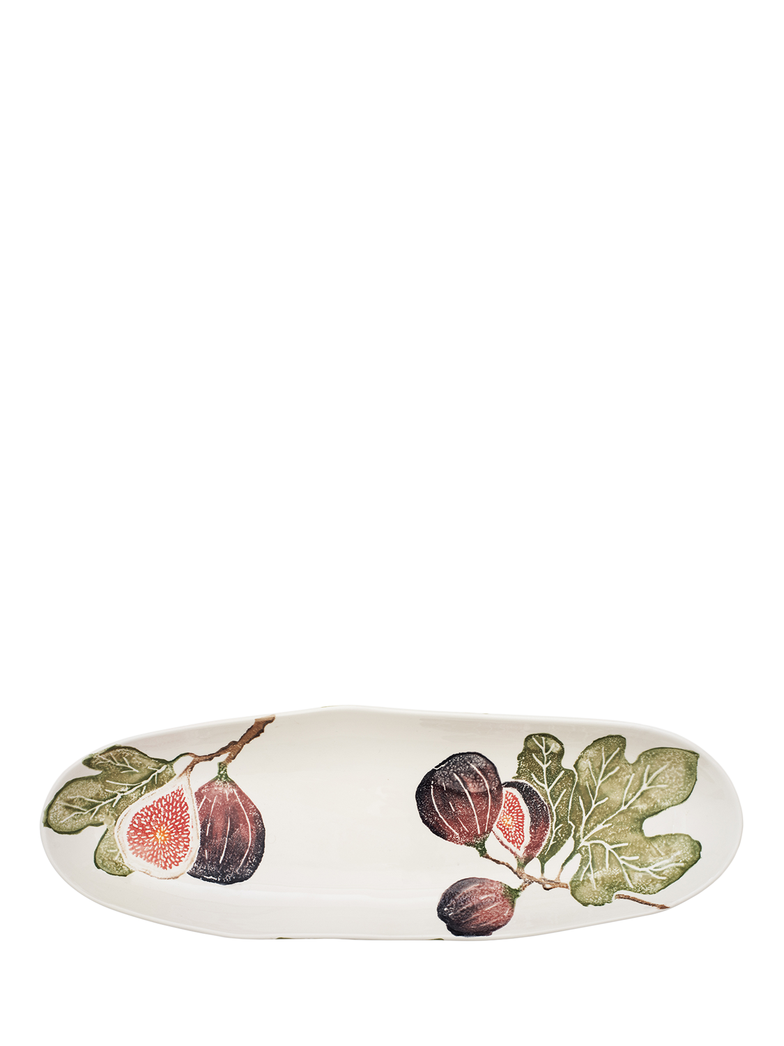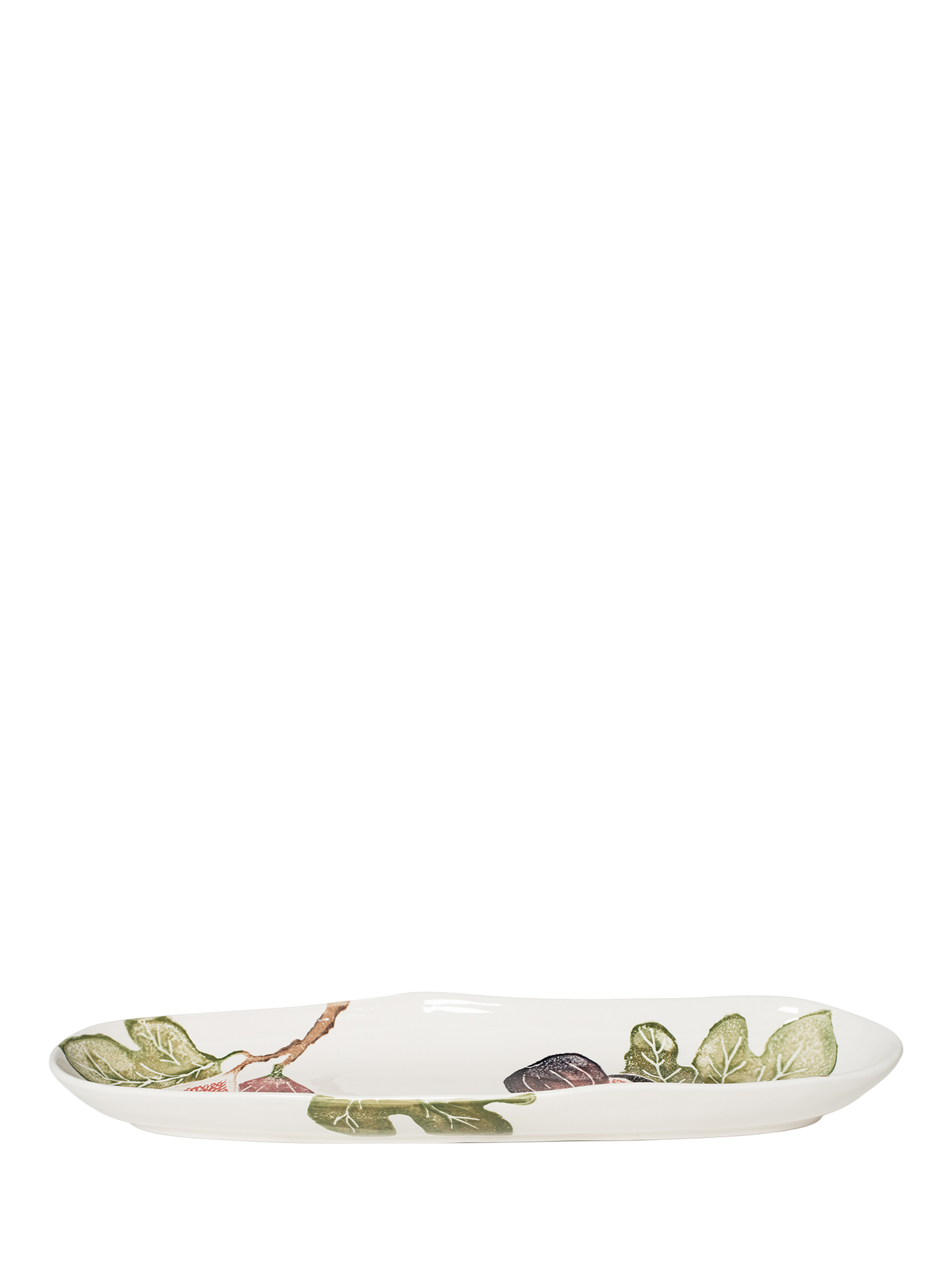 An organic-shaped, shallow serving platter from BlissHome featuring a delicate fig illustration on earthenware. The decoration is hand-applied by skilled artisans in a family-run factory in Italy using a combination of sponging and reactive glazes. Due to the method of production, each piece is unique.