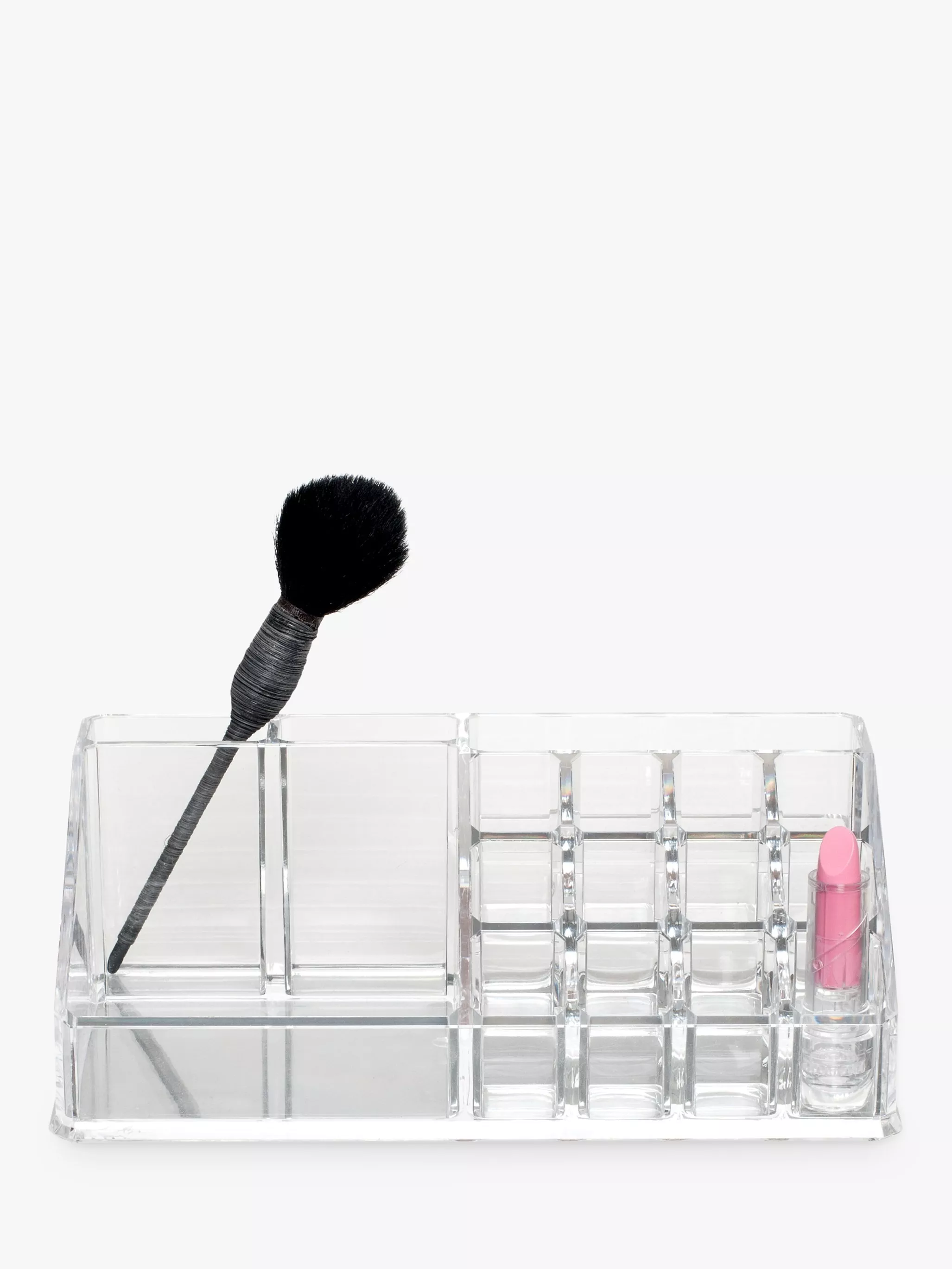 Featuring 12 sections for your favourite lipsticks; 2 compartments for your make up brushes, mascara and other long products; 2 larger compartments that are great for your foundations, face creams, powders or nail polishes.
