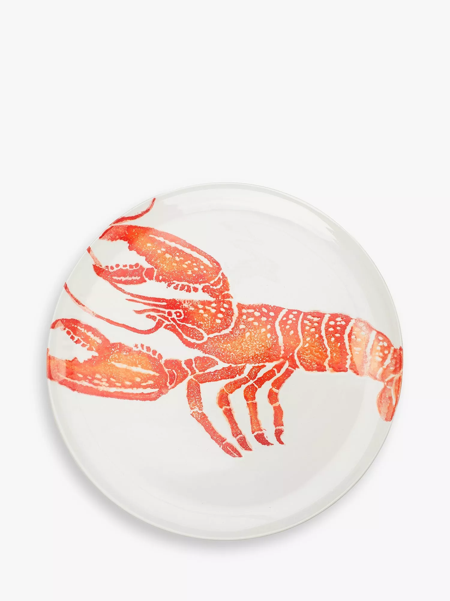 This round platter is decorated with an orange lobster and complements other items in the Creatures collection from BlissHome. The decoration is hand-applied by skilled artisans in a family-run factory in Italy using a combination of sponging and reactive glazes. Due to the method of production, each piece is unique.