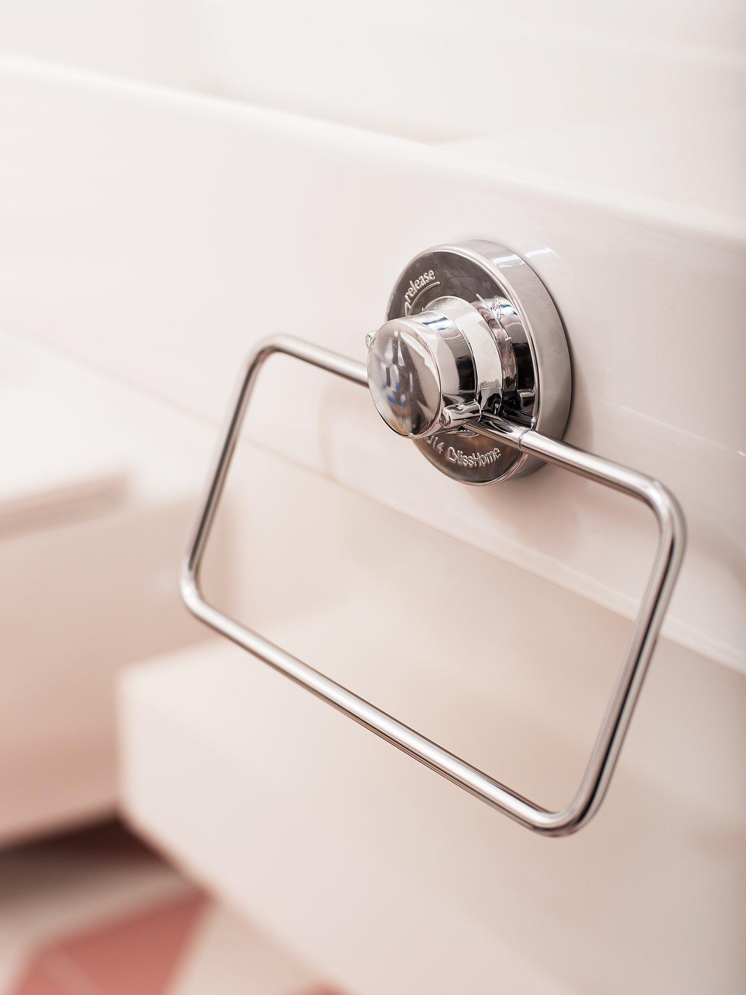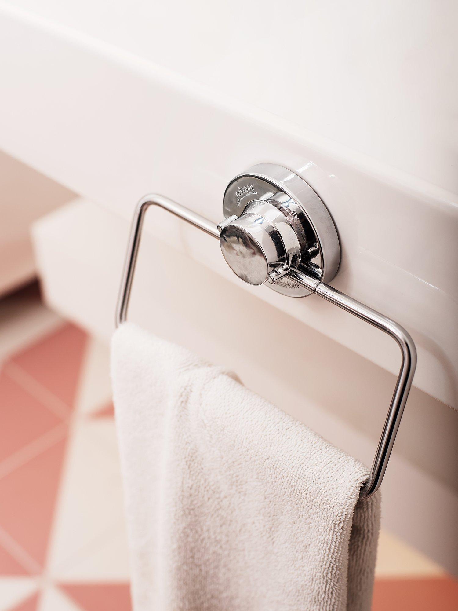 This chrome-plated wire hand towel ring is a new addition to the Lock N Roll collection. It attaches with a suction cup on non-porous surfaces but also comes with a clear sticky pad so you can fix it to non-smooth or uneven surfaces if needed.