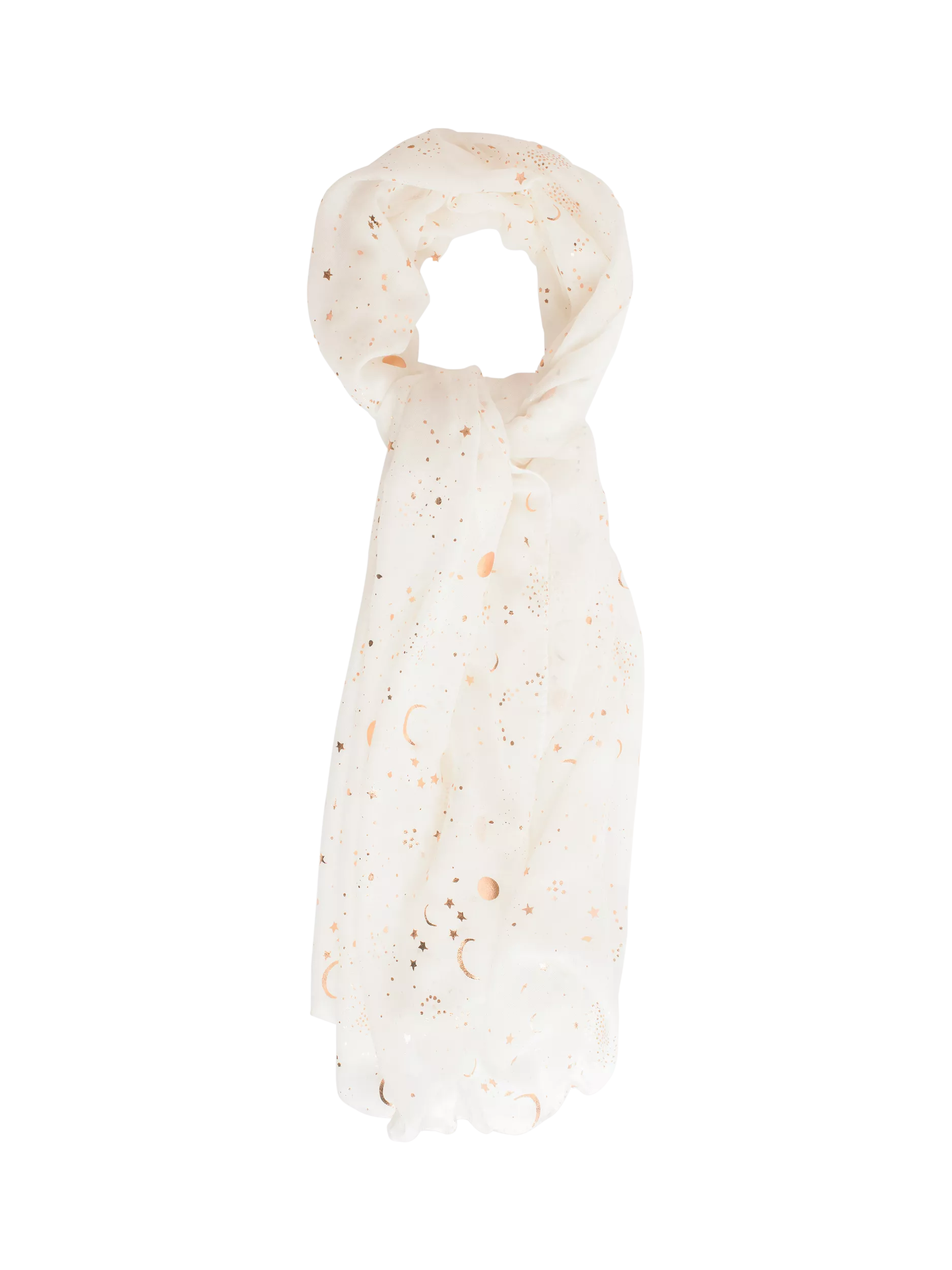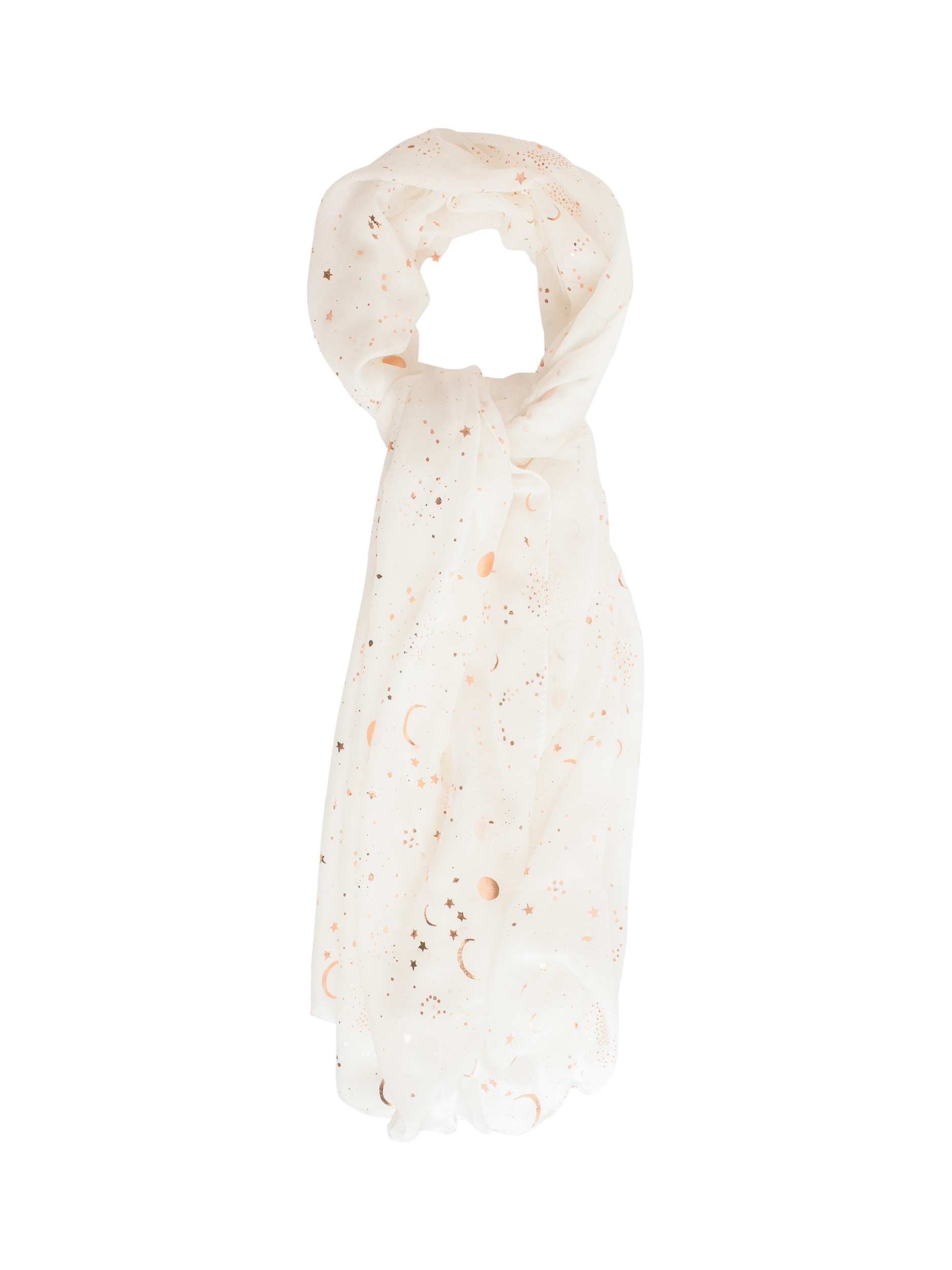 Bring some sparkle to your look with this lightweight scarf with a metallic star and moon print. It is a stylish and versatile accessory to help enhance your everyday or evening look.