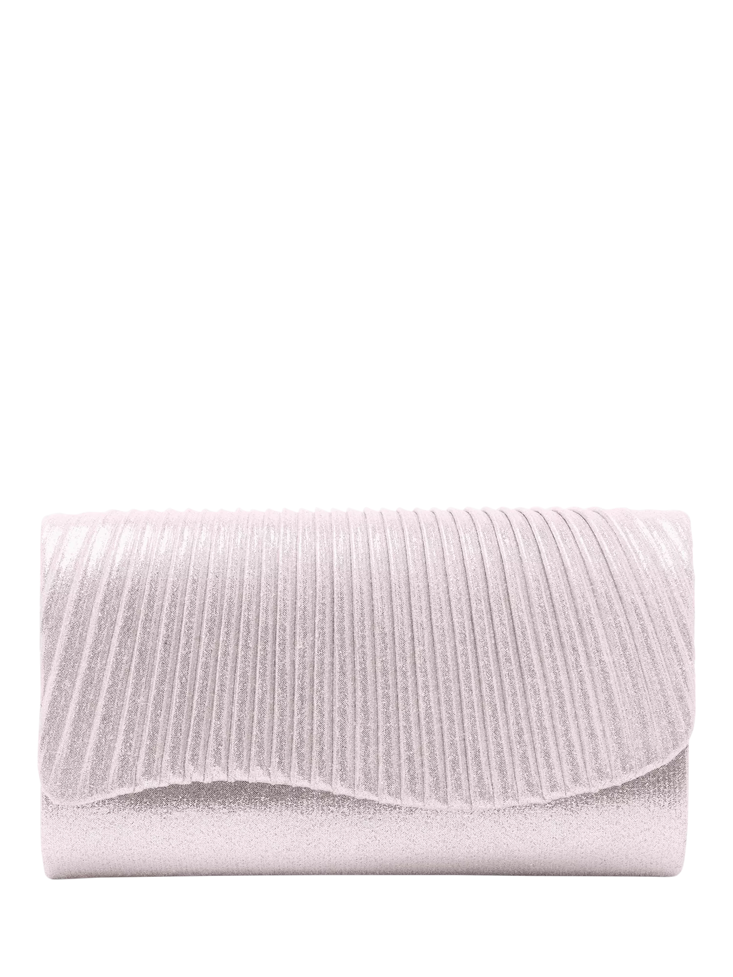 A simple and versatile evening clutch bag with scalloped edge detail. The pleated fold-over closure has a subtle metallic finish and a magnetic closure. An optional delicate shoulder chain allows multi-use.