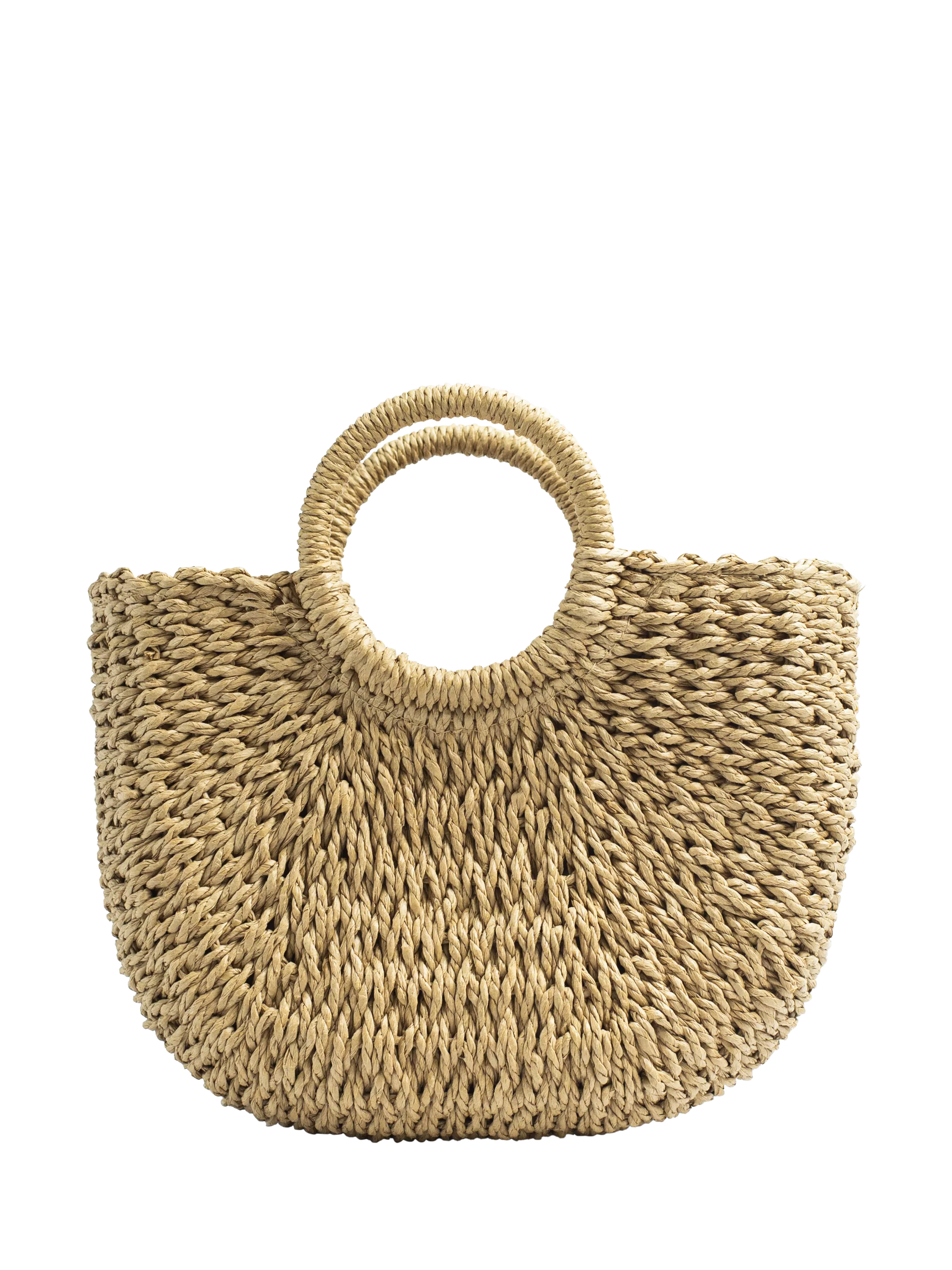 Woven from straw for a summery feel, it fastens at the top with a drawstring closure.