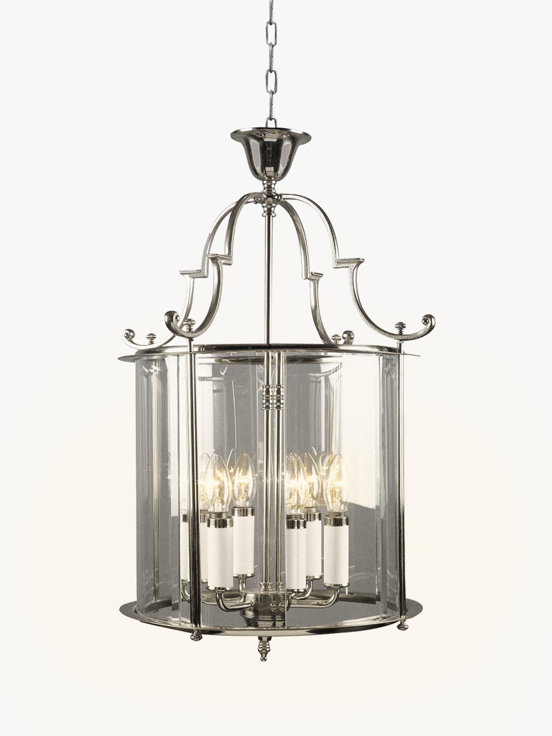 This gorgeous lantern is characterised by a round glass panel feature, enhanced by elaborate designs at its base and top. A polished and chrome effect finish gives it a fabulous look.