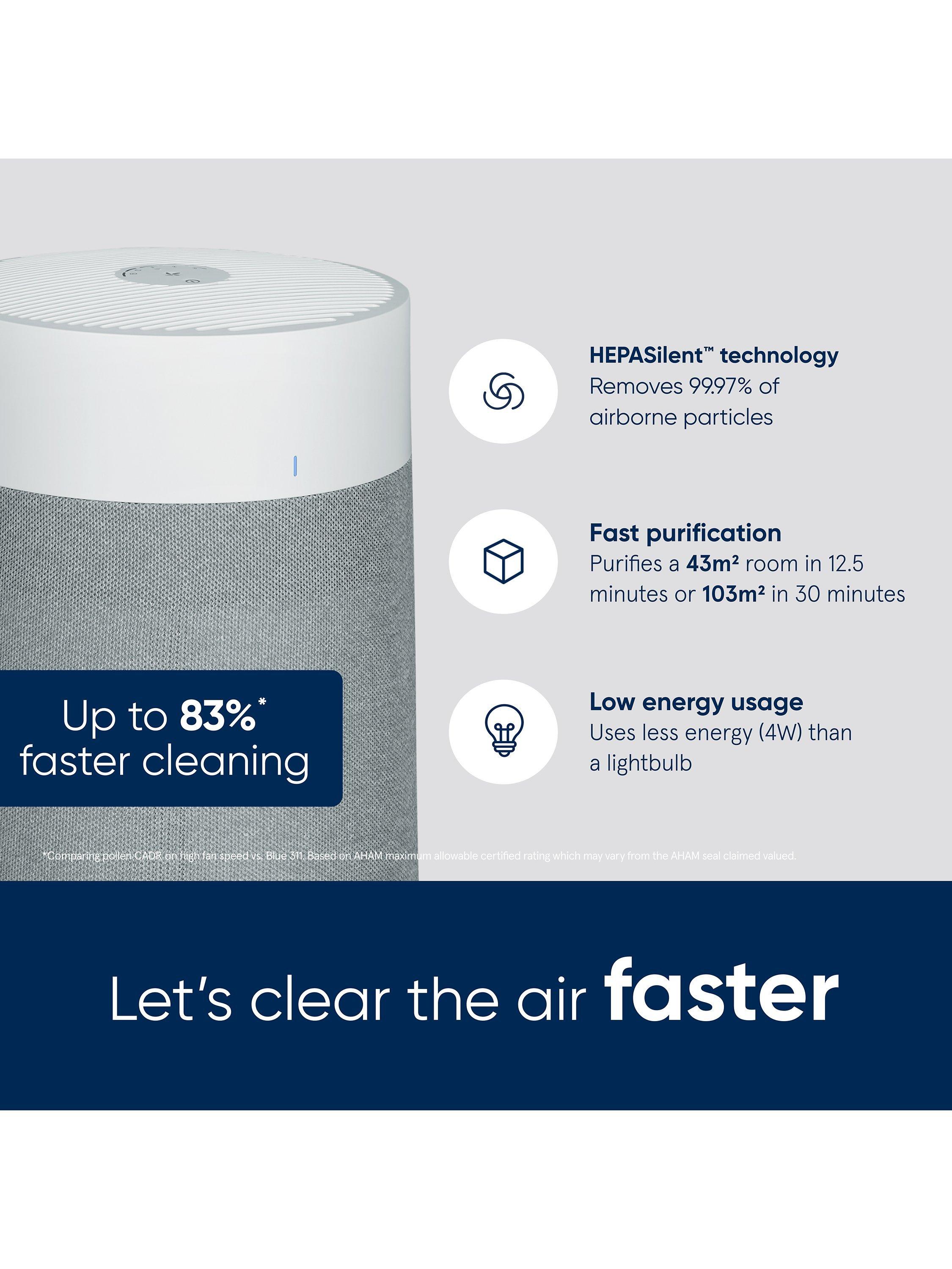 Only Blueair air purifiers use HEPASilent™ dual filtration, delivering more clean air faster¹ and using less noise² and energy than HEPA filtration alone. Purifies up to 103m2 living space in 30 minutes or 43m2 in 12.5 minutes on high.