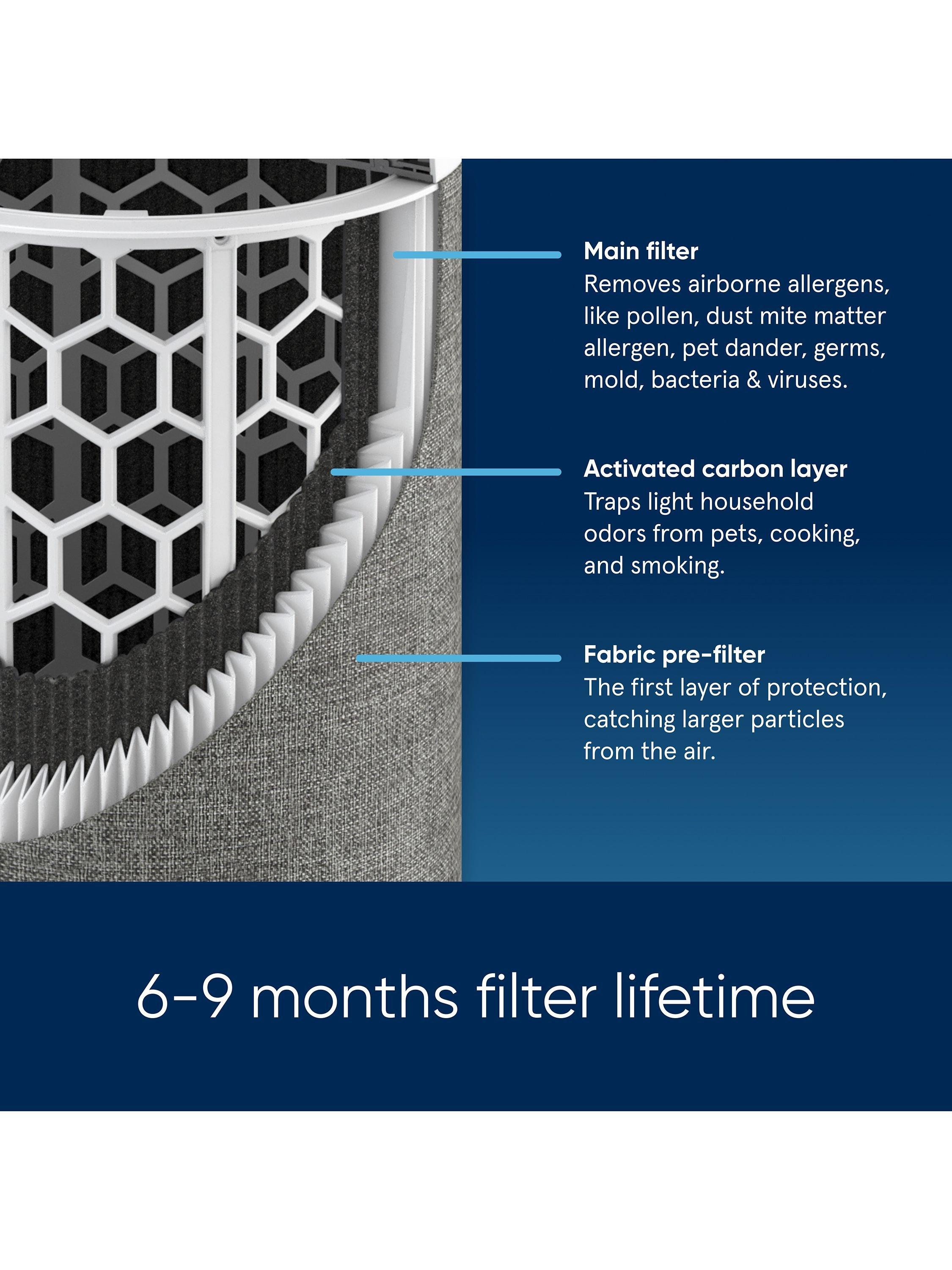Removes at least 99.97% of tiny airborne particles like viruses and smoke down to 0.1 microns, and captures pet dander, pollen, mould and dust. The activated carbon filter traps light household odours from smoking, pets and cooking.³