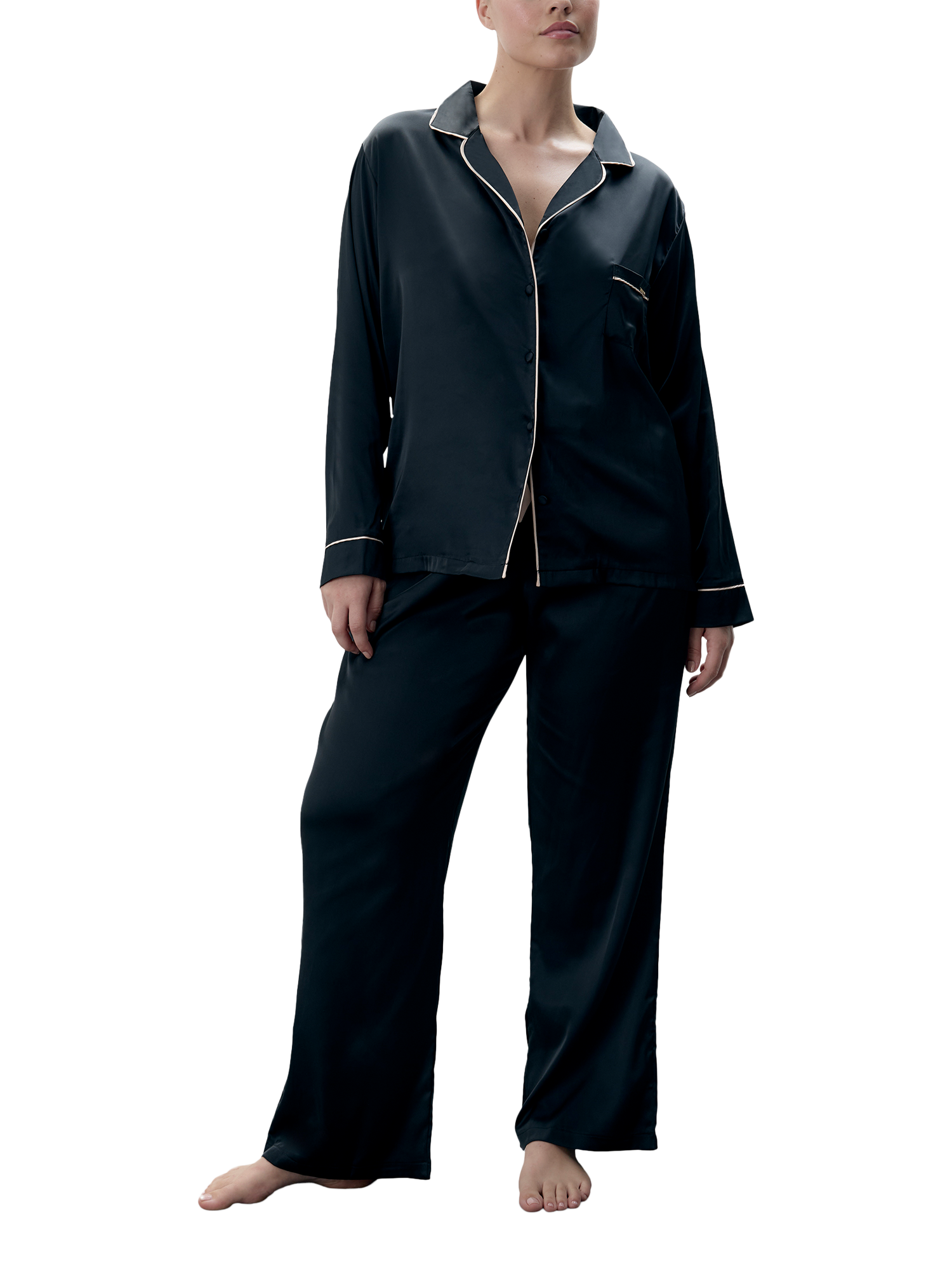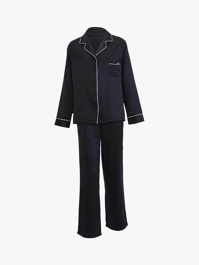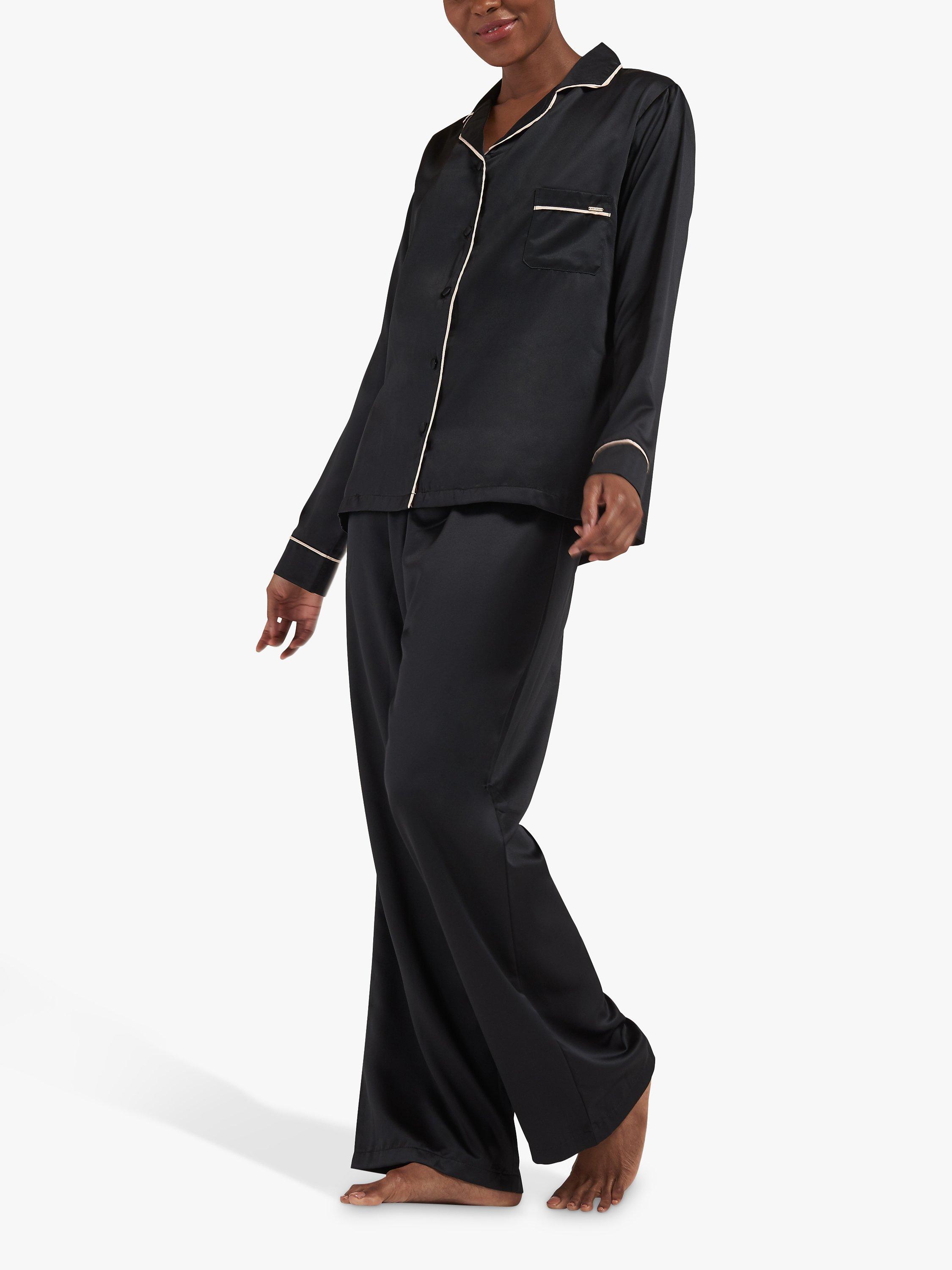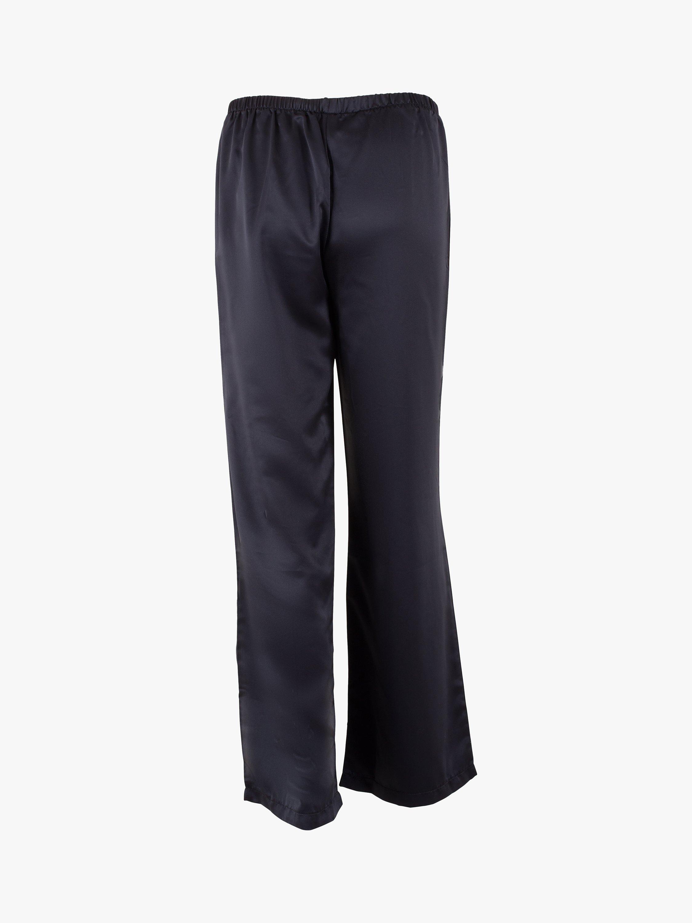 Timeless in style with a nod to the luxury pyjamas worn by Coco Chanel, this set is made from soft satin that sits soft and cool against the skin. The shirt is trimmed with satin piping along the collar, pocket and cuffs, while the trouser is finished with a large black satin bow for a modern take on a classic pyjama look.