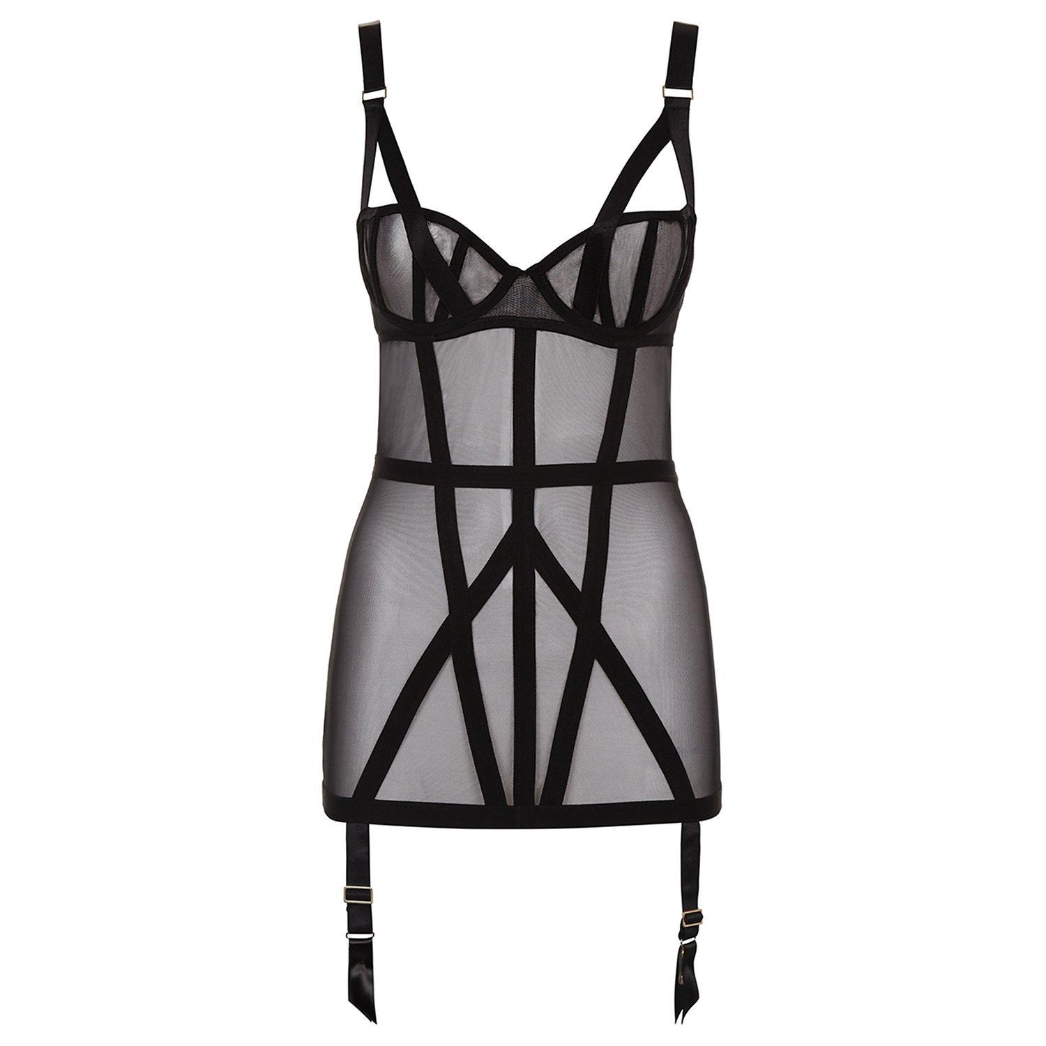 Statement strap detailing runs throughout this sleek mesh body for a captivating look that features an underwired balcony bra with soft, boned cups to sculpt and boost your shape.