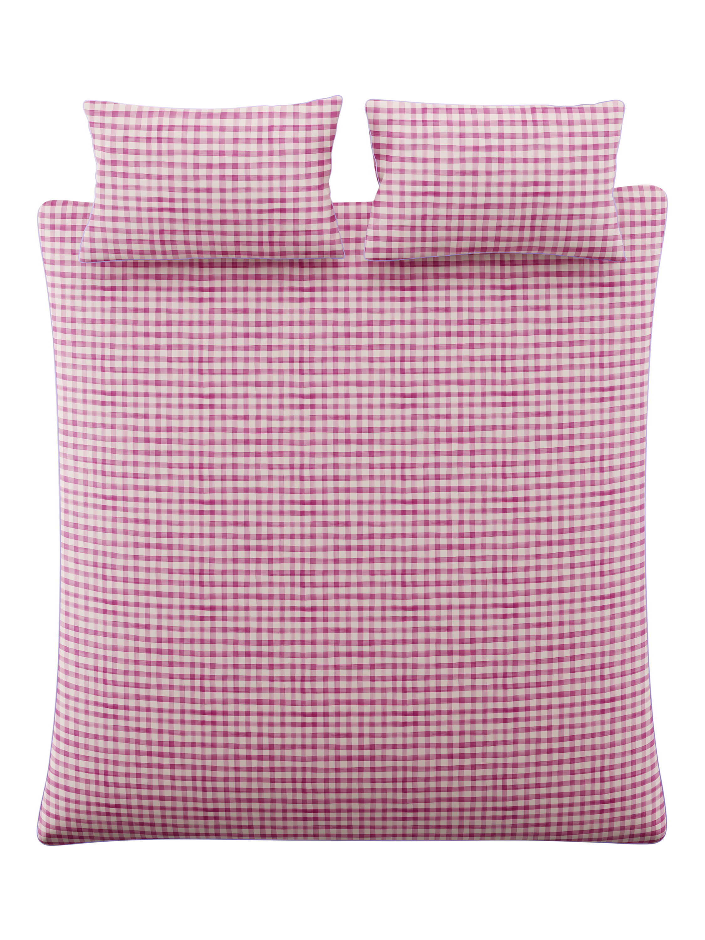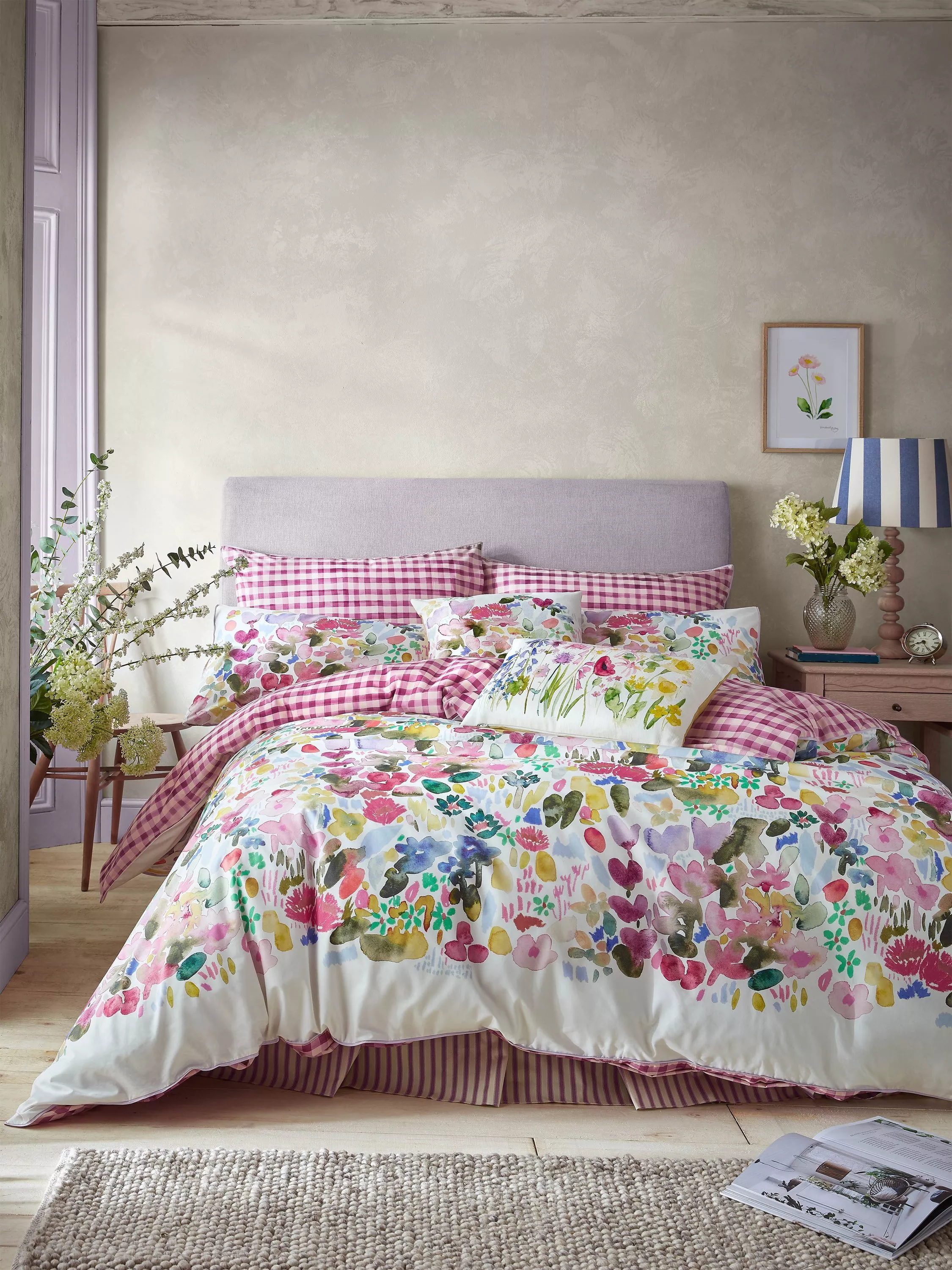 The expressive brushstrokes flow organically across the bedding, creating a soft, artistic statement inspired by nature in full bloom. This inviting palette of a natural white ground with warm pinks, corals, soft blues, and pastel lilac combines perfectly with a rich berry gingham reverse and is finished with a soft lilac piped edge.