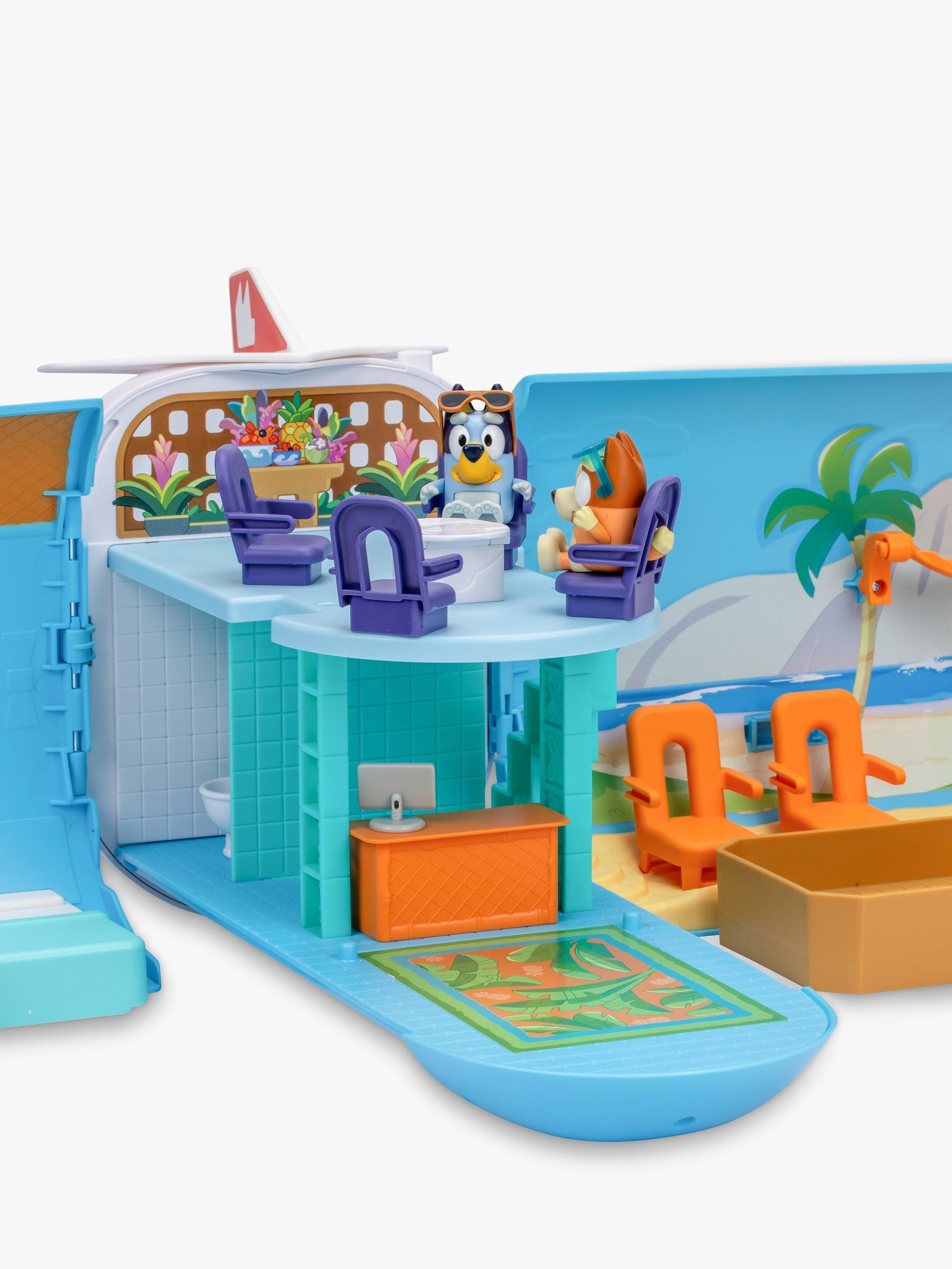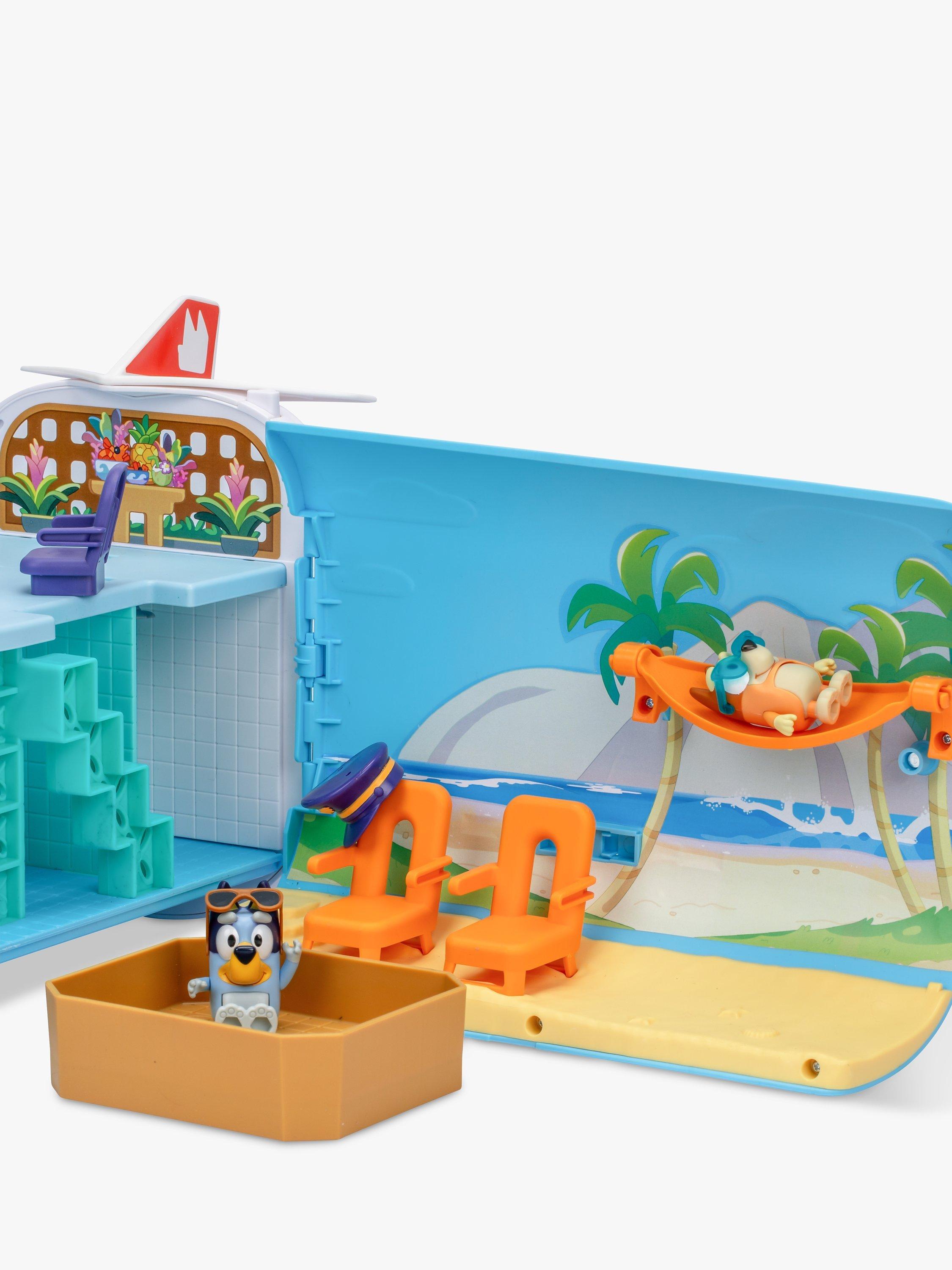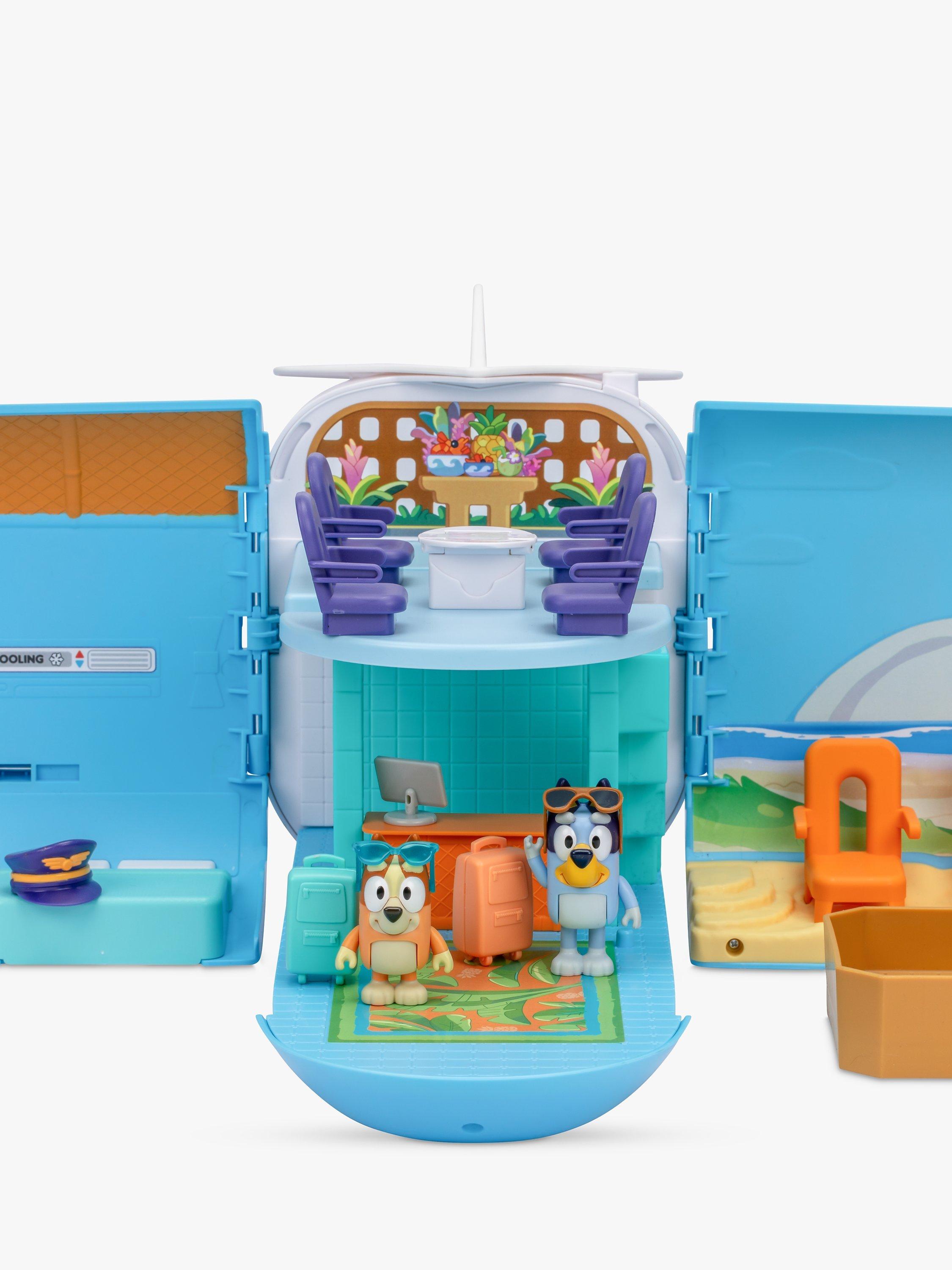 The Bluey 3-in-1 Transforming Plane Playset easily transforms from a plane into a resort and a boat. It comes with two exclusive figures: Bluey in her pilot's hat and sunglasses, and Bingo with her sunnies on. Plus, 15 play pieces so you can play out the best vacation ever!