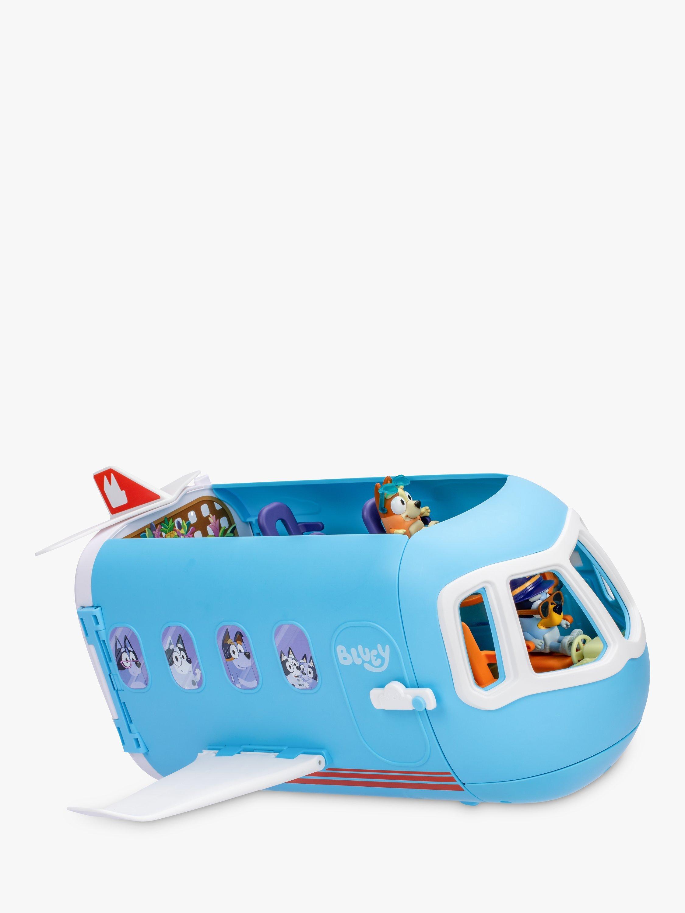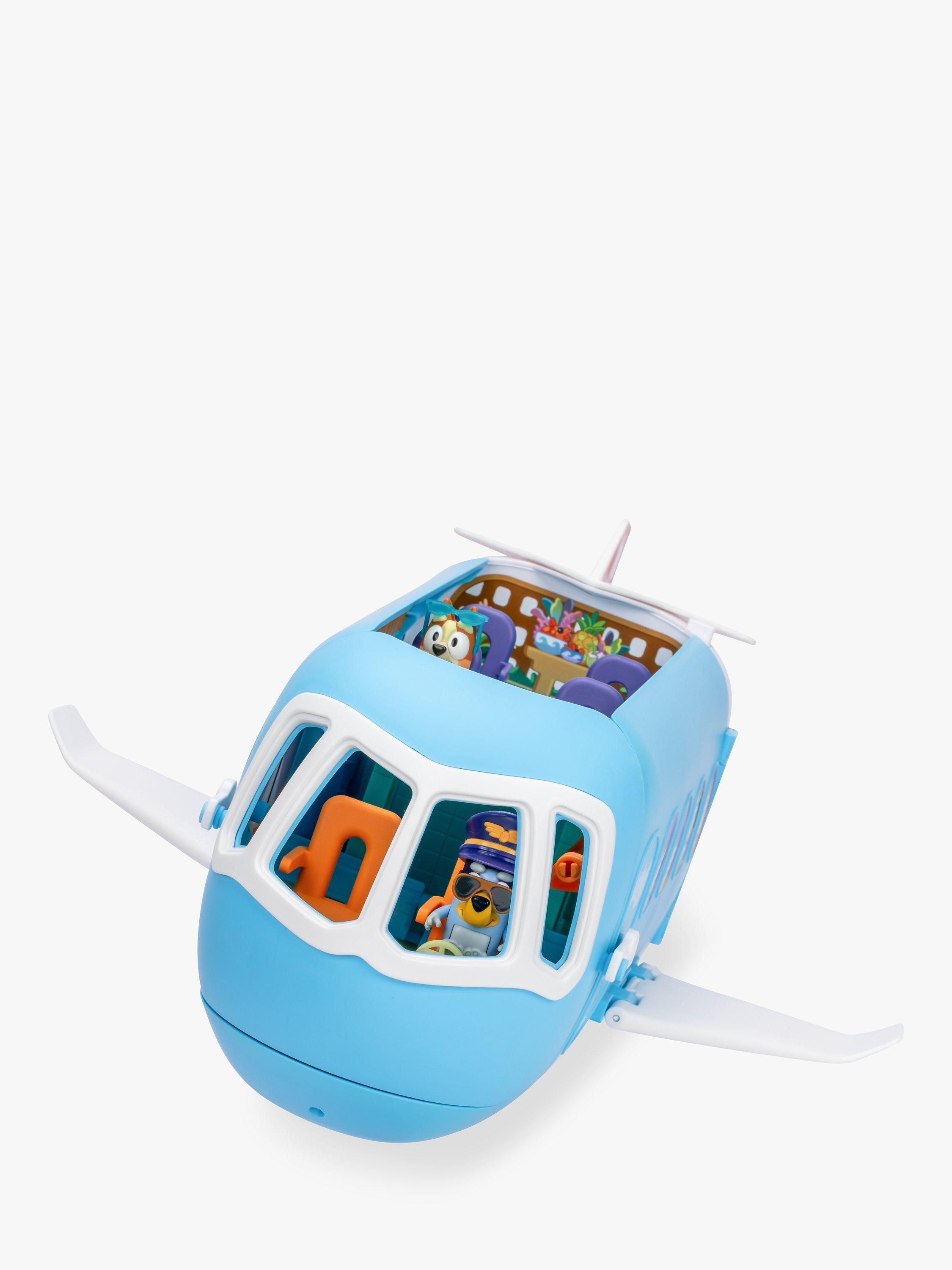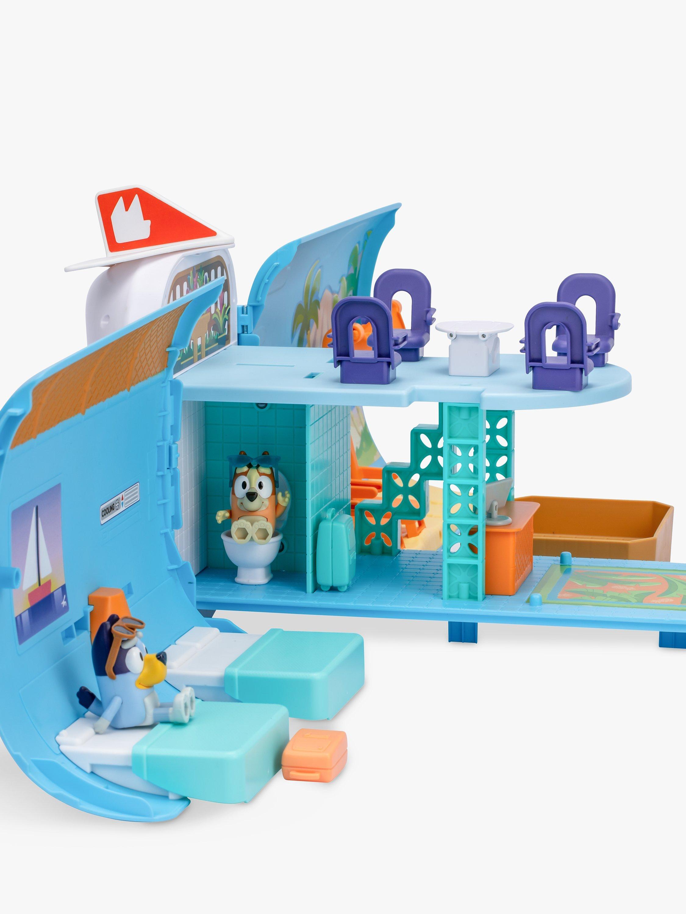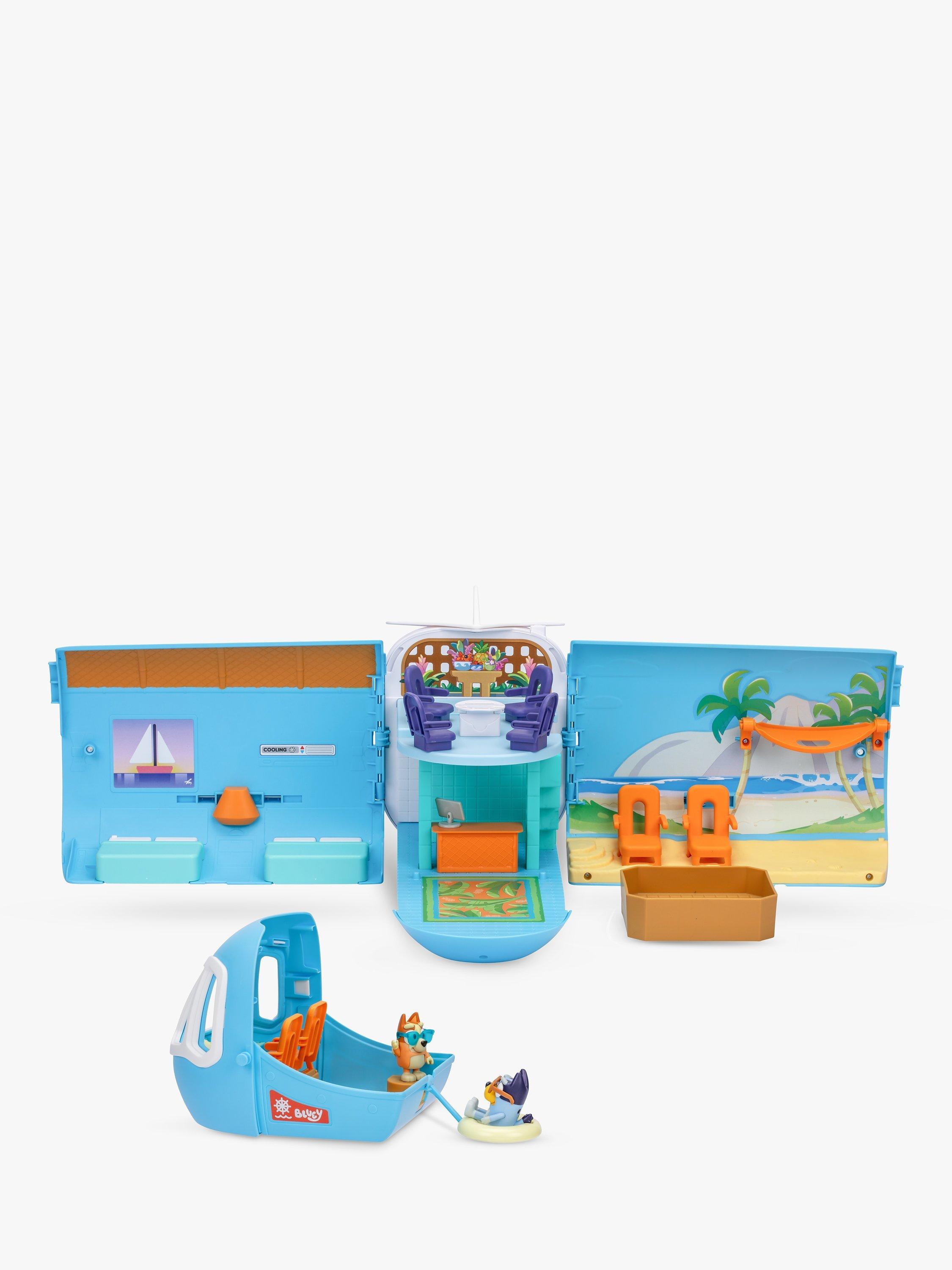 The Bluey 3-in-1 Transforming Plane Playset easily transforms from a plane into a resort and a boat. It comes with two exclusive figures: Bluey in her pilot's hat and sunglasses, and Bingo with her sunnies on. Plus, 15 play pieces so you can play out the best vacation ever!
