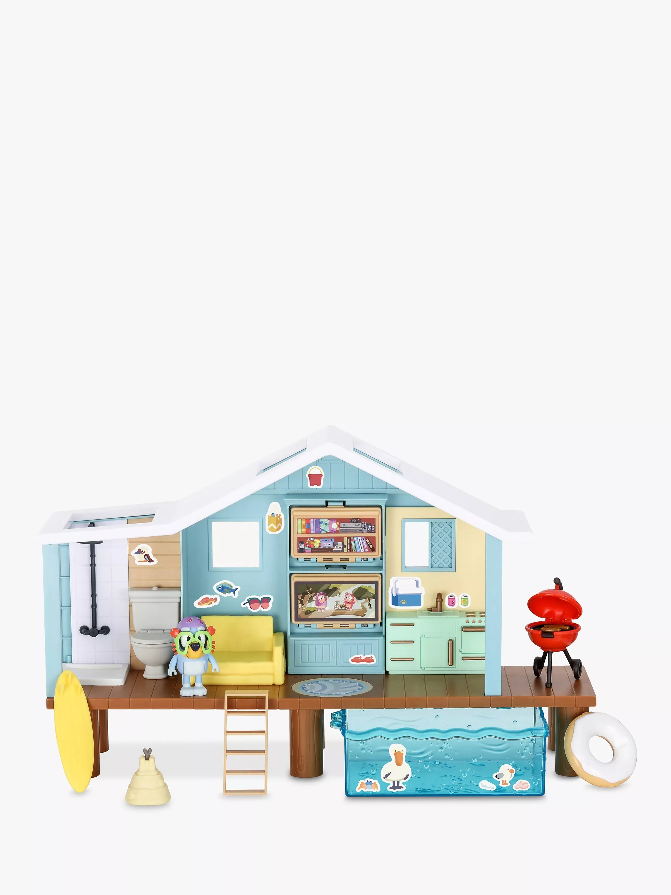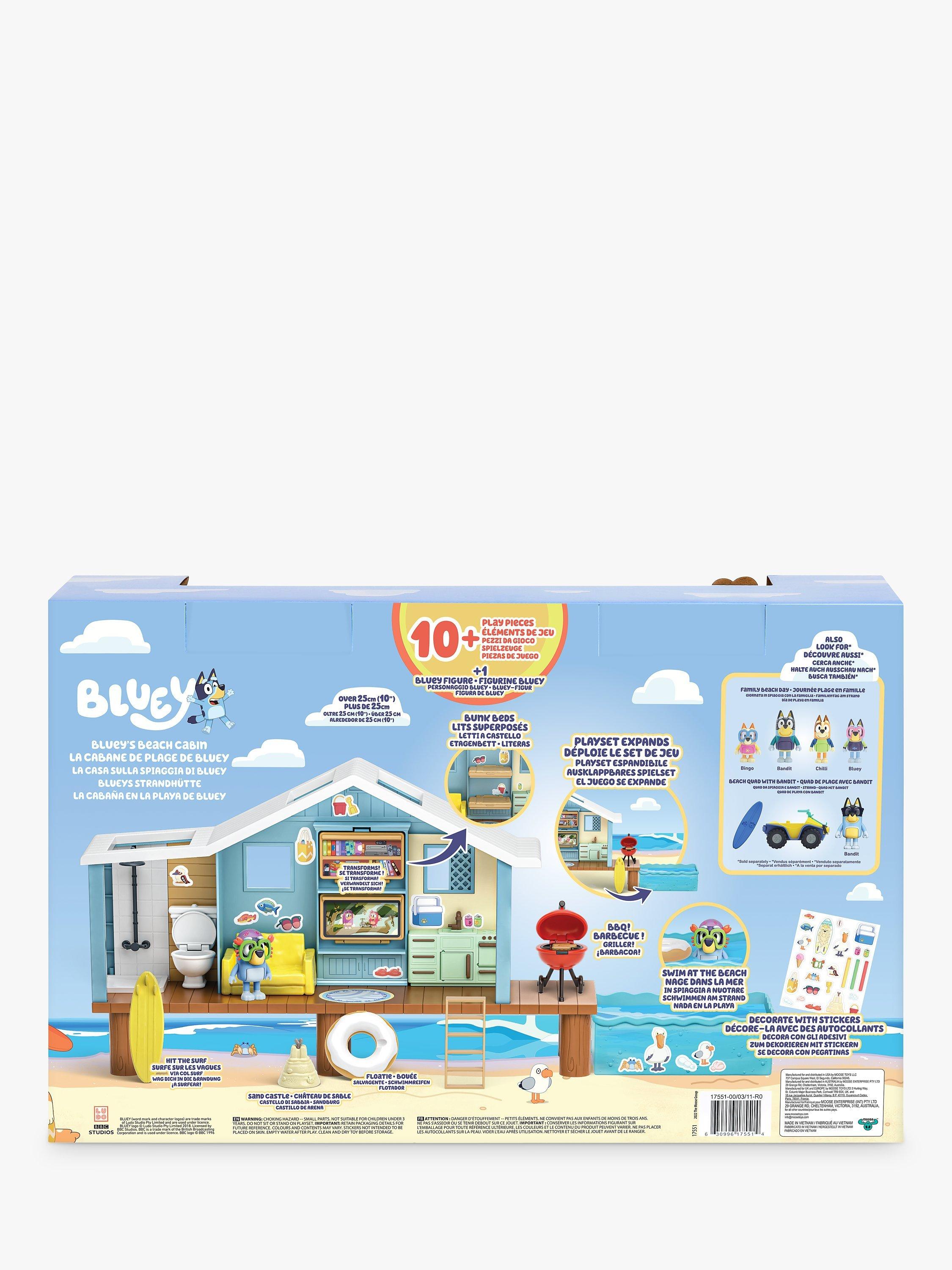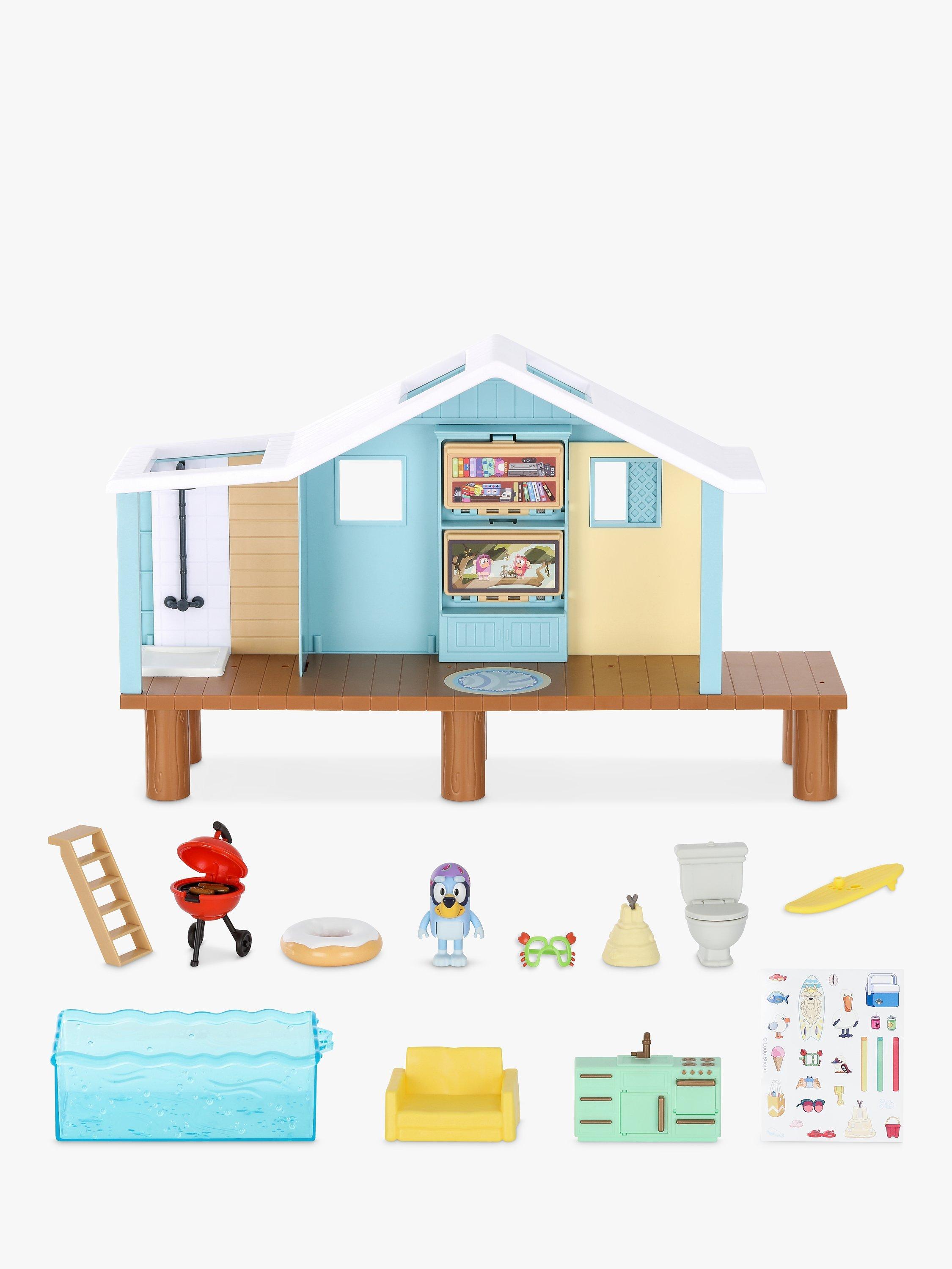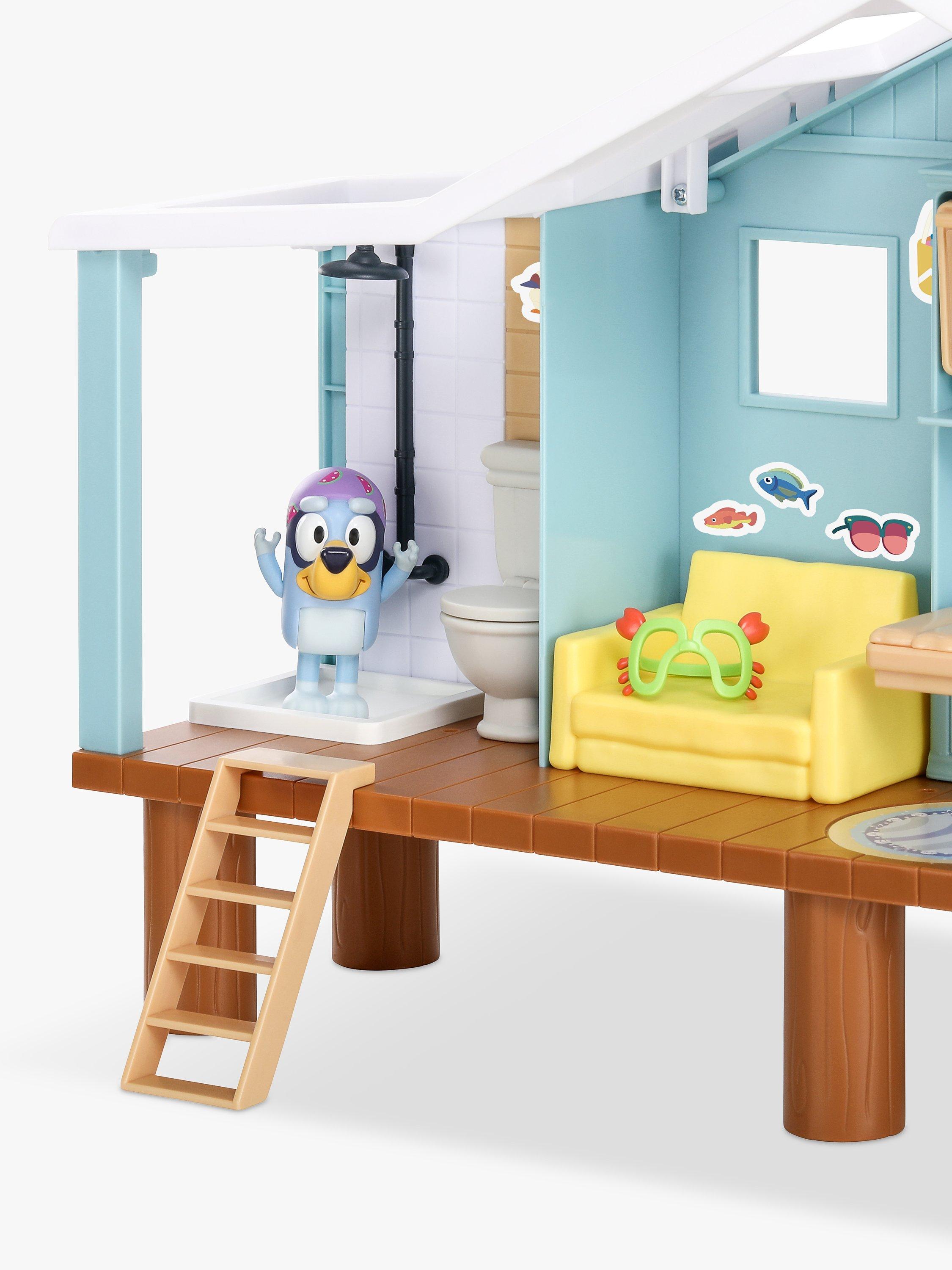 Bluey's Beach Cabin playset is loaded with fun features to make it a holiday to remember and comes with everything Bluey and her family need to relax and play as well as a beach-themed sticker sheet to customize it with.