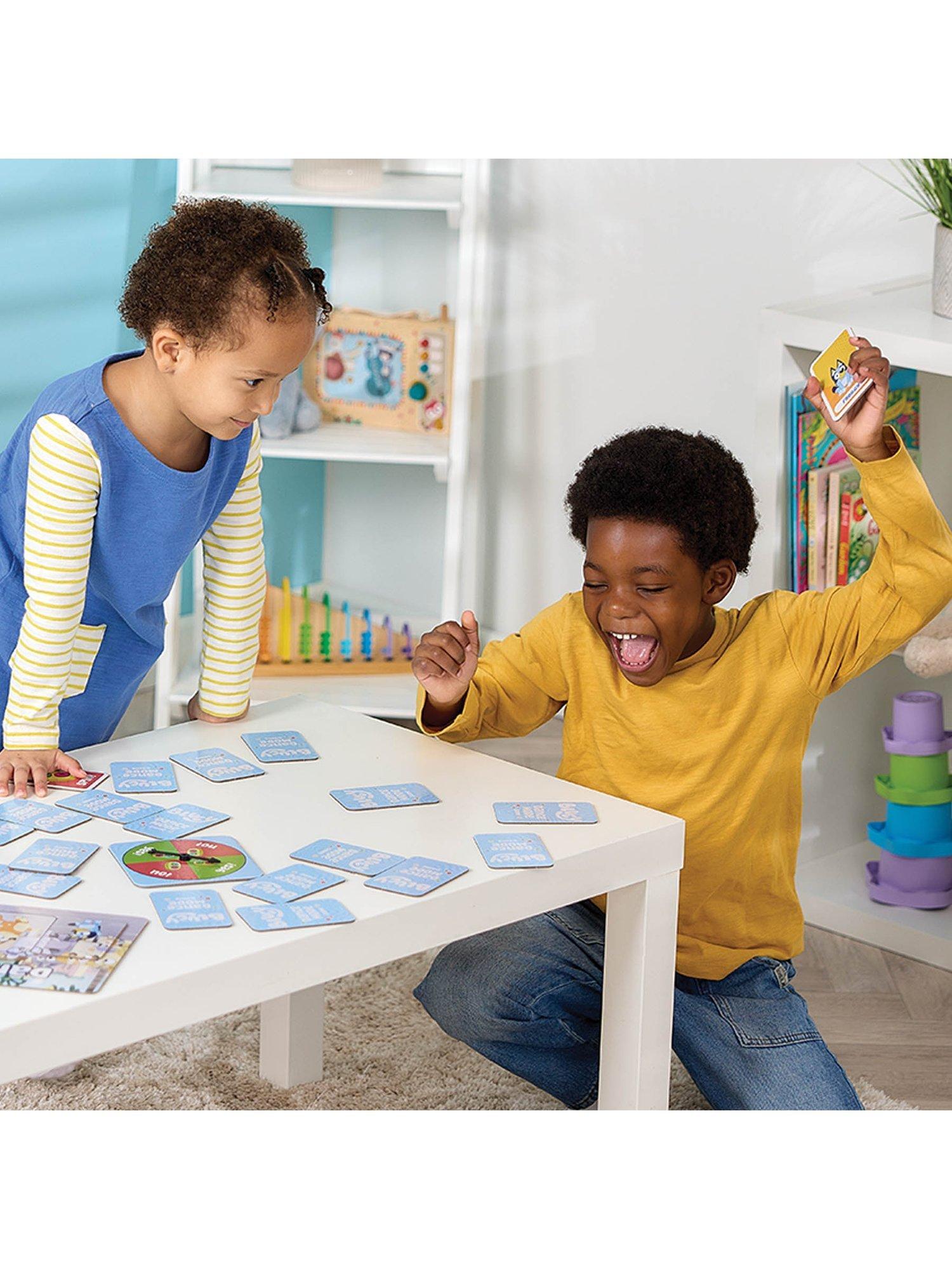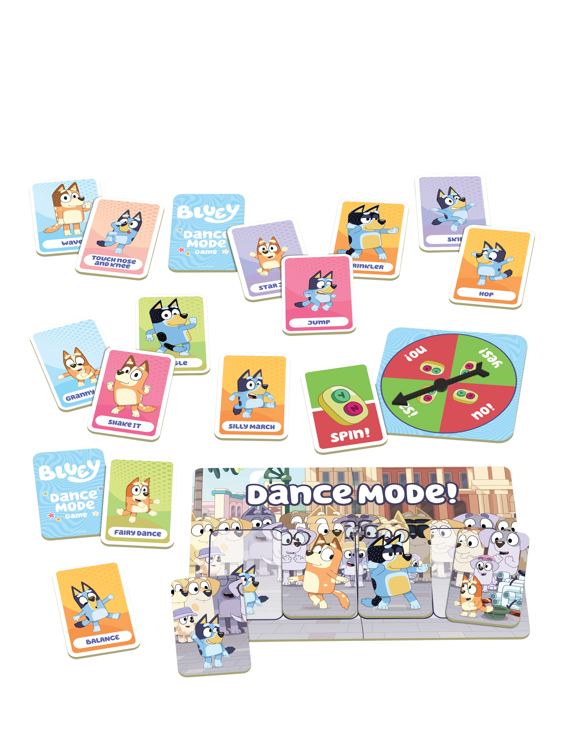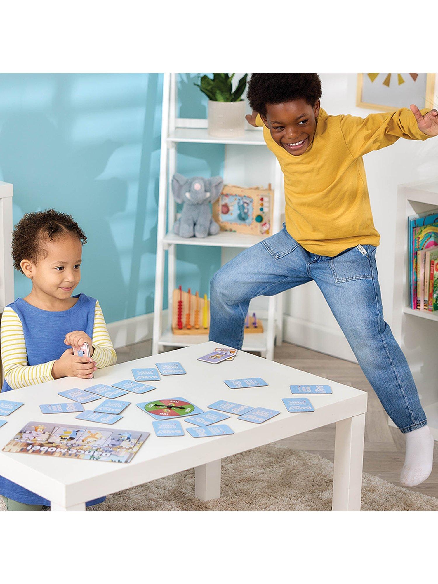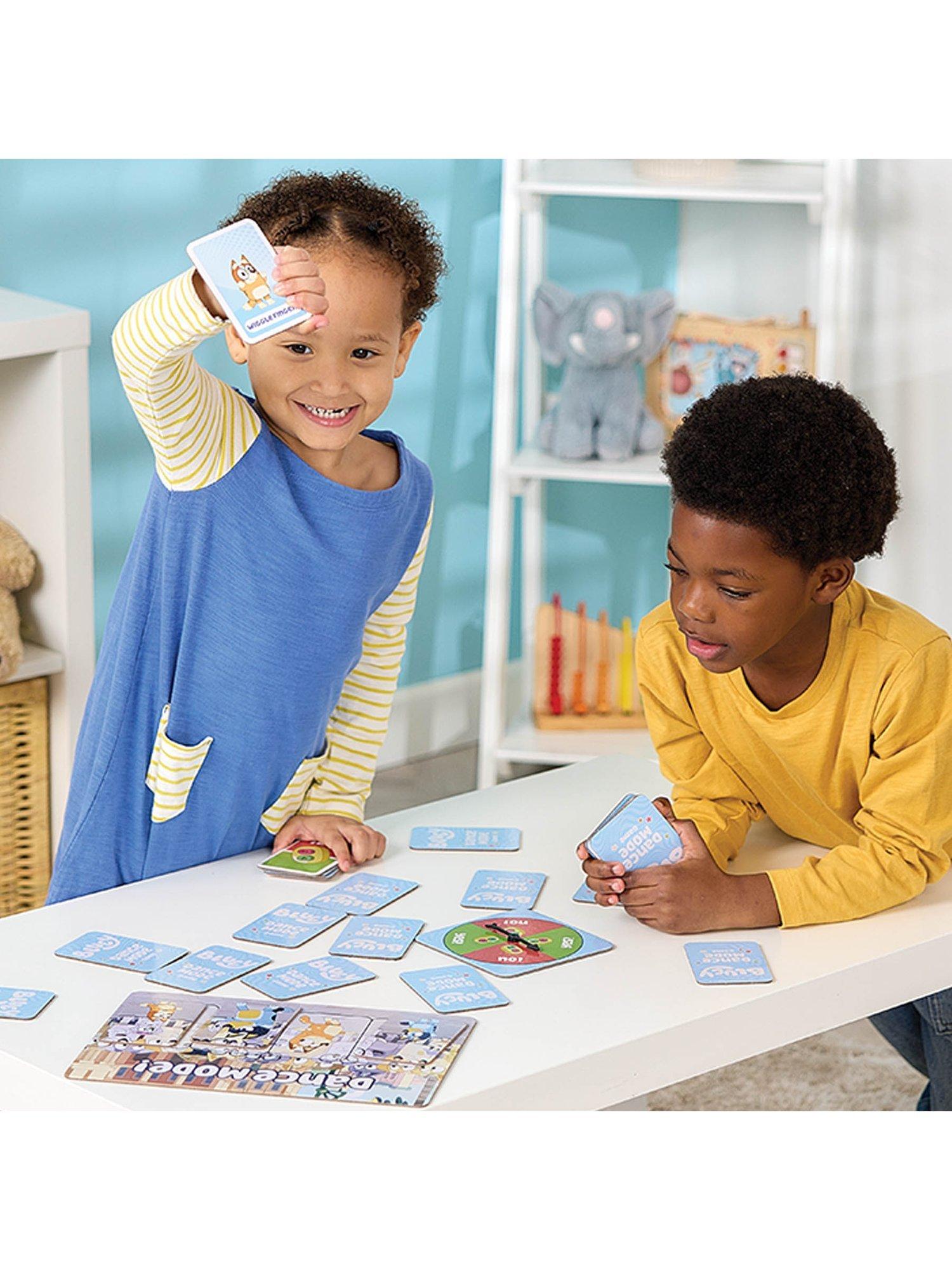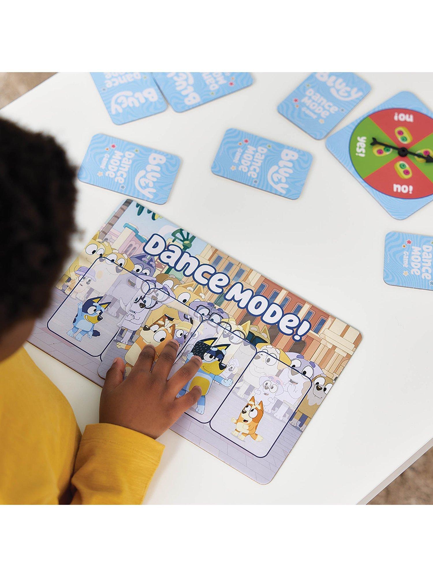 Get ready to get moving with the Bluey Dance Mode game! This fun, easy-to-learn card game gets everyone wiggling, spinning, marching and dancing along with Bluey, Bingo, Mum and Dad. Flip cards to act out actions, spin the spinner for surprises, and draw Dance Mode cards to get everyone dancing together. Complete the Dance Mode board, collect the most cards, and win a big round of applause!