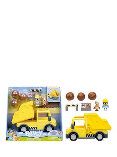 Go on an adventure with Bluey and Bingo and get some work done with Bluey's Dump Truck! Bluey has her hard-hat on and Bingo has been having some fun in the mud. These exclusive figures are articulated so they can sit in the cabin of the Dump Truck! Load and unload 3 big rocks by moving the lever on the side of the truck to make the built-in bed tilt up and down.
