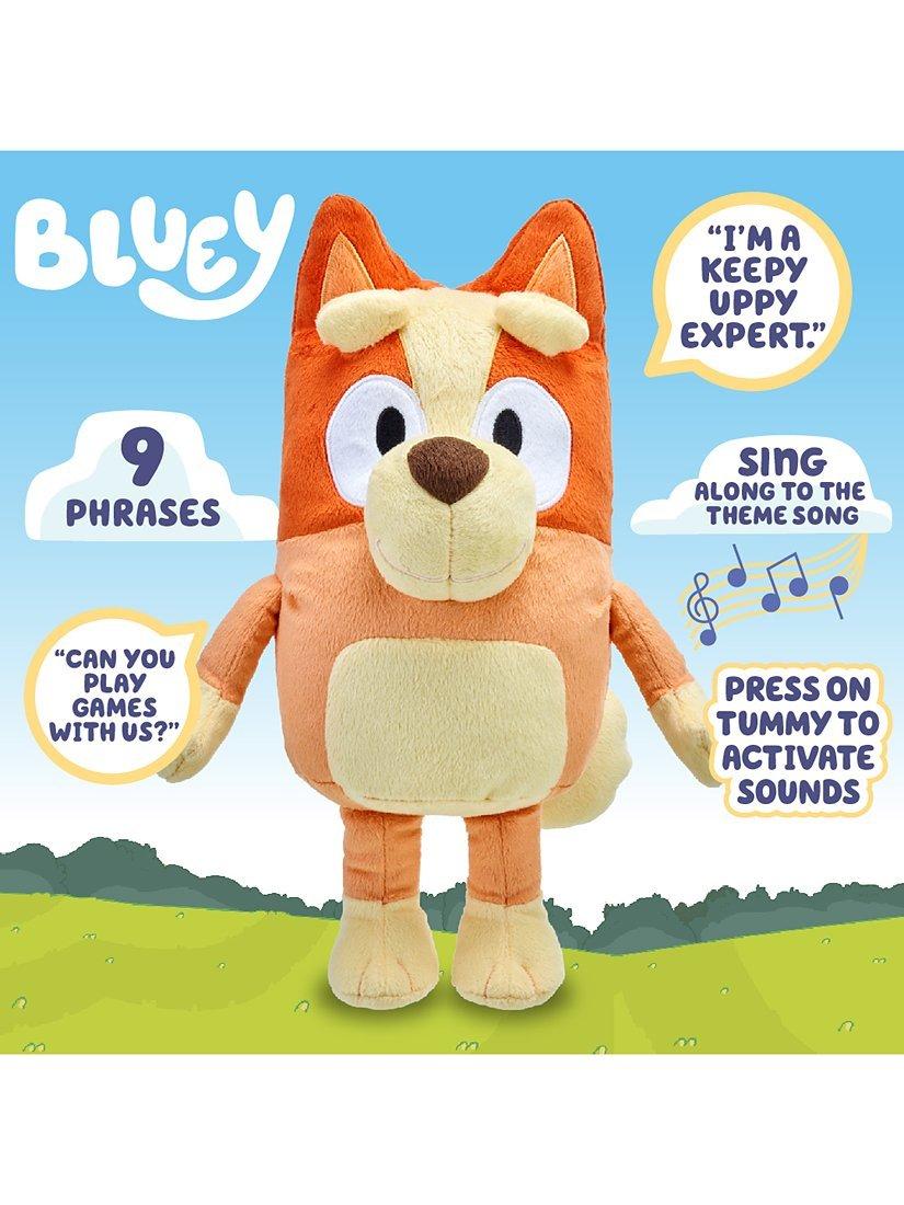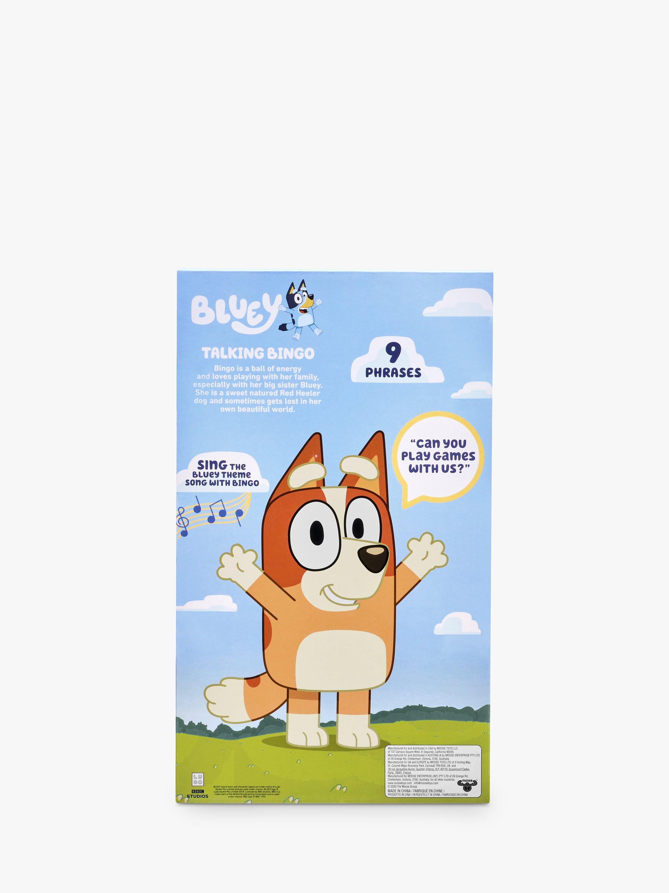 Bingo is a ball of energy and loves playing with her family, especially with her big sister Bluey. Press Bingo's tummy to hear 9 fun phrases from the Bluey TV show. You can even sing along with Bingo to the Bluey theme song
