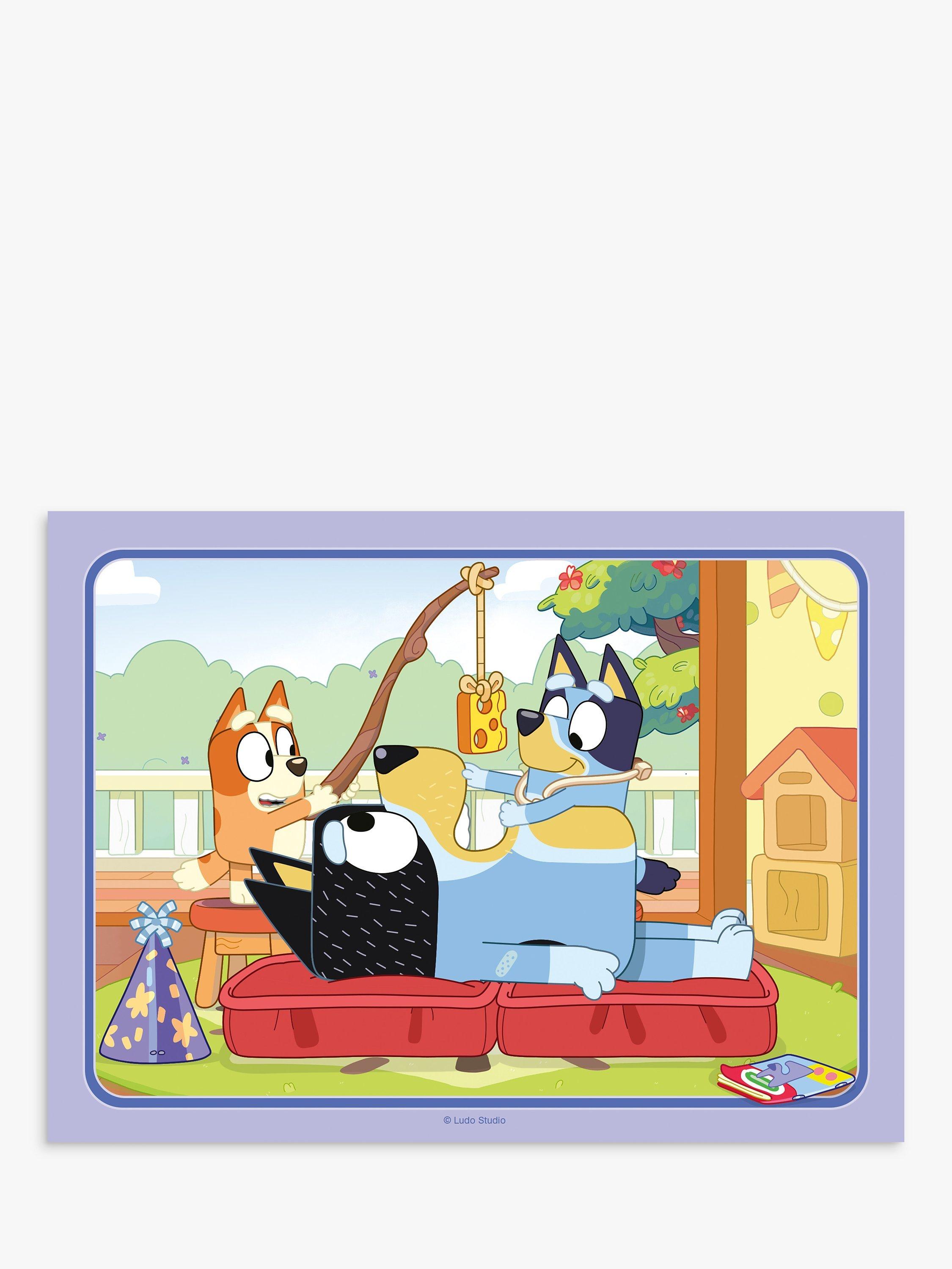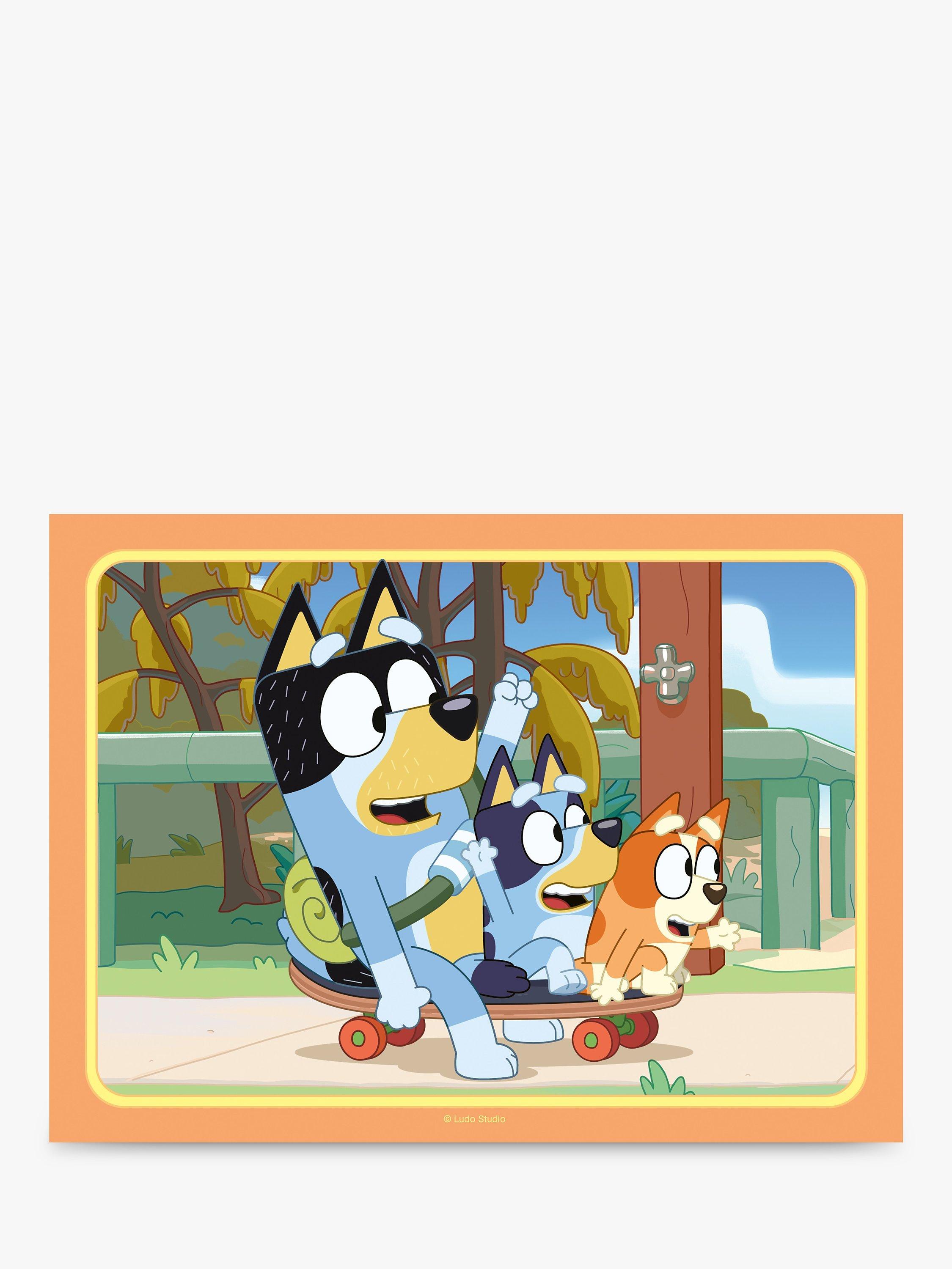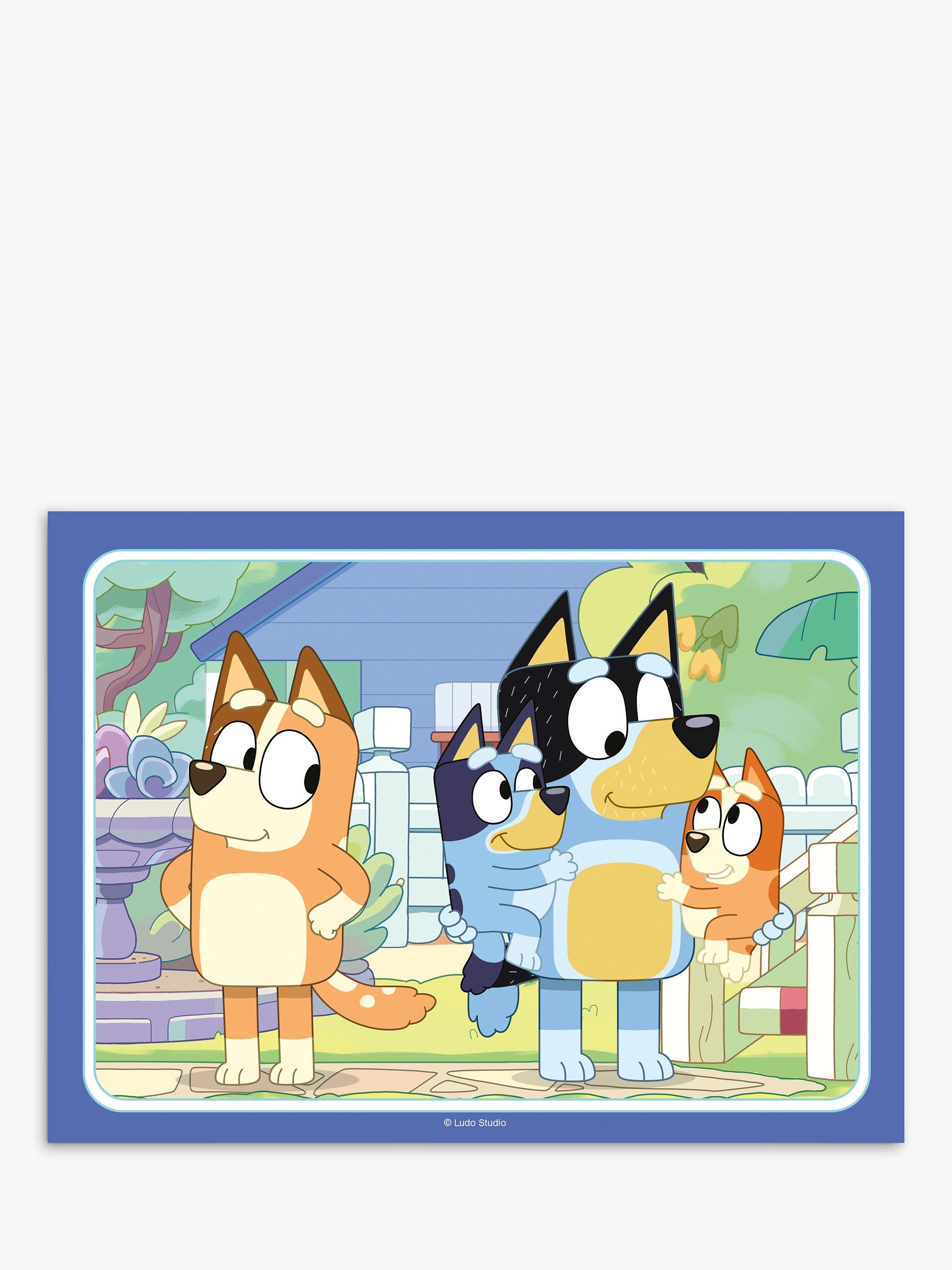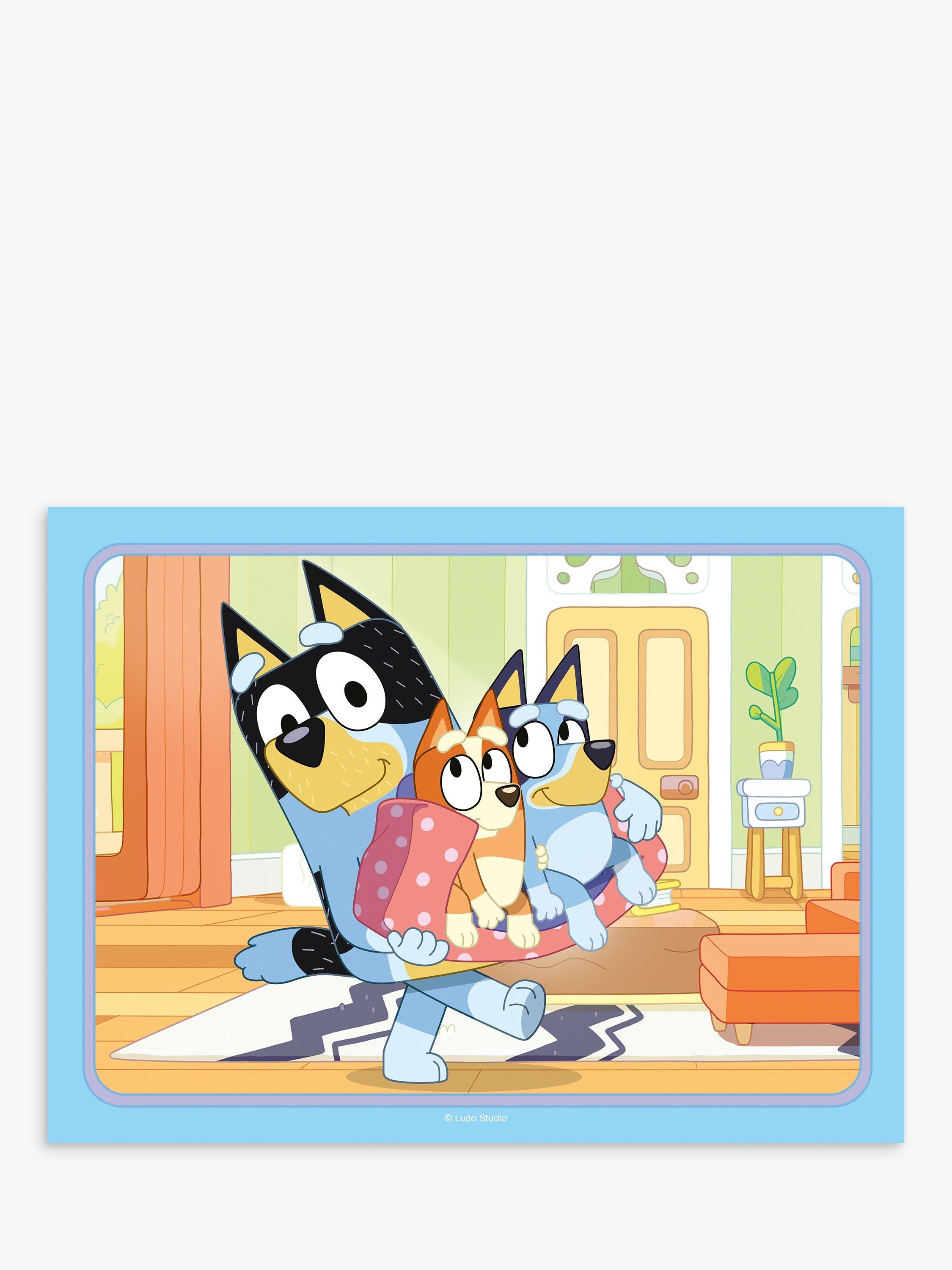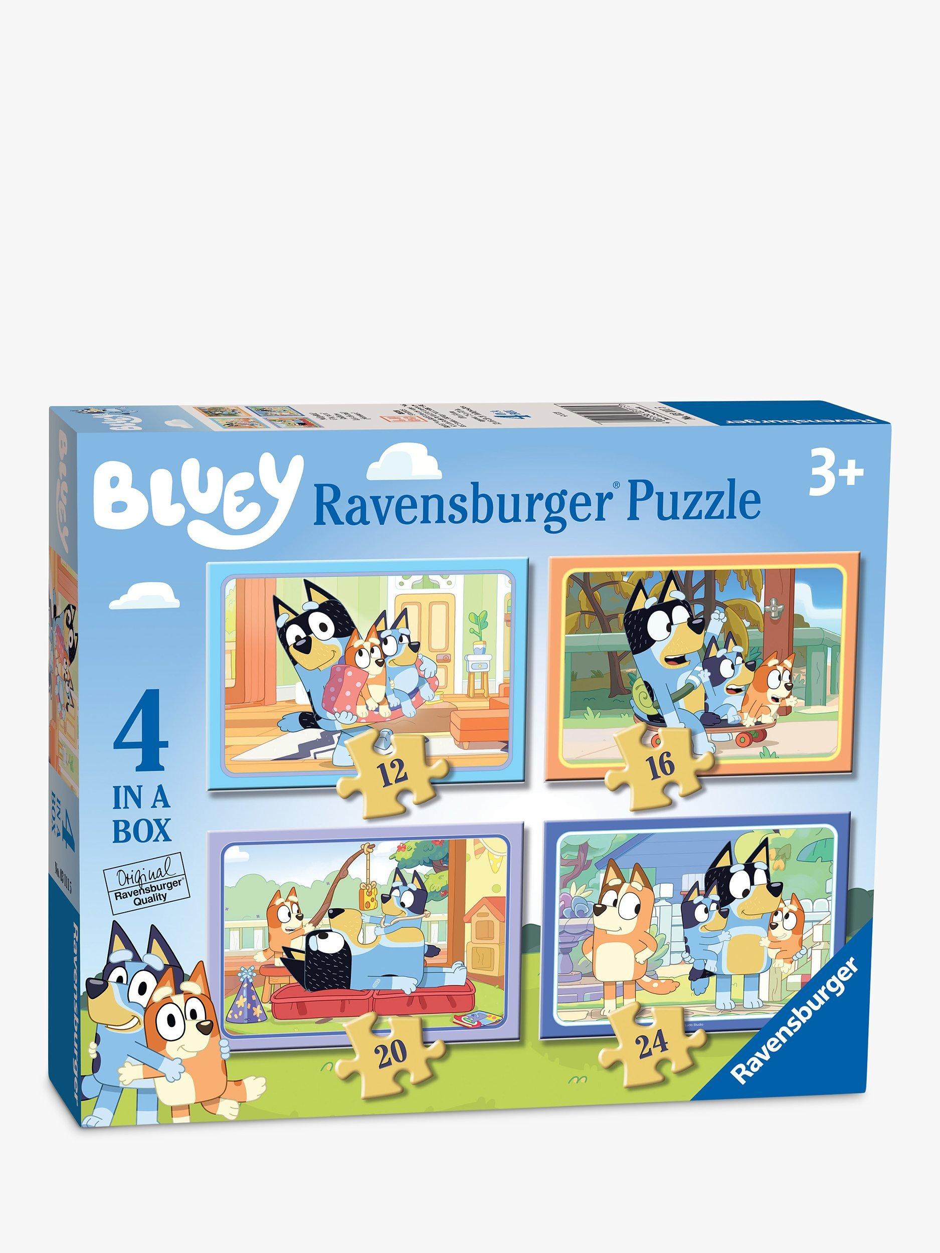 Four puzzle scenes packed full of different adventures featuring Bluey, Bingo, Mum and Dad. These bright and colourful puzzles illustrate Bluey’s energy and lovable spirt. These 4 in a box kids puzzles are crafted with premium quality materials and measure 19 x 14cm when complete. Great puzzles for Children 3 years old and up. Fully complies with all necessary UK and EU testing standards. This product is made of FSC®-certified and other controlled material.